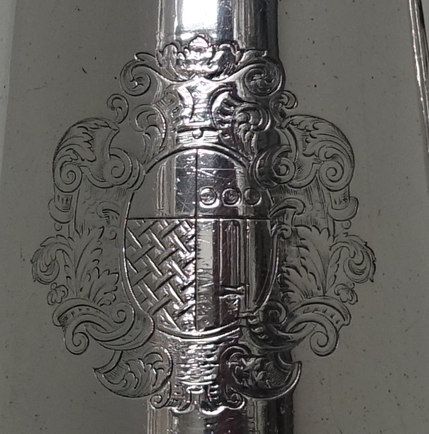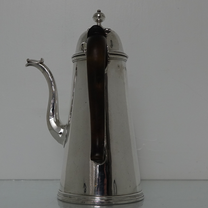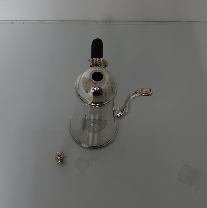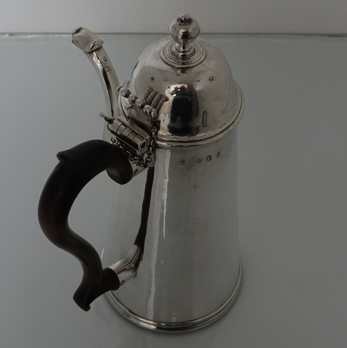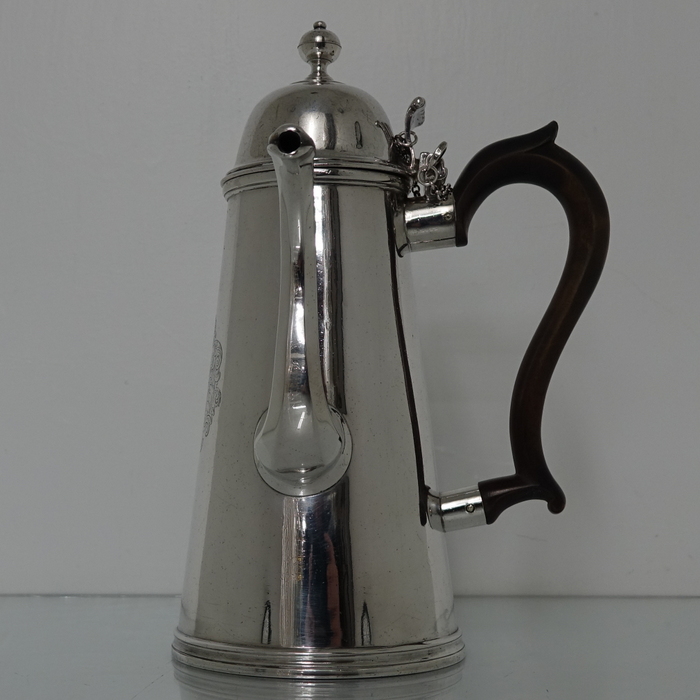 A very rare and extremely beautiful Britannia standard tapering plain formed early 18th century chocolate pot. Â The body of the chocolate pot has a very noble looking coat of arms for importance. Â The lid of the pot is hinged with a detachable cover, pin and chain. Â The lid has a ornate thumb piece and a removable finial. Â The handle is scroll in design and made of fruit wood.