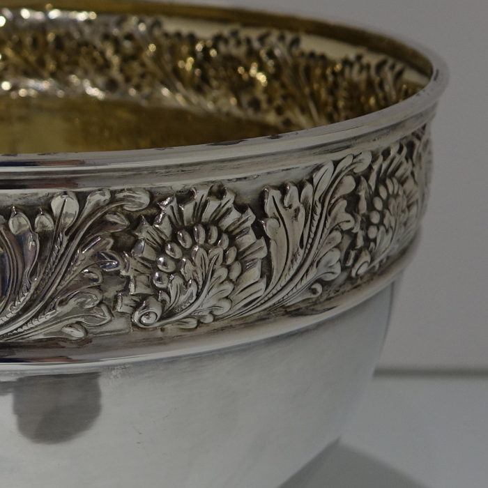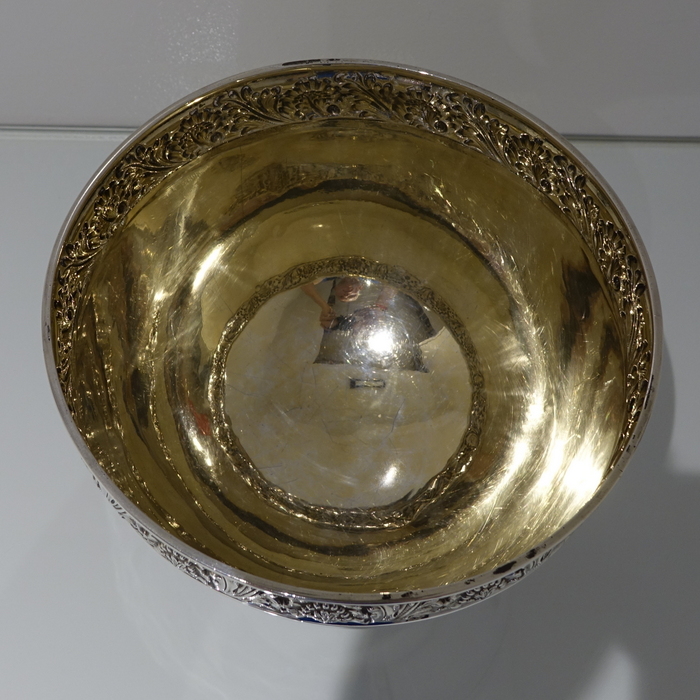A stylish mid sized circular Victorian rose bowl on raised pedestal foot. Â The upper section has an ornate band of foliage and floral embossing for highlights. Â The inside has been gilded.