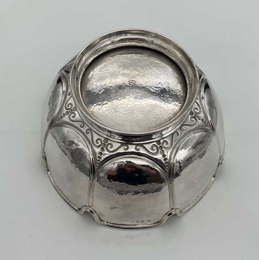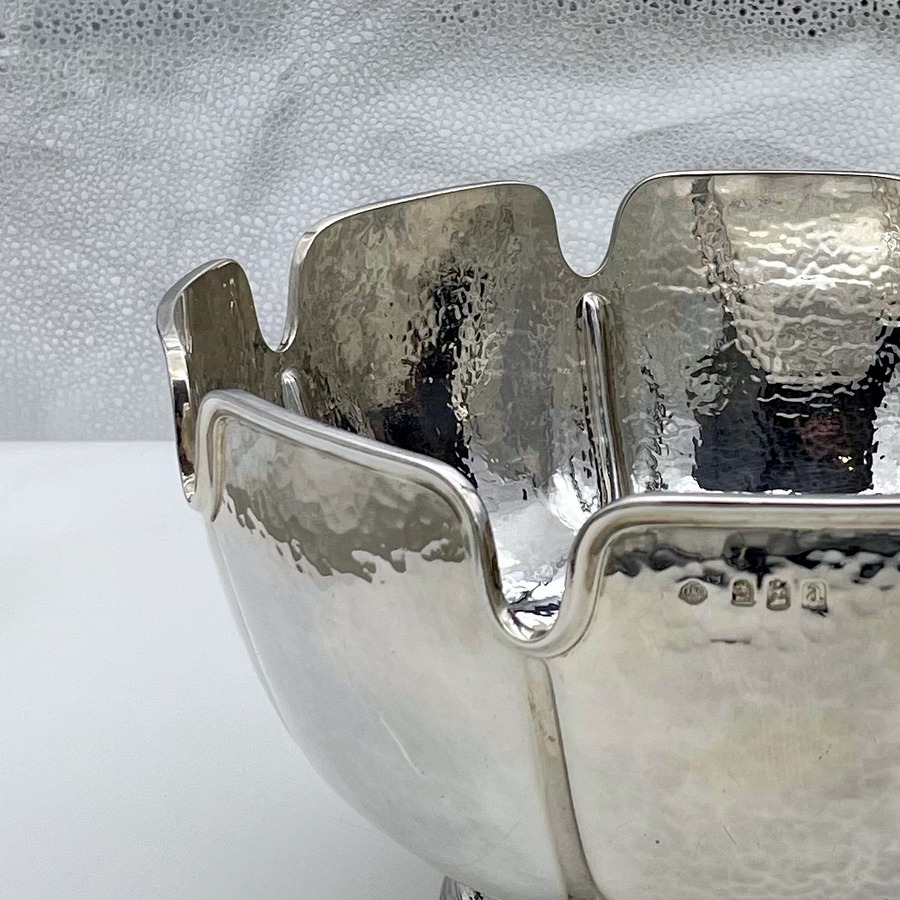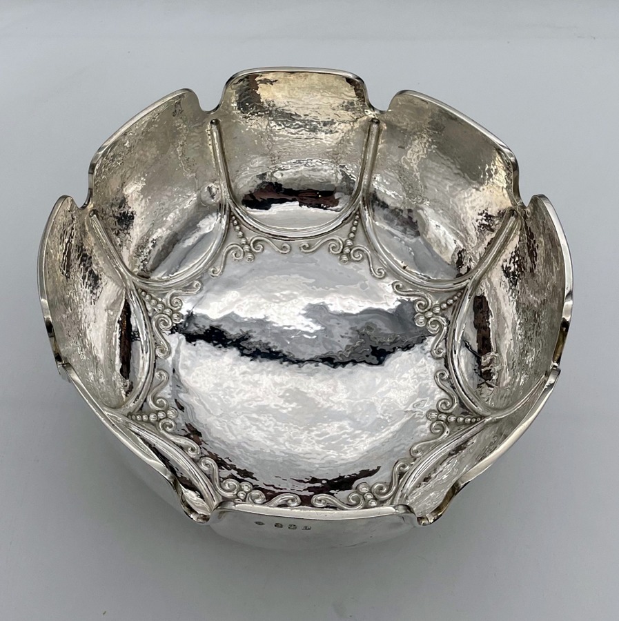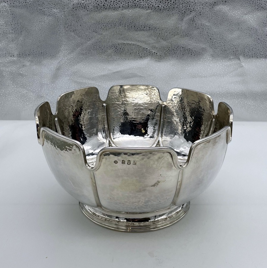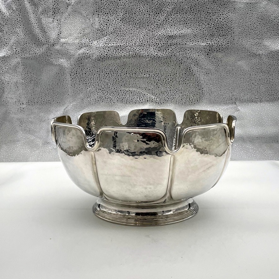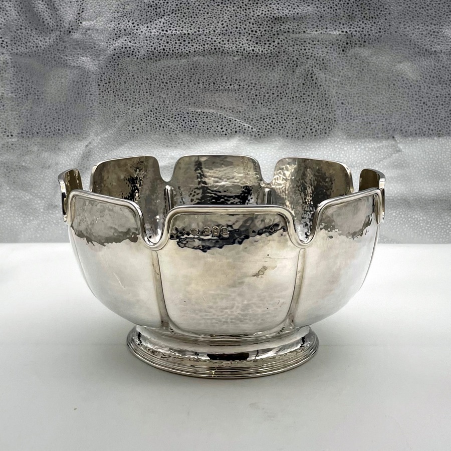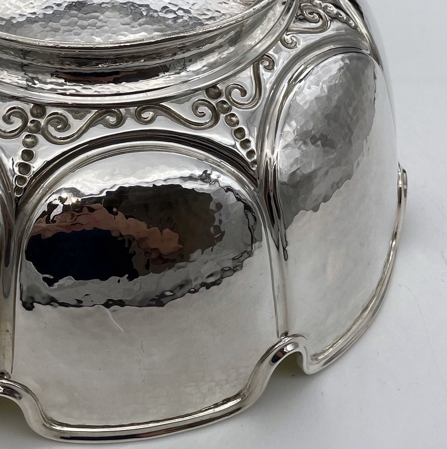 A truly stylish late Victorian Britannia silver Monteith bowl designed elegant shield like panelled walls which have a wonderful hammered finish and a strikingly beautiful inner punched out lower scroll and bead gallery decoration.