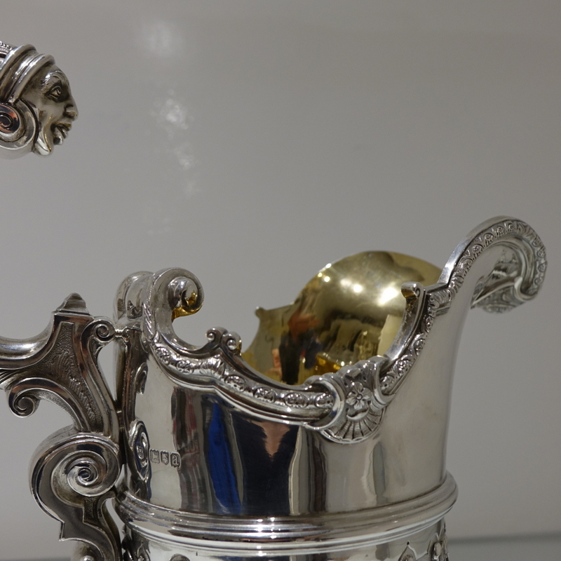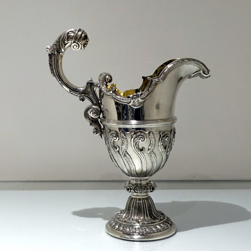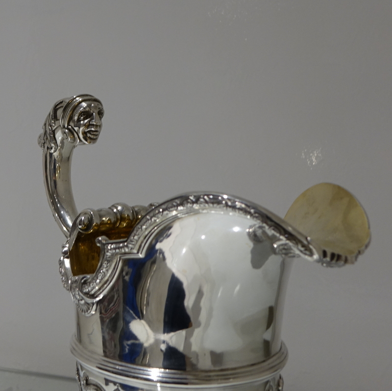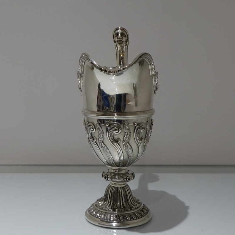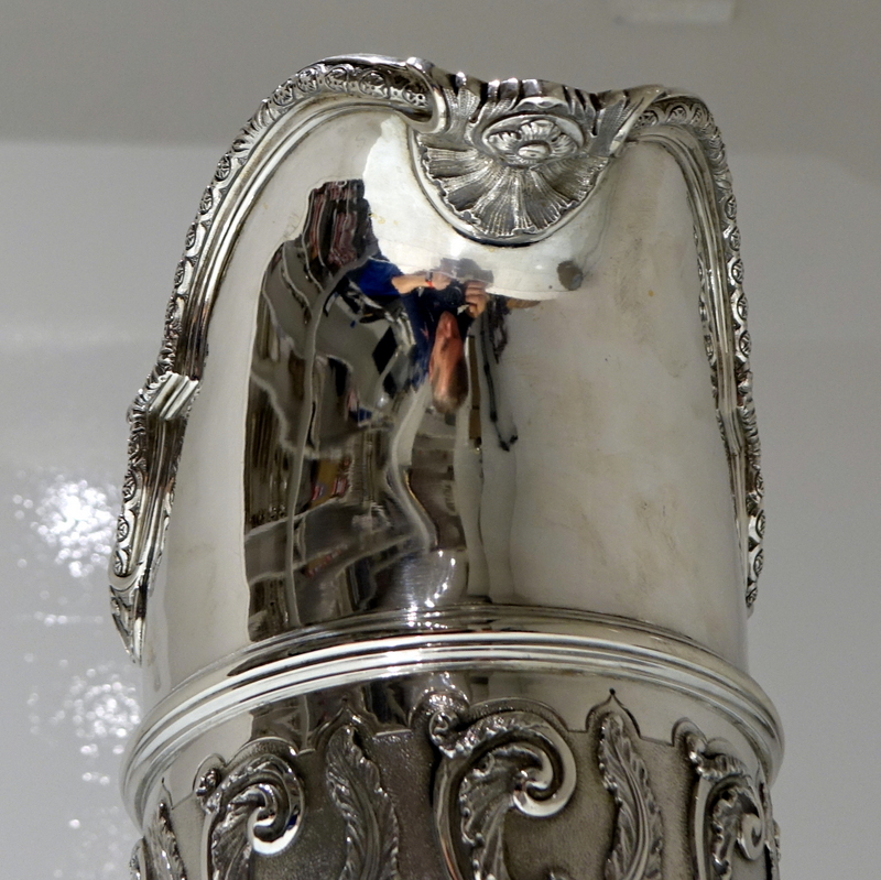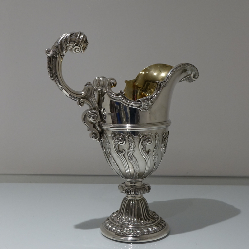 A spectacular quality and extremely fine large silver ewer designed with a lower matt finished body which has applied climbing foliage work for decorative contrast. Â The foot is circular ornate pedestal formed and the floating handle is truly magnificent.