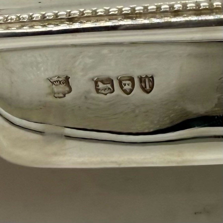 Rare and extremely beautiful pair of entree dishes designed with elegant rectangular plain formed bodies with stylish applied bead highlights. The dishes are mid-sized and have stylish intricately pierced detachable straining/dividers liners.