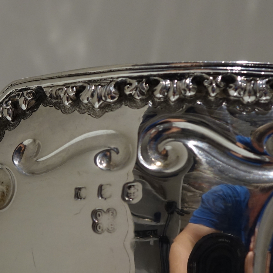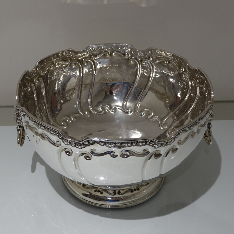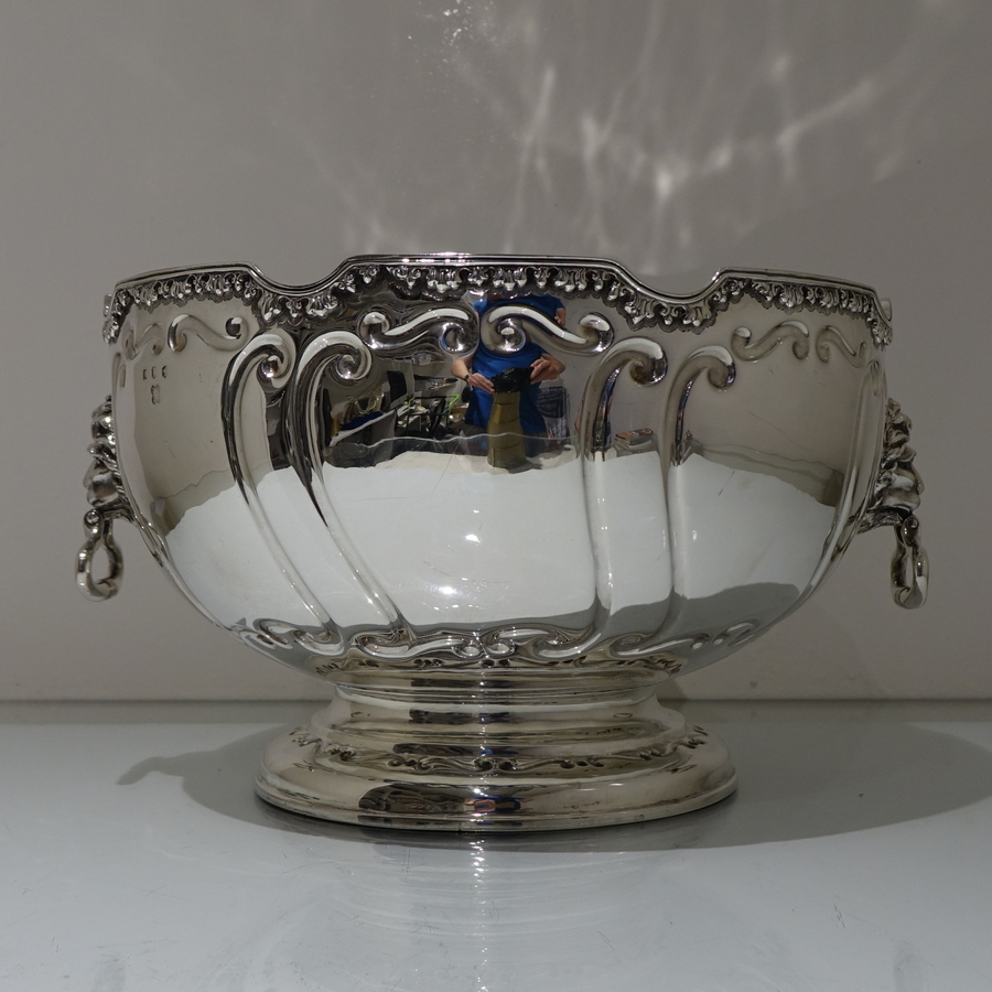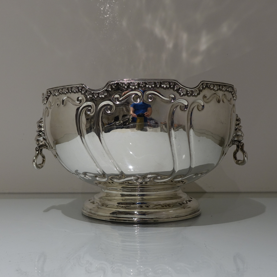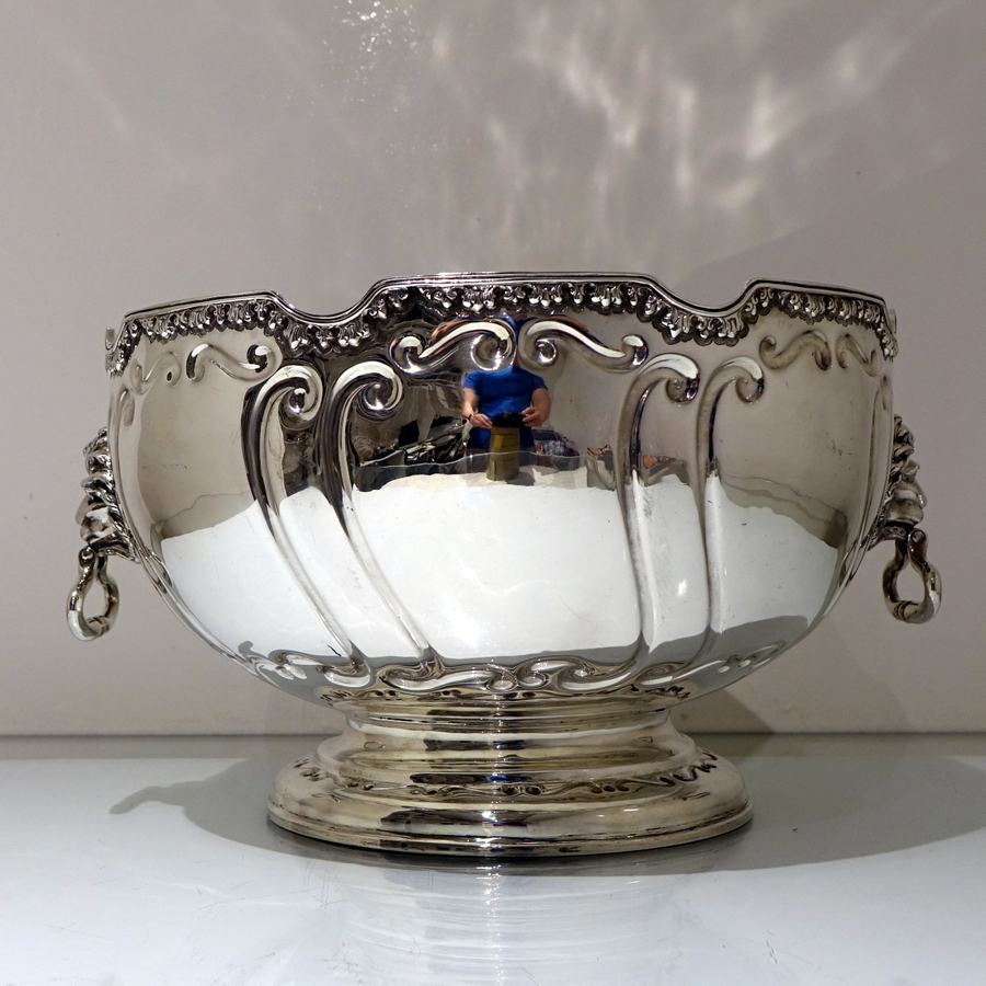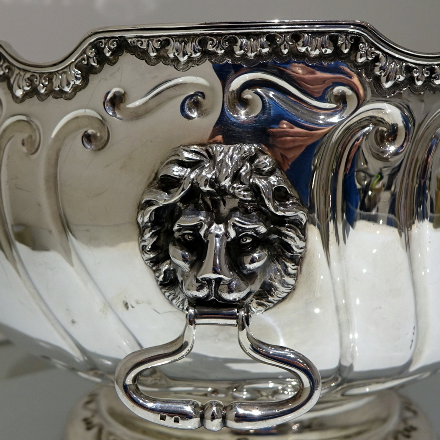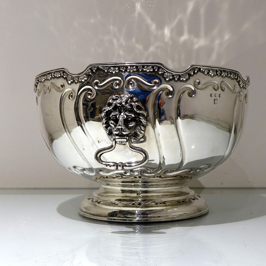 A very large and extremely stylish Glasgow made Victorian bowl, decorated with swirl fluting to the body and two glorious drop ring lion mask handles. Â The applied castellated type border is beautifully ornate for highlights.