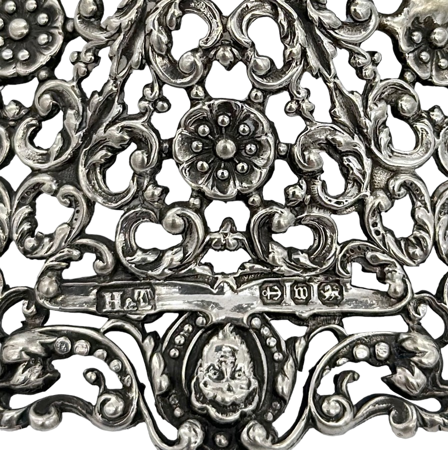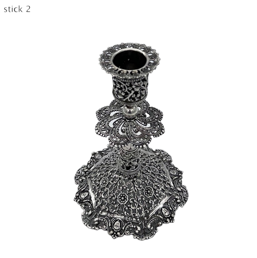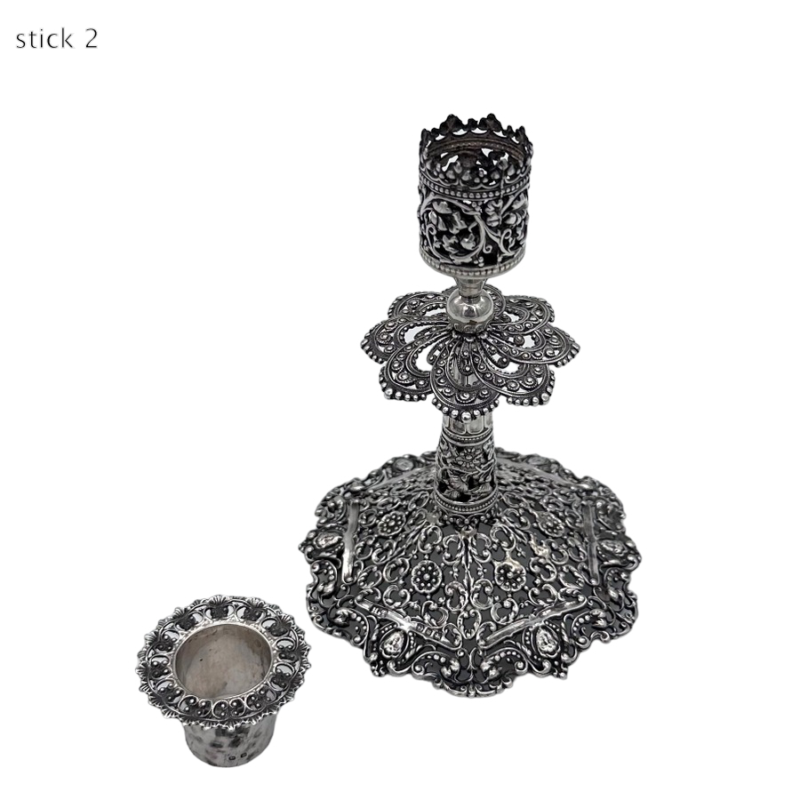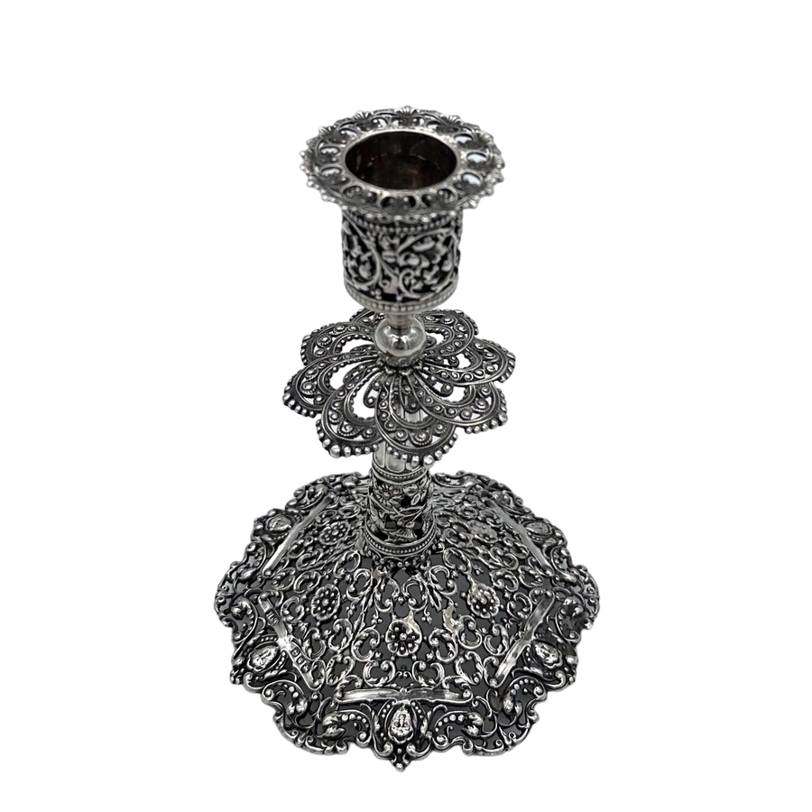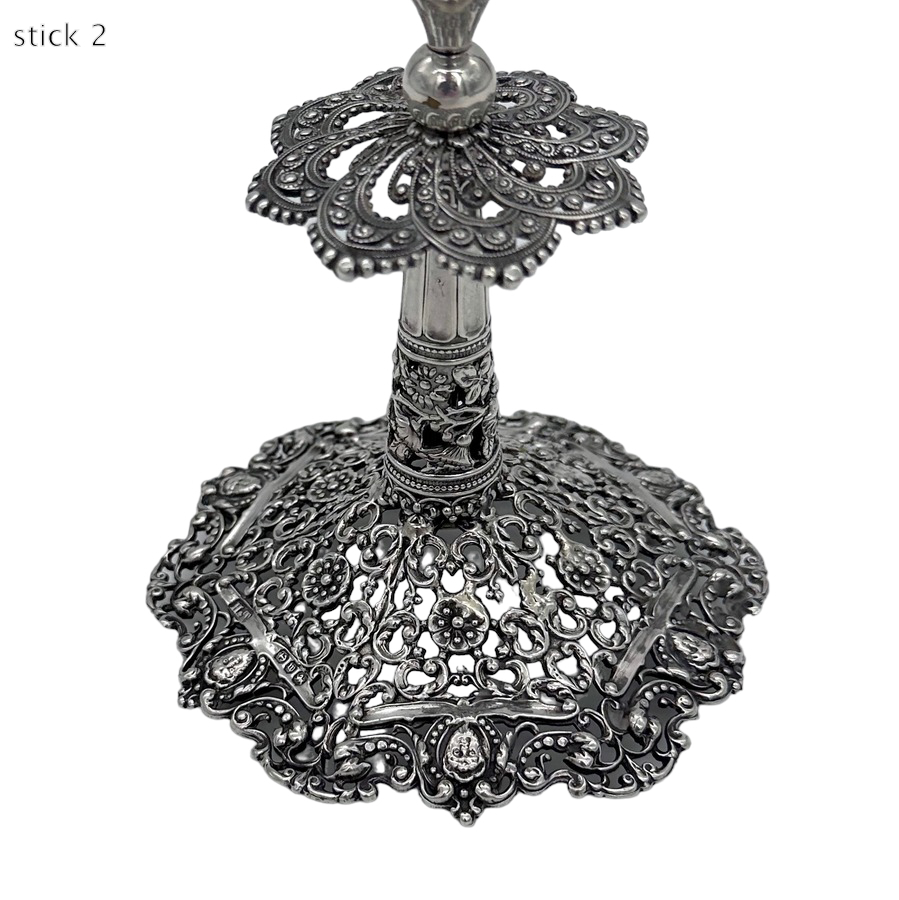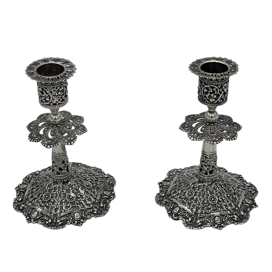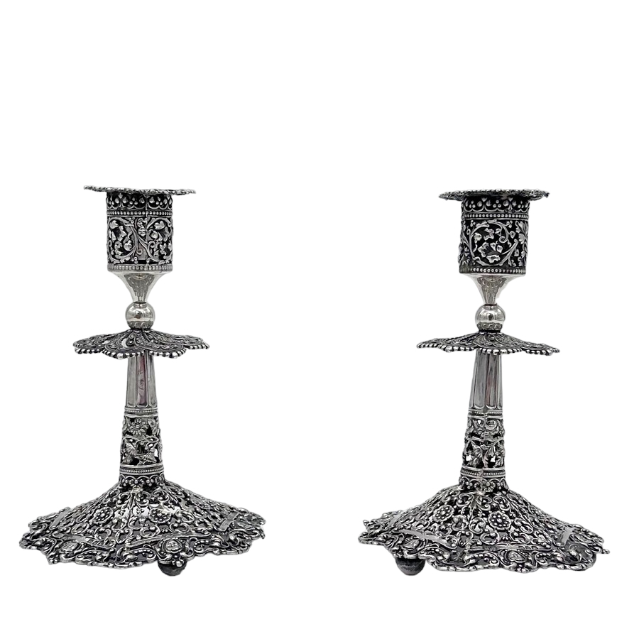Rare pair of sterling silver antique floral and scroll filiagree candlesticks designed with shaped circular bases and upper drip pans.