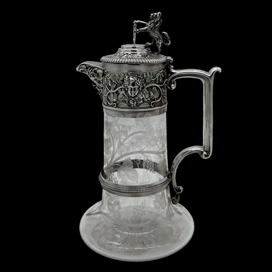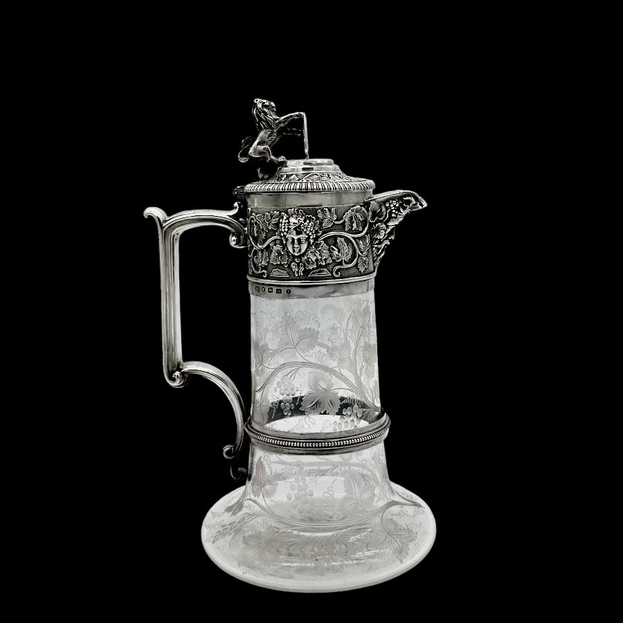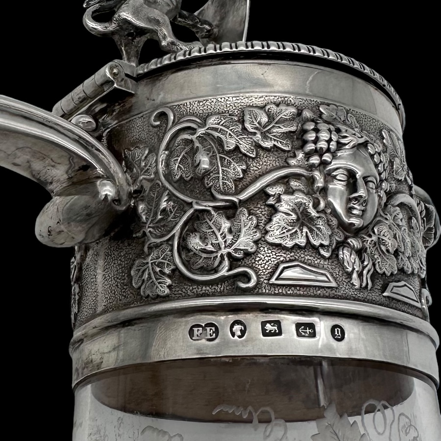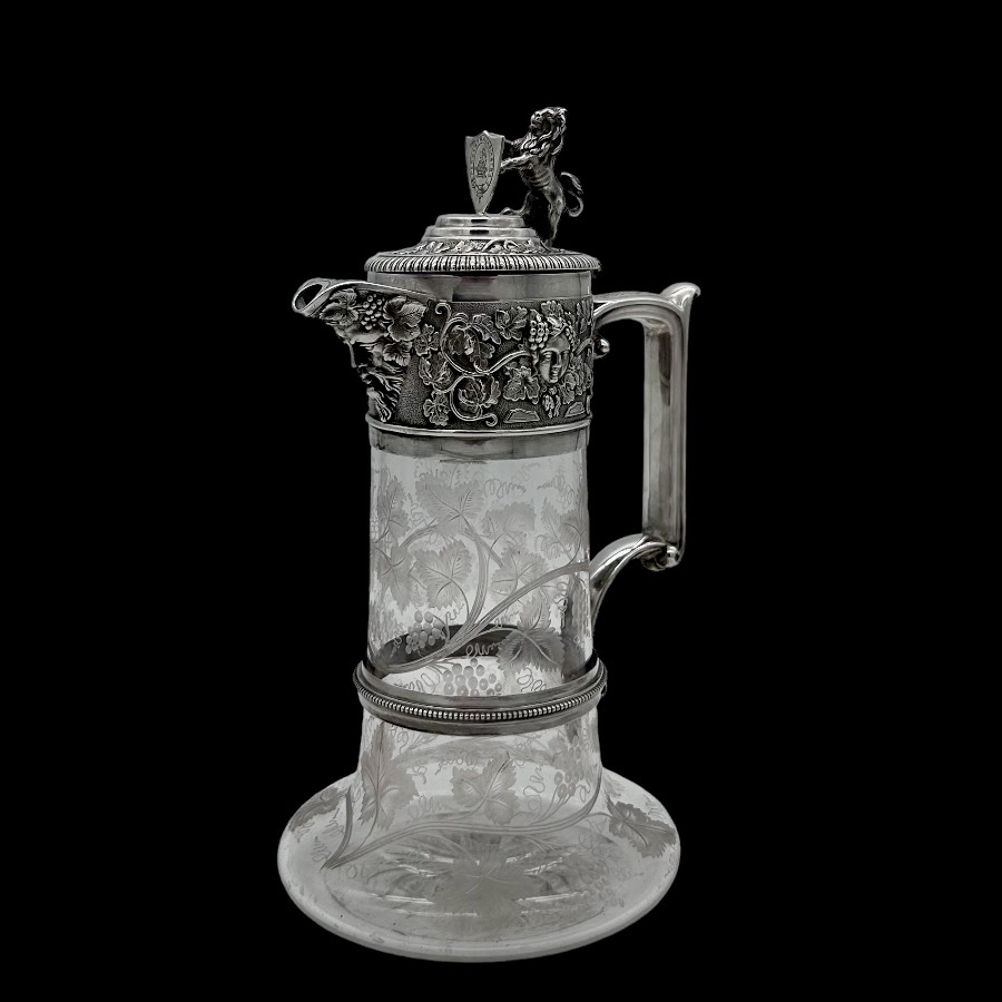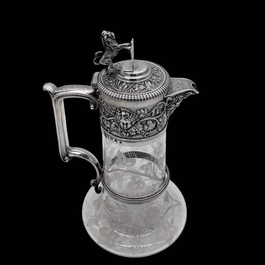 Wonderful sterling silver mounted crystal bottomed claret jug decorated with stunning grape and vine embellishing. The crystal glass has additional grape and vine workmanship for lowlights. The lid is hinged and mounted with a proud lion finial holding a stylish shield engraved with an original crest for importance.