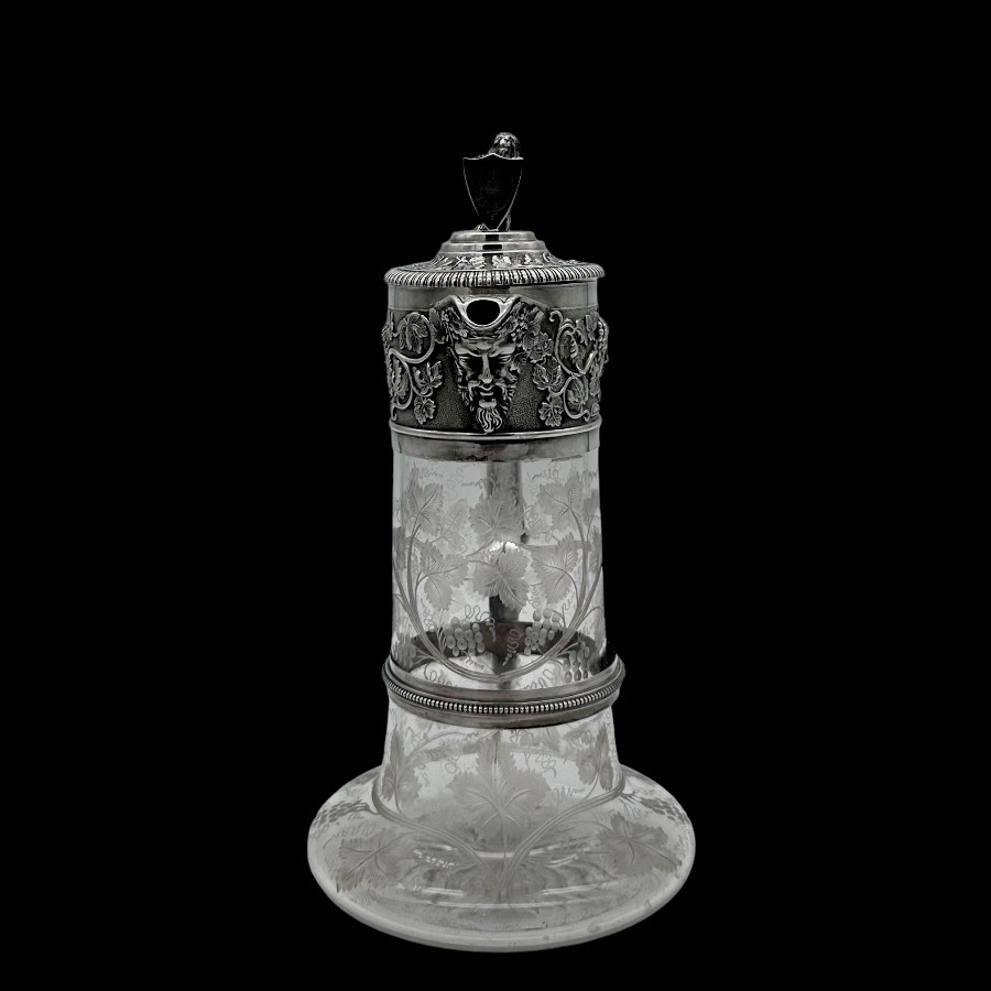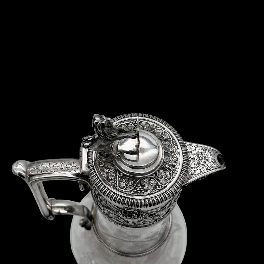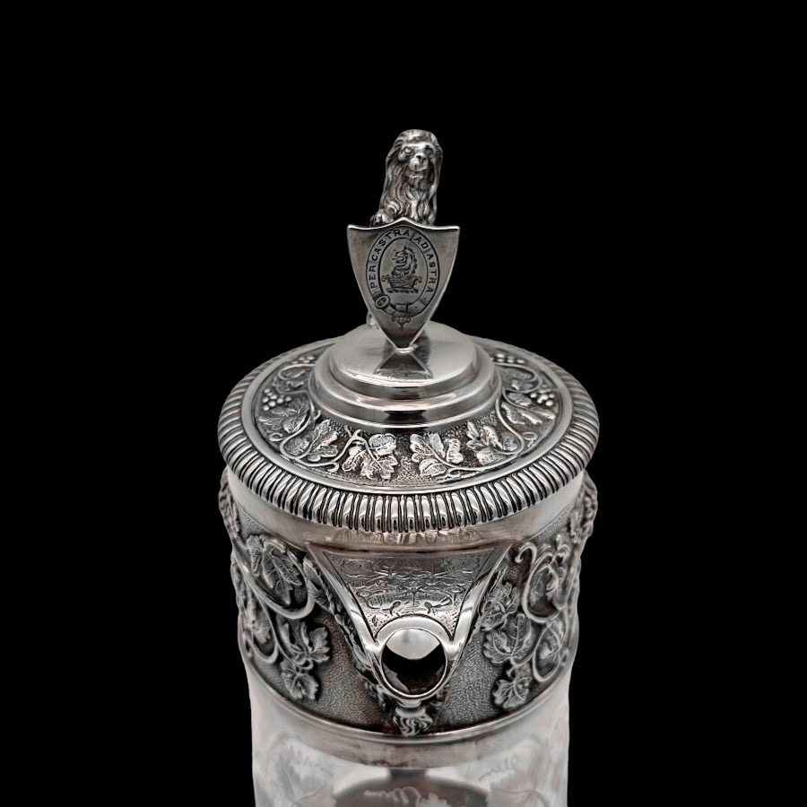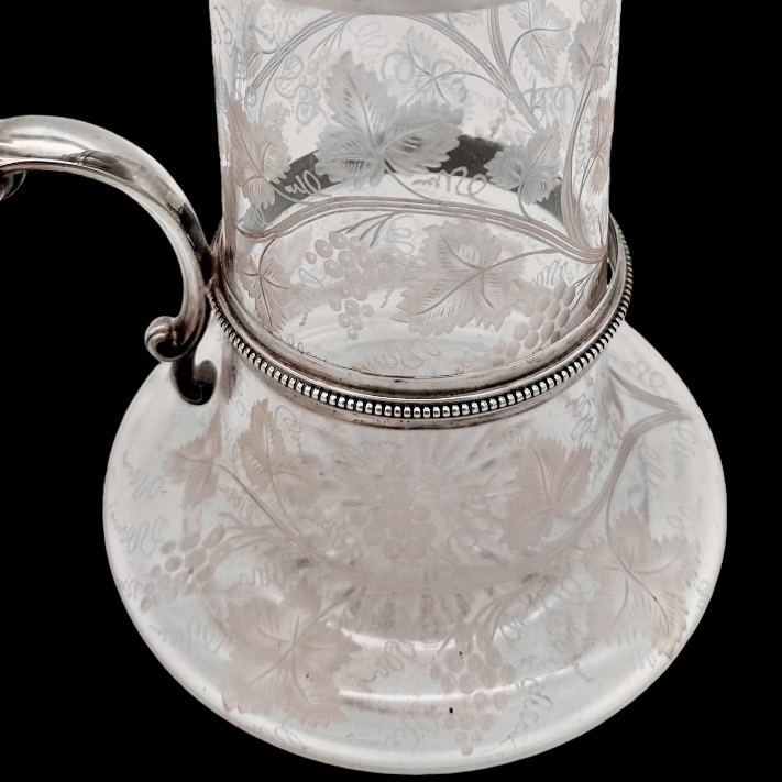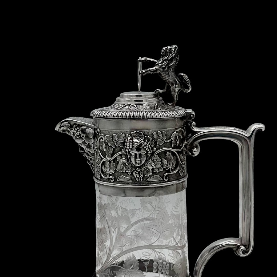 Wonderful sterling silver mounted crystal bottomed claret jug decorated with stunning grape and vine embellishing. The crystal glass has additional grape and vine workmanship for lowlights. The lid is hinged and mounted with a proud lion finial holding a stylish shield engraved with an original crest for importance.