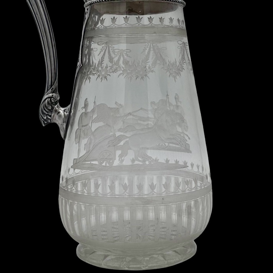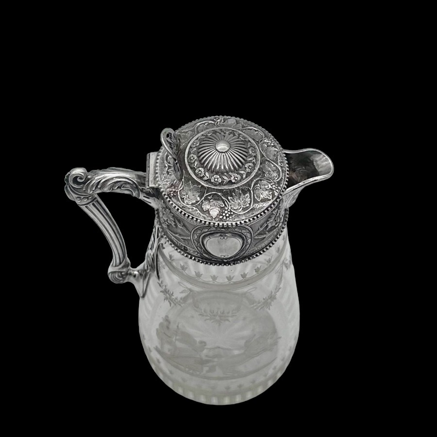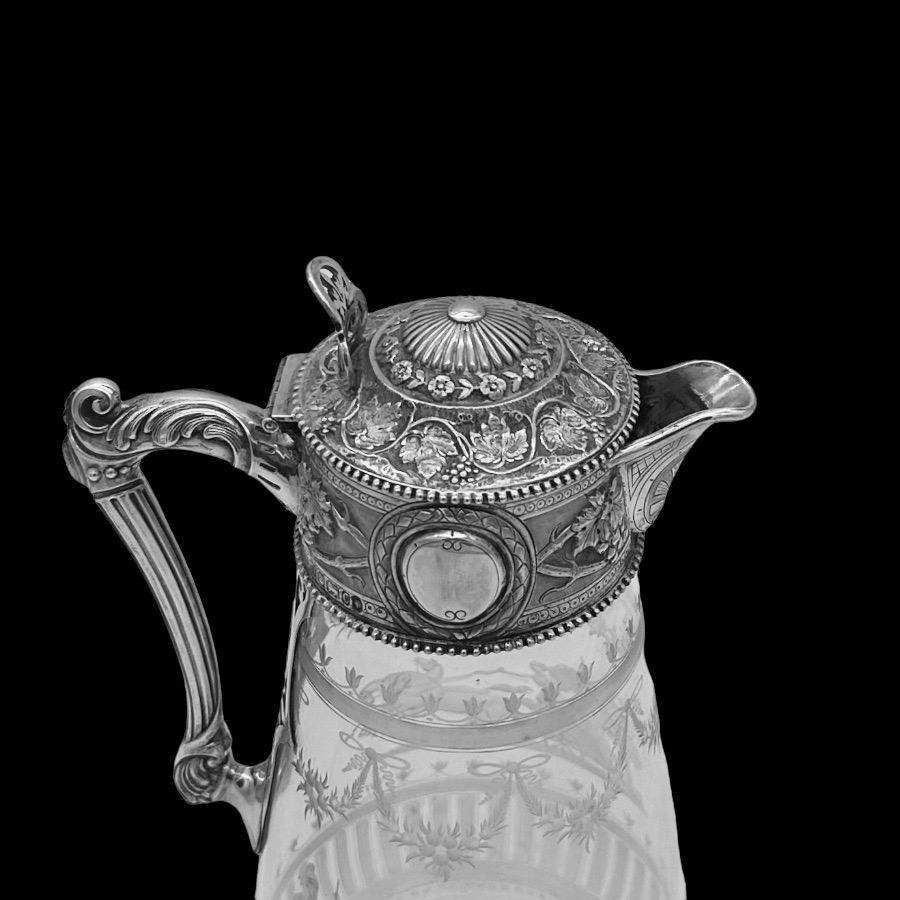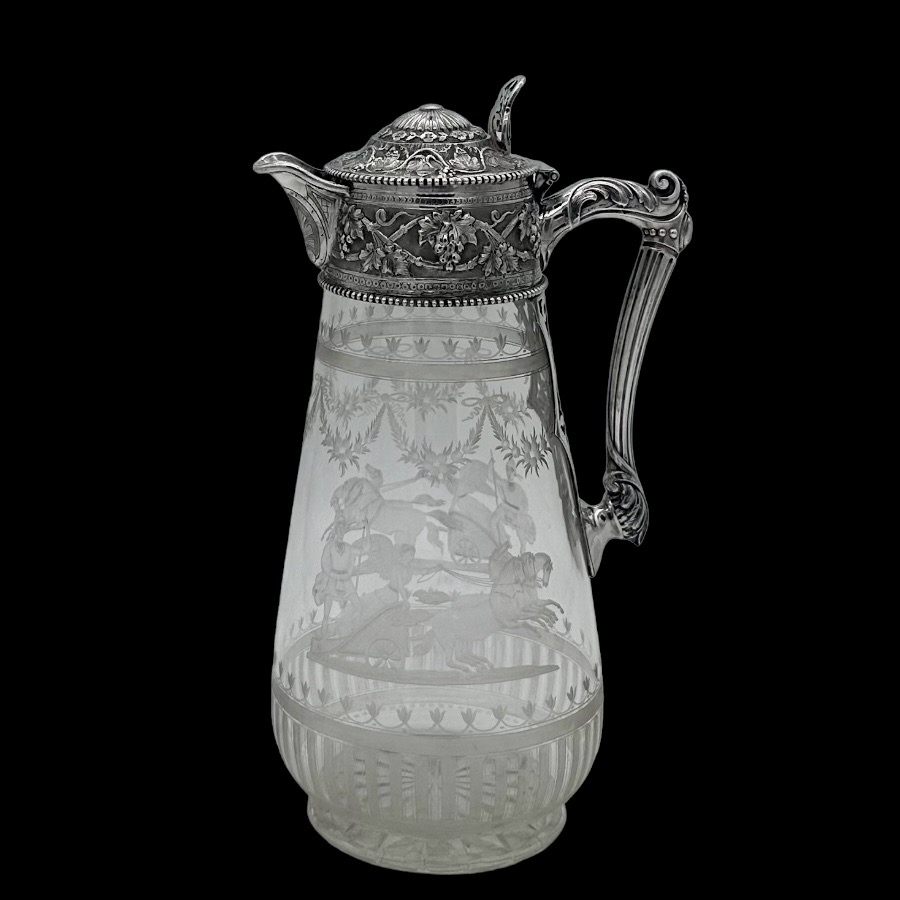 Beautiful sterling silver claret jug designed with a wonderful neo-classical engraved crystal bowl and stunning grape and vine decorative mount.