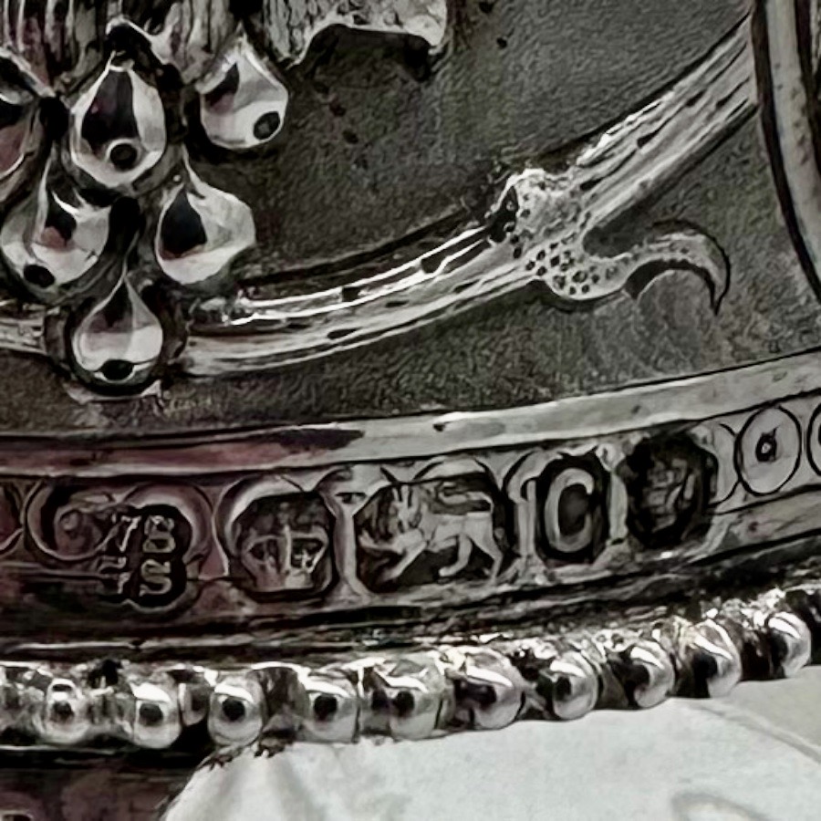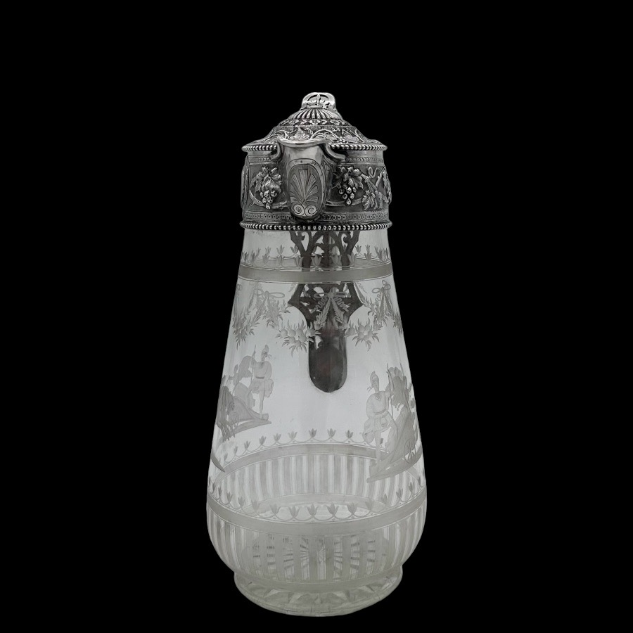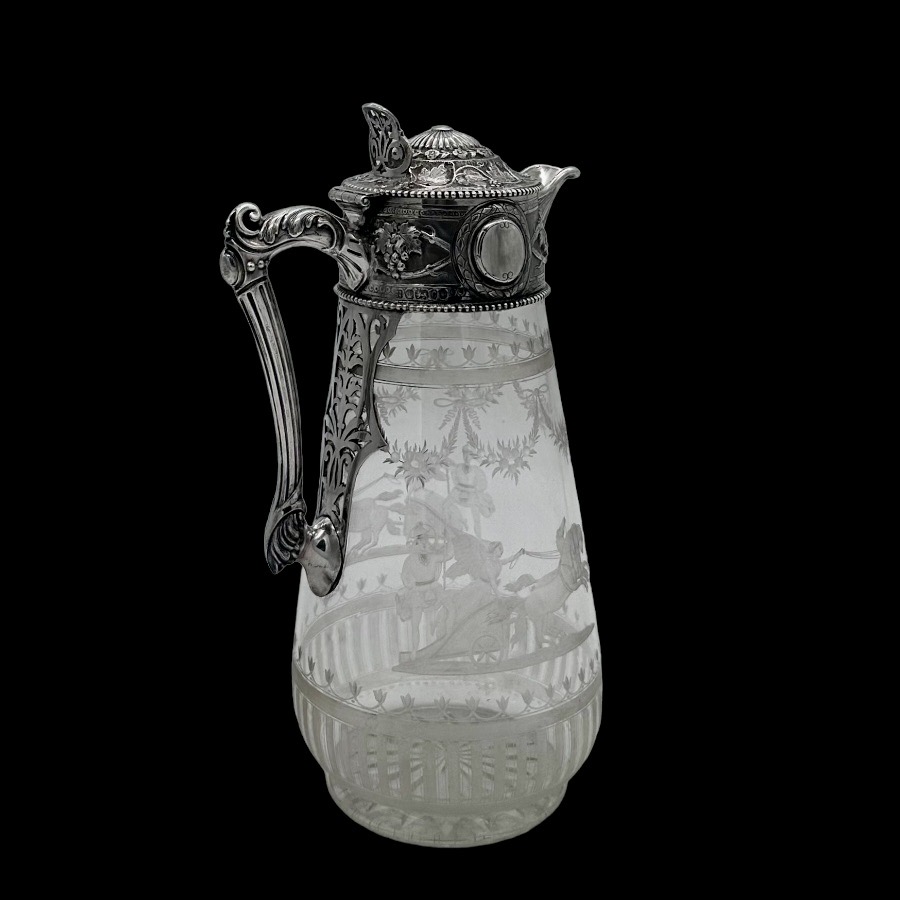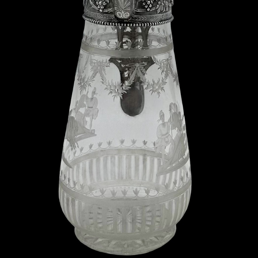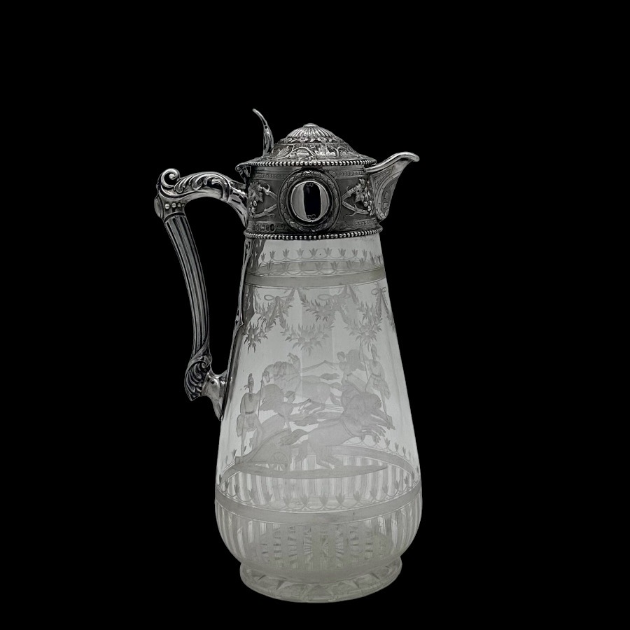 Beautiful sterling silver claret jug designed with a wonderful neo-classical engraved crystal bowl and stunning grape and vine decorative mount.