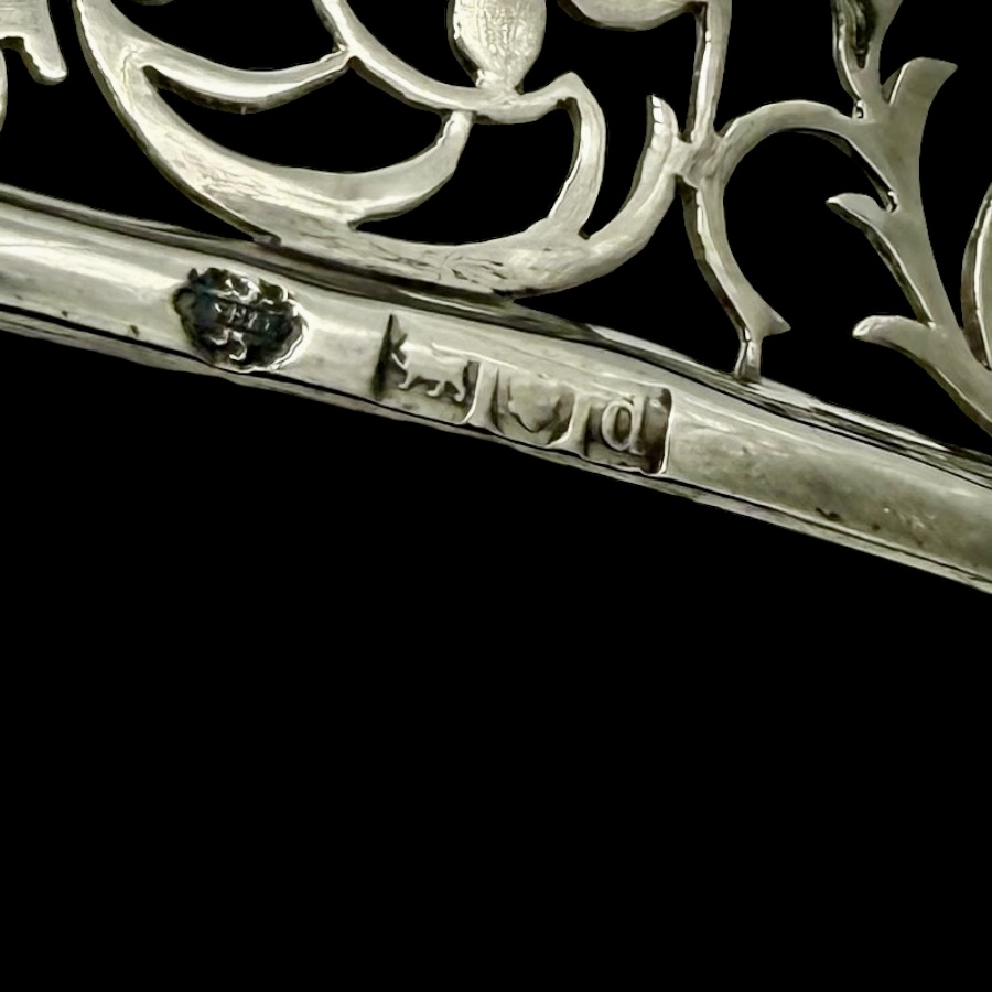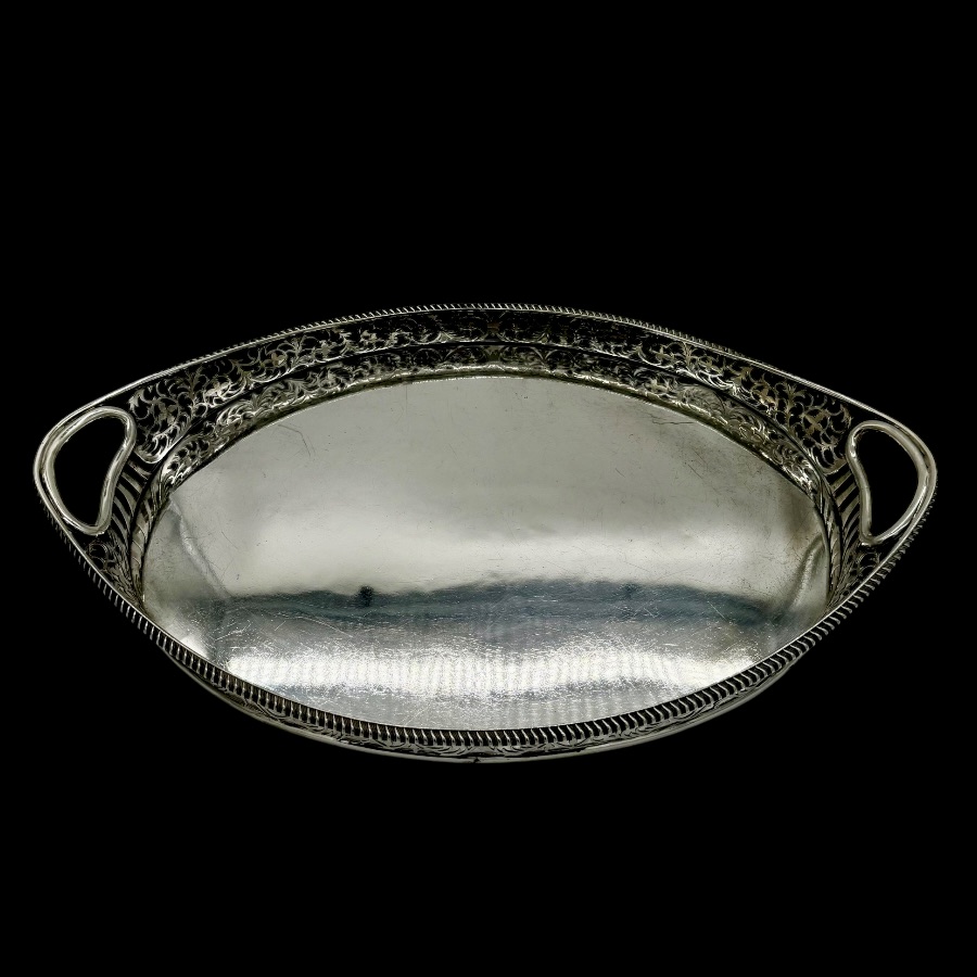 Superb quality silver oval gallery tray designed with stylish incuse handles and decorated with an elegant floral and foliate hand pierced walls.