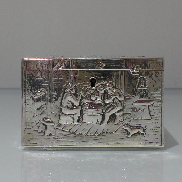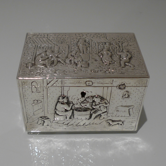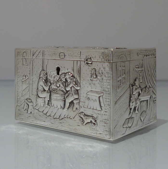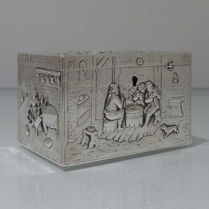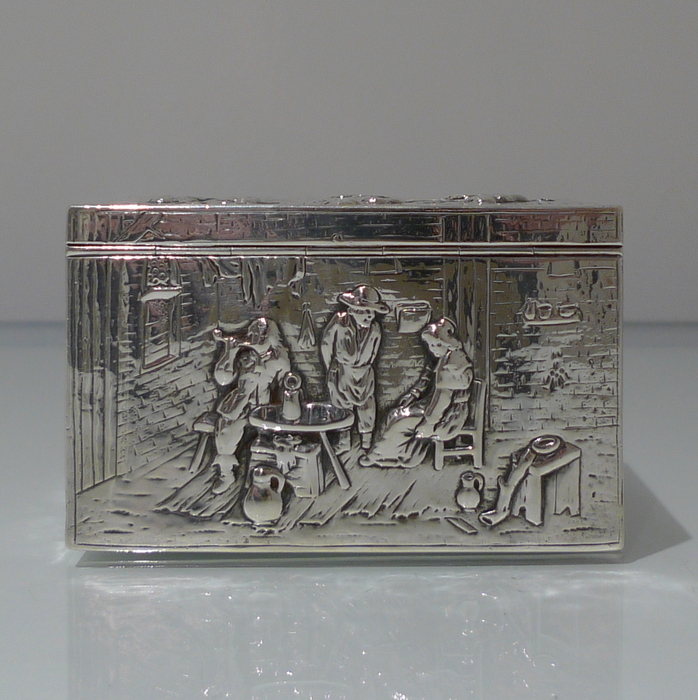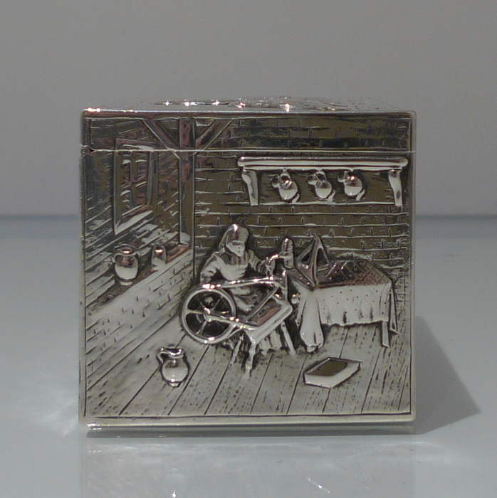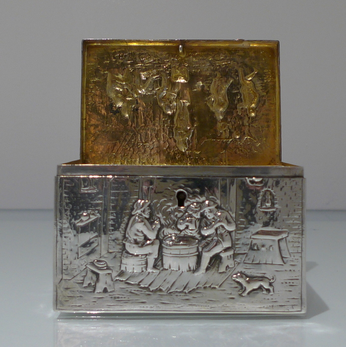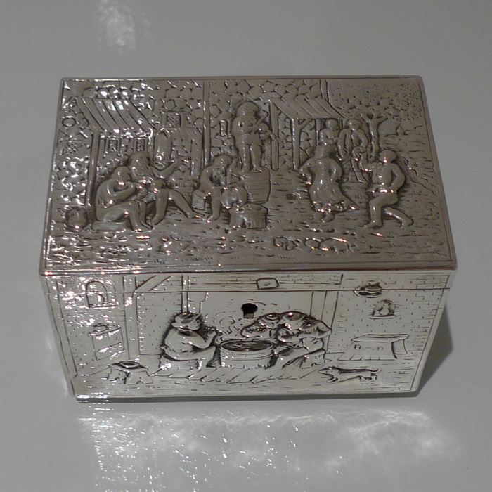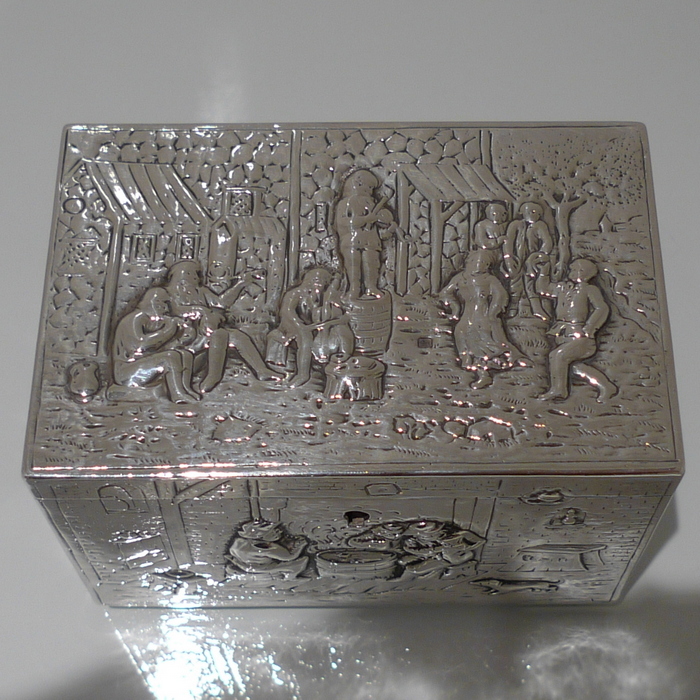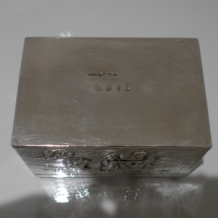A very collectable late 19th century rectangular silver jewellery box beautifully decorated with various hand chased scenes of rural “every day life” on each panel.  The lid of the box is hinged and the inside has been gilt for contrast.