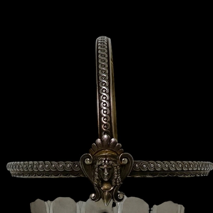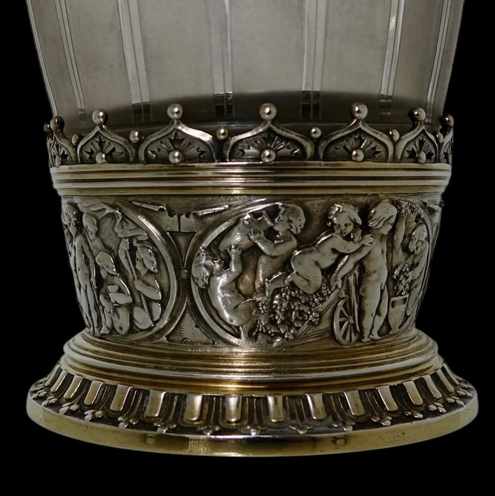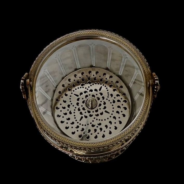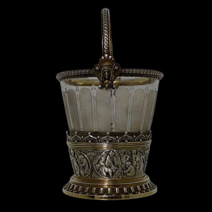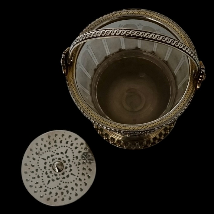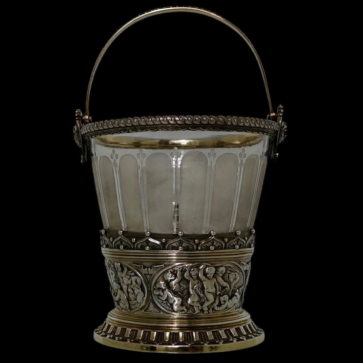A quite stunning and incredibly rare partial gilt electro formed 19th century Victorian ice bucket with a decorative frosted glass liner. Â The base of the bucket has cherubs and elegant gadroon as lowlights. The rim of the bucket is ornately decorated with two red indian motifs set either side of the hinged swing handle.