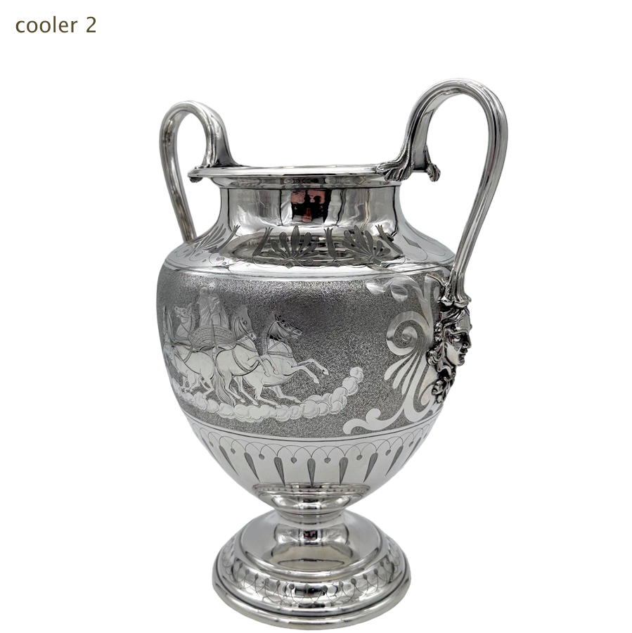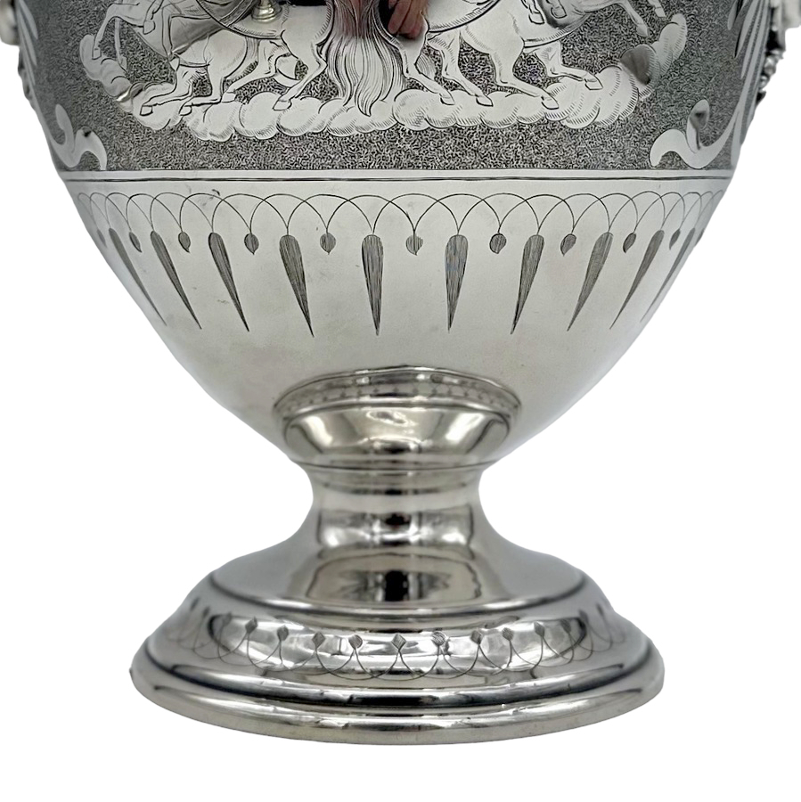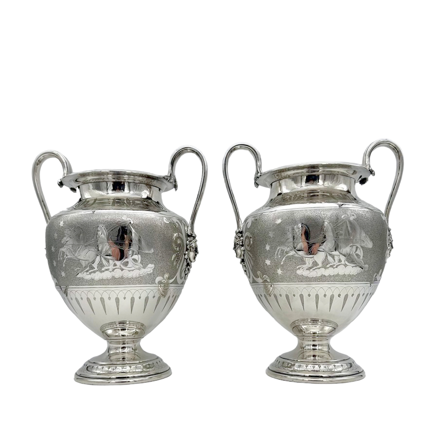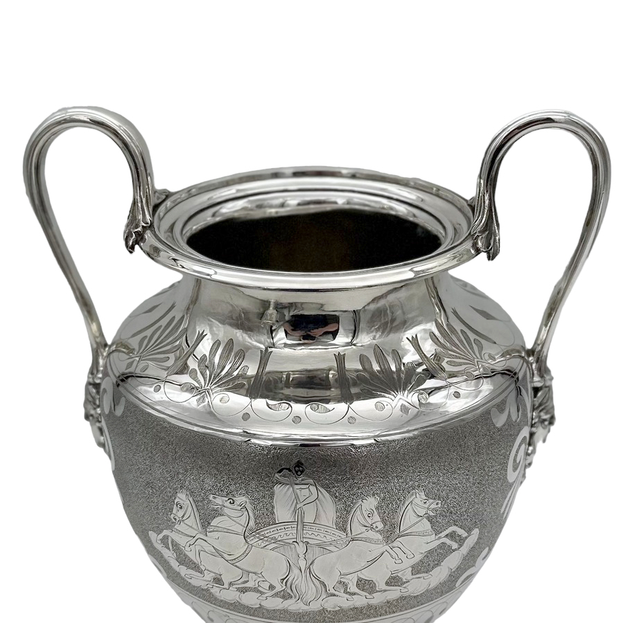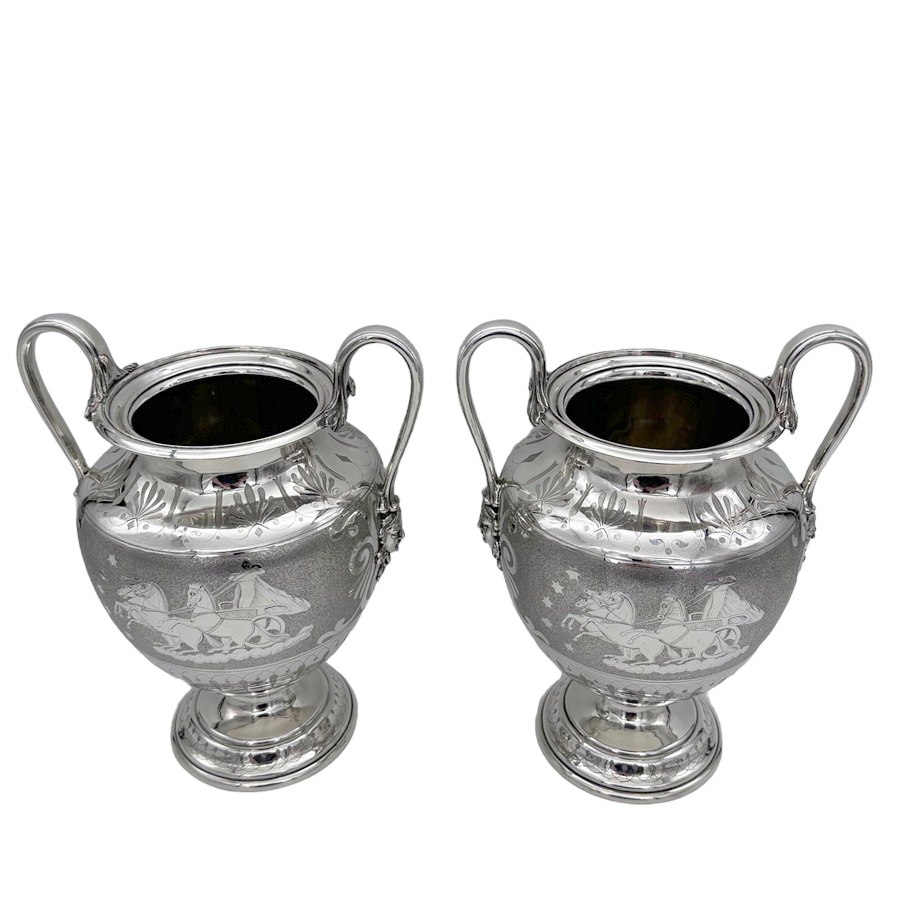 Fascinating pair of neoclassical silverplate wine coolers designed with elegant baluster bodies and decorated with superb engraved scenes depicting Roman centurions on horse drawn chariots all set on a matt background for decorative contrast.