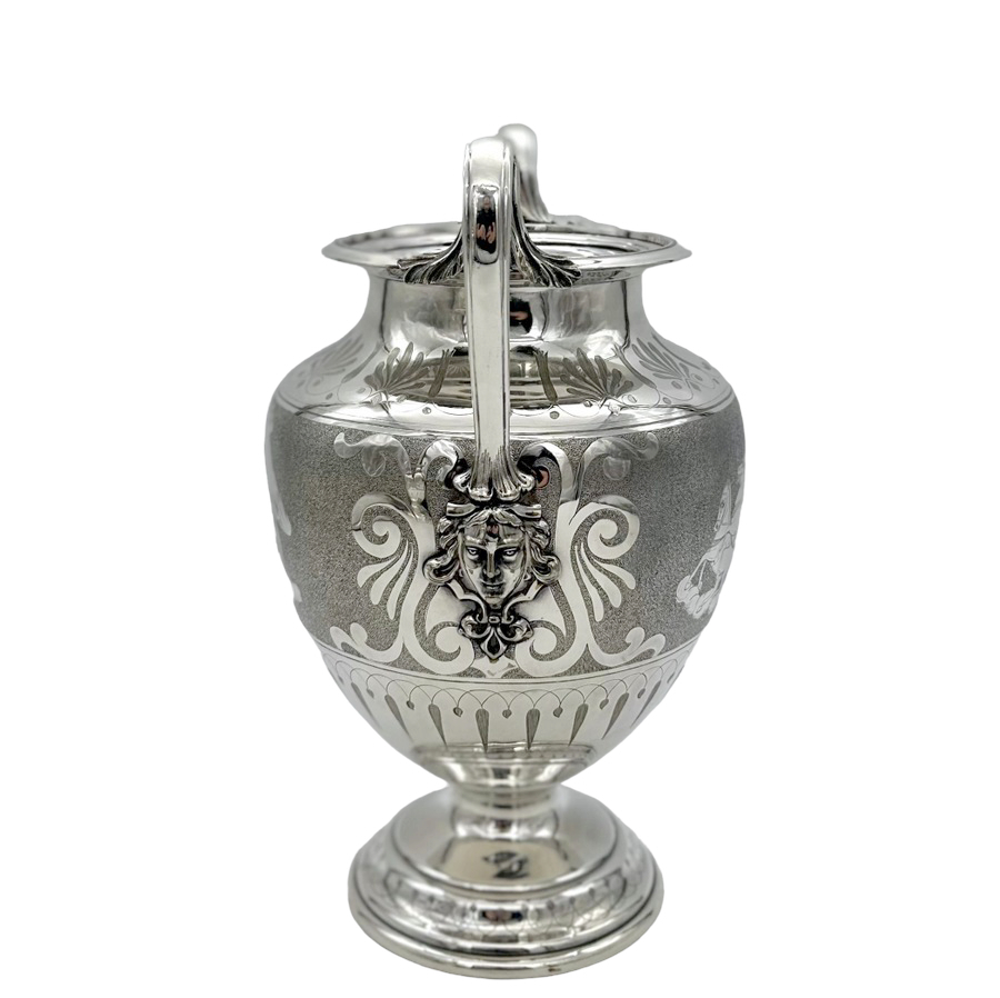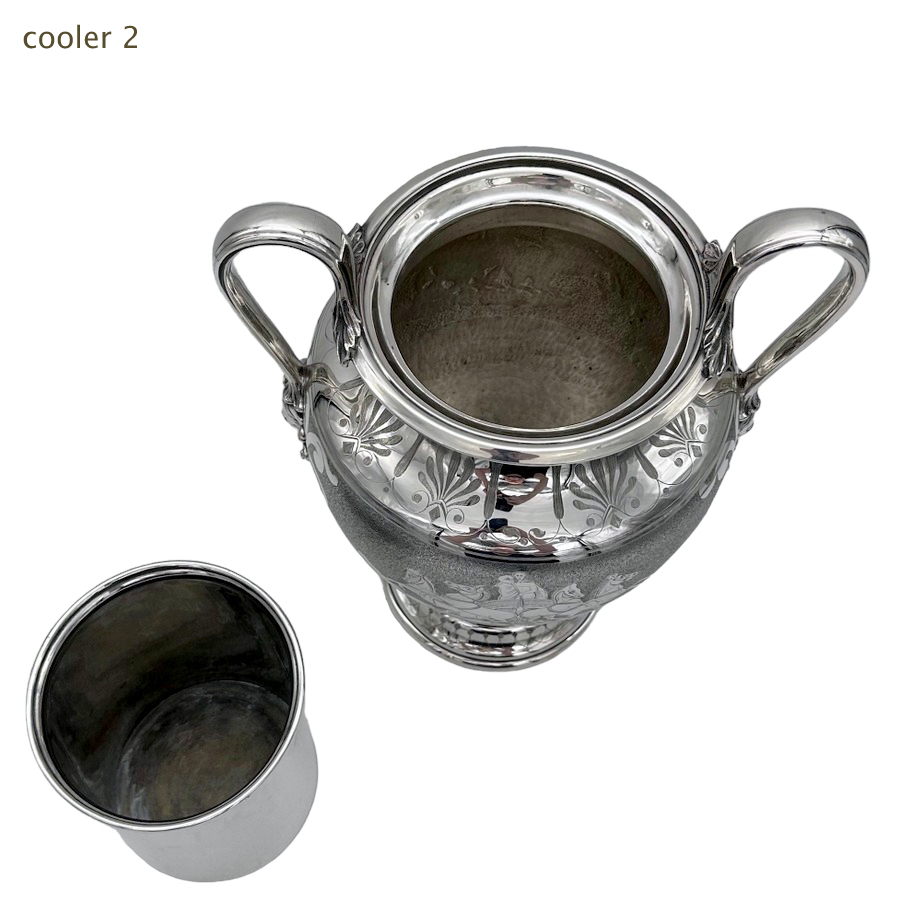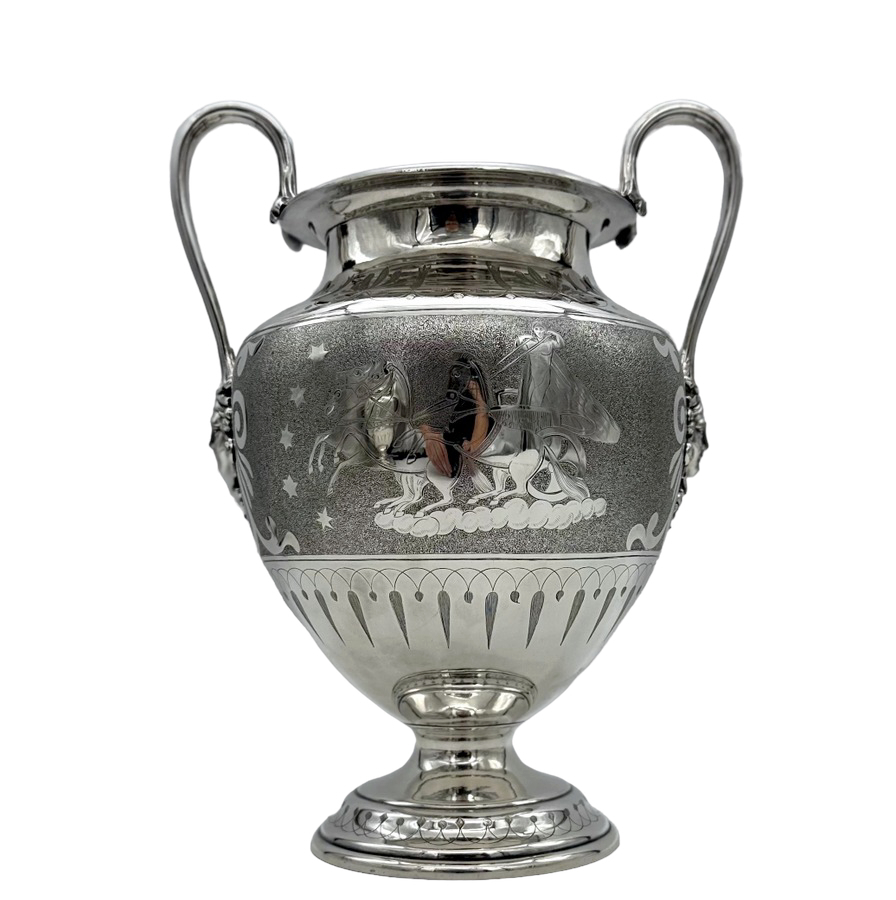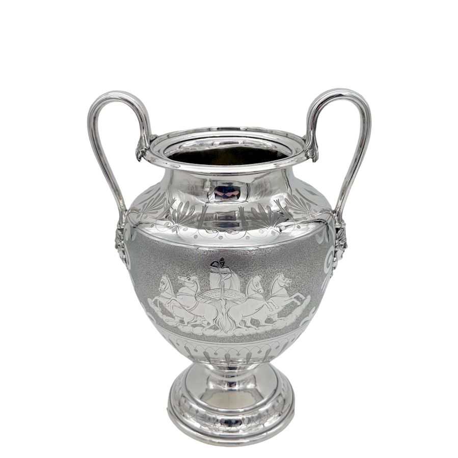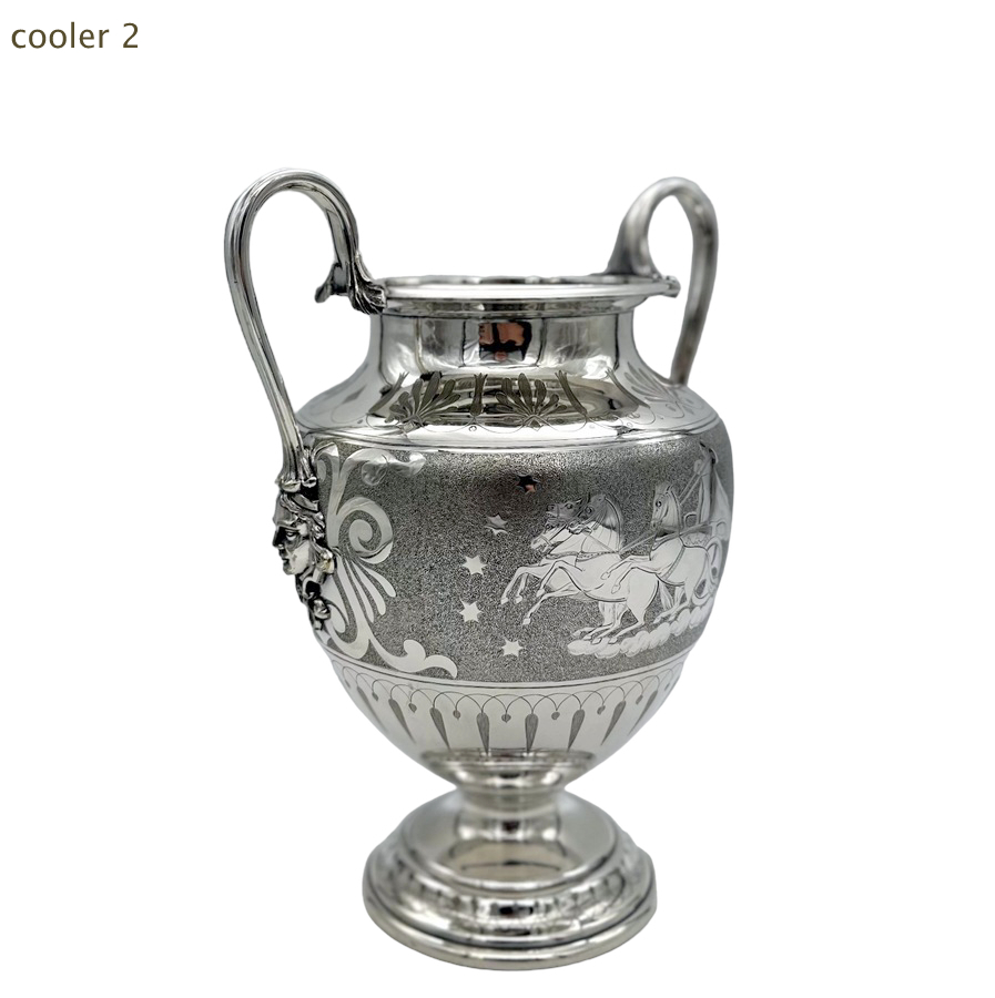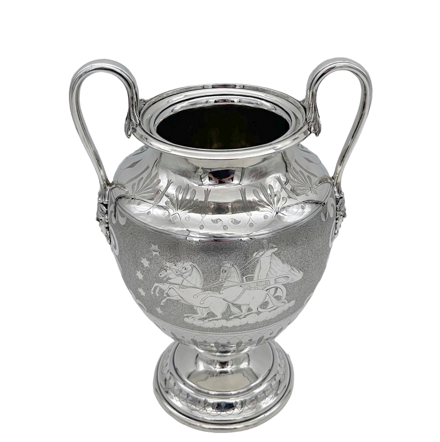 Fascinating pair of neoclassical silverplate wine coolers designed with elegant baluster bodies and decorated with superb engraved scenes depicting Roman centurions on horse drawn chariots all set on a matt background for decorative contrast.