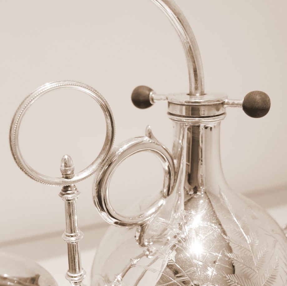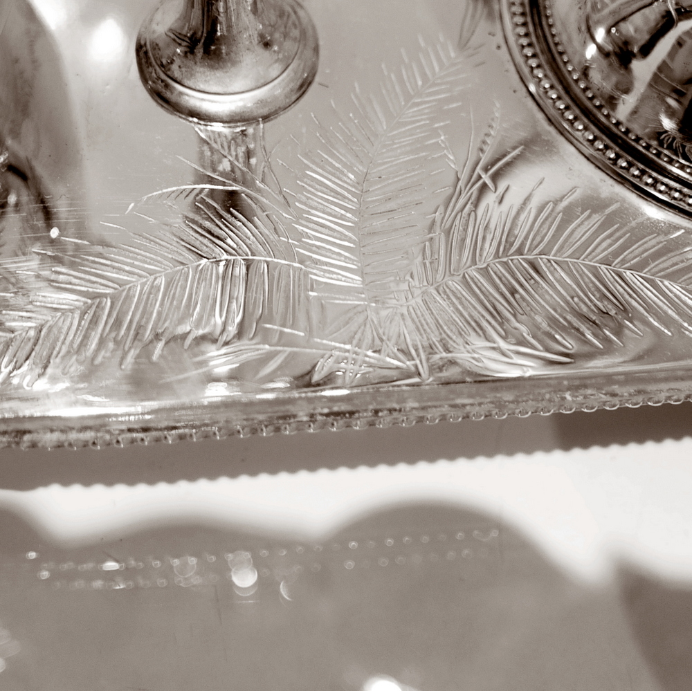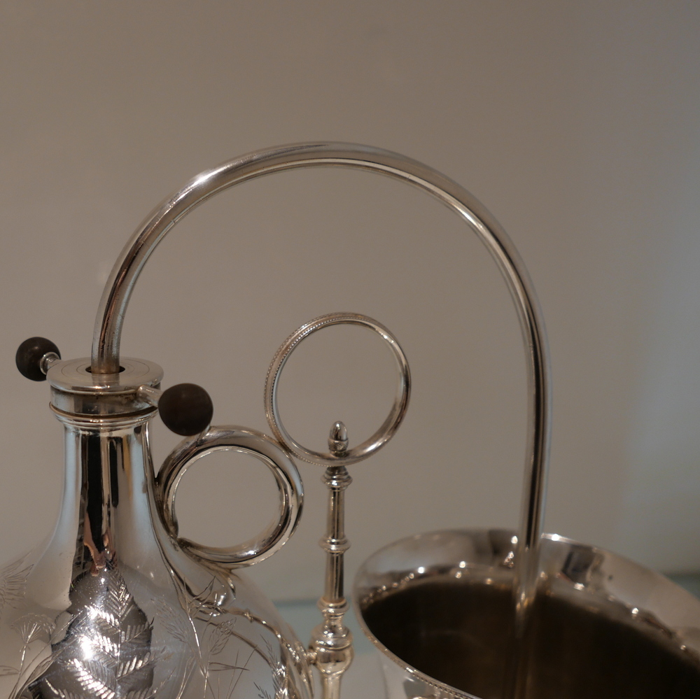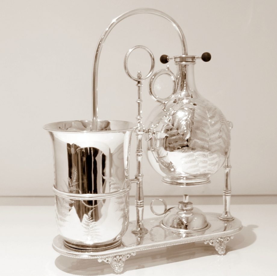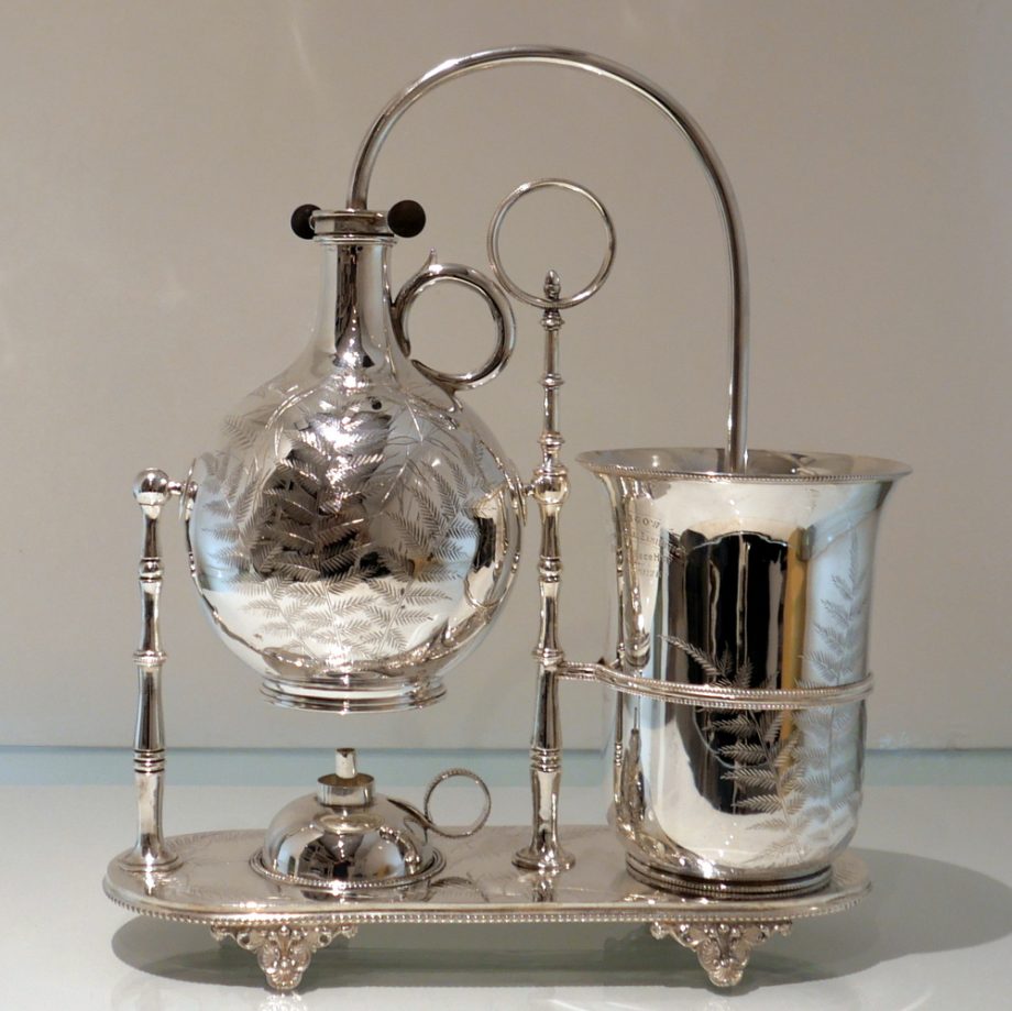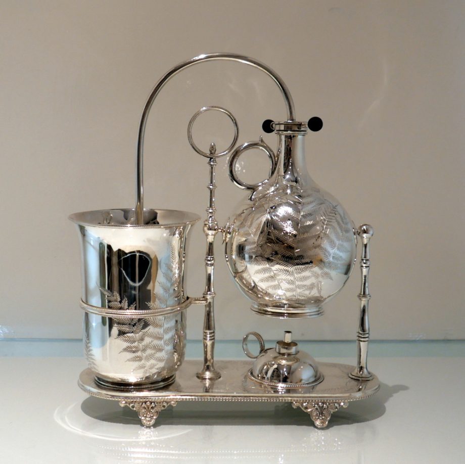 An extremely rare fern engraved Victorian silverplated coffee maker. Â The stand sits on four ornate feet and has a bead border for lowlights. Â The coffee bowl has an elegant contemporary inscription for importance.