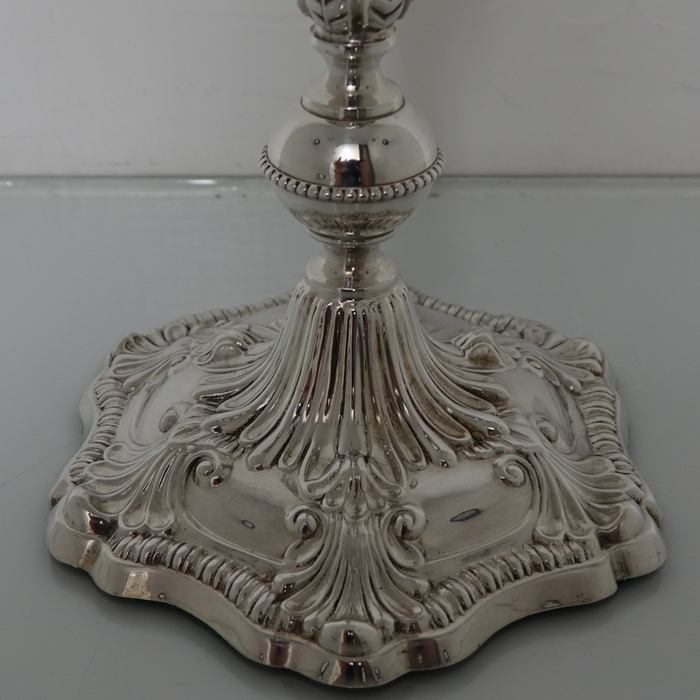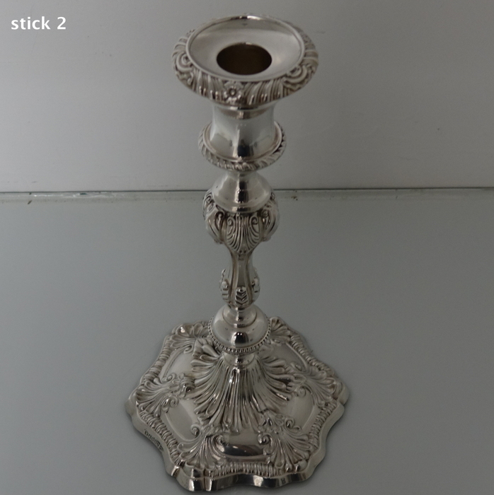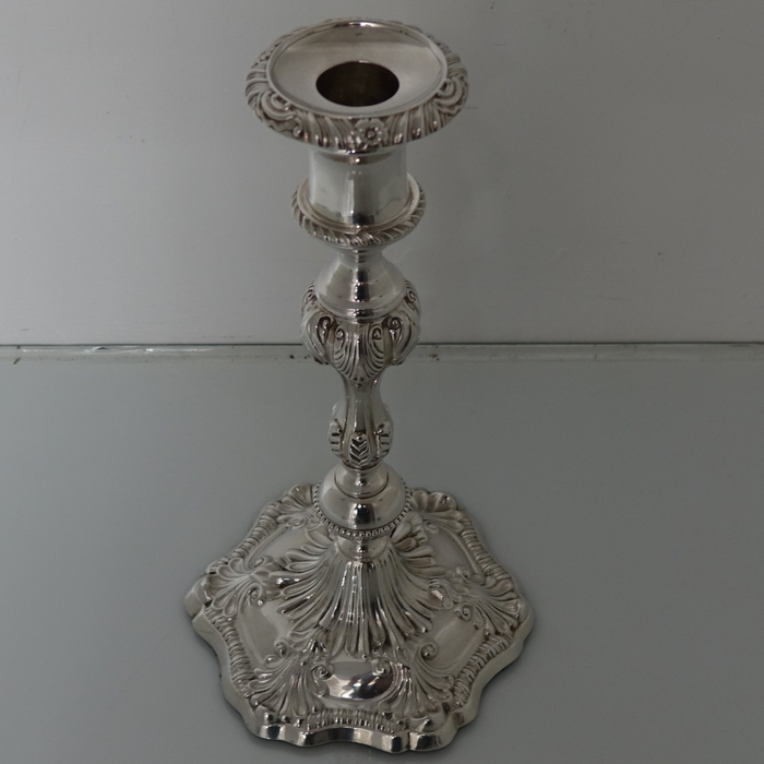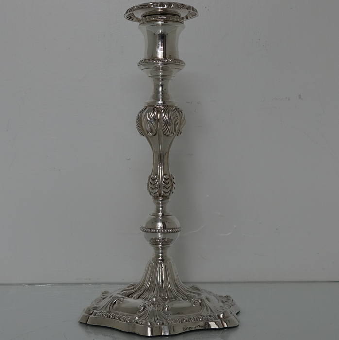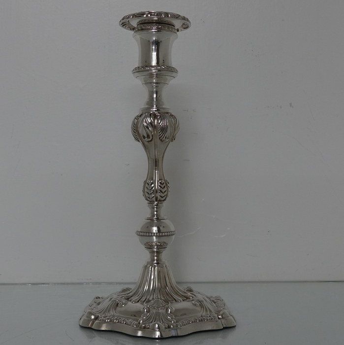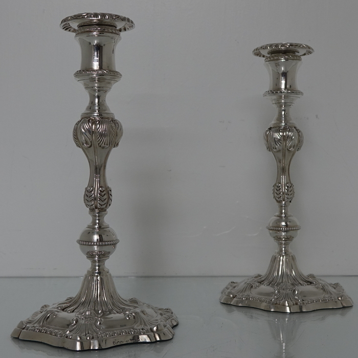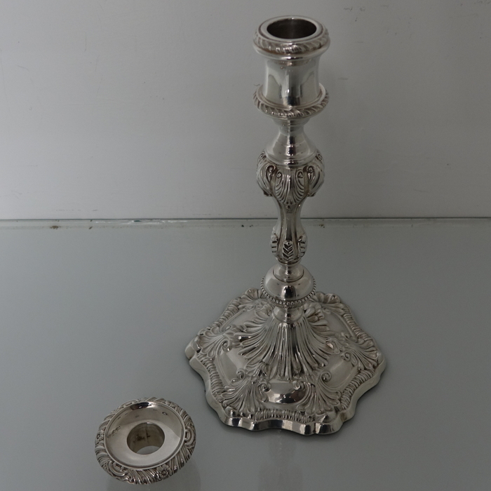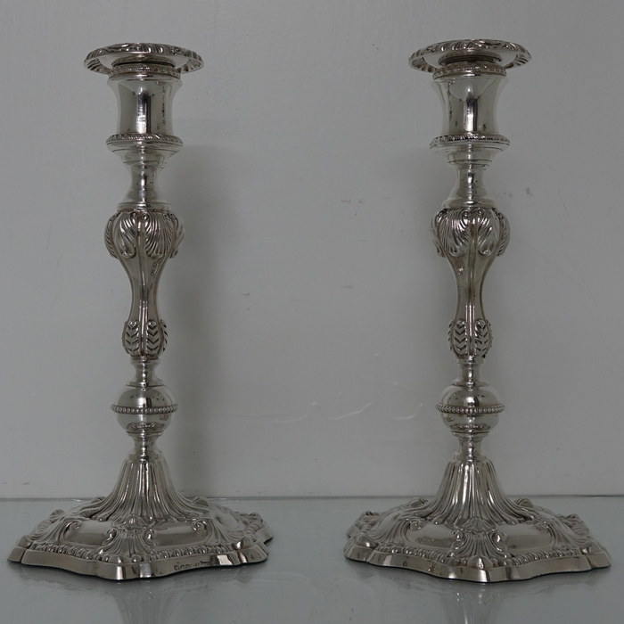 A very stylish pair of silver-plated candlesticks with shape gadroon bases and a elegant swirl fluted raised pedestal on which an ornate stem sits and is crowned by a plain formed capital with two bands of additional gadroon for highlights. Â The nozzles are detachable.