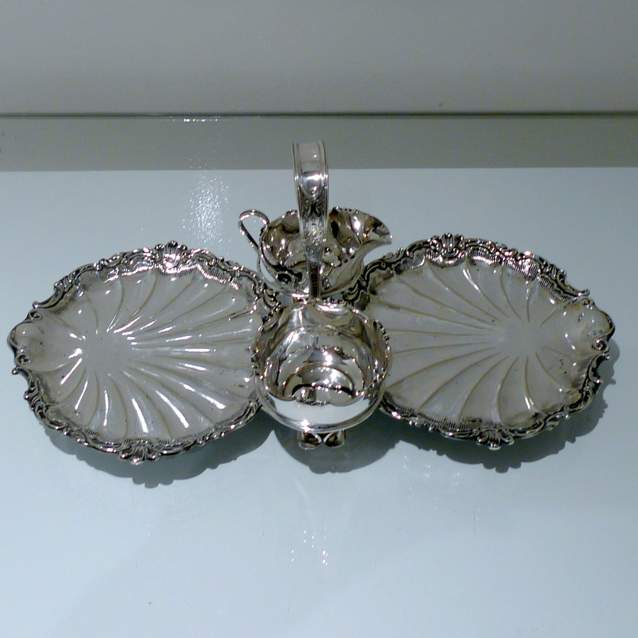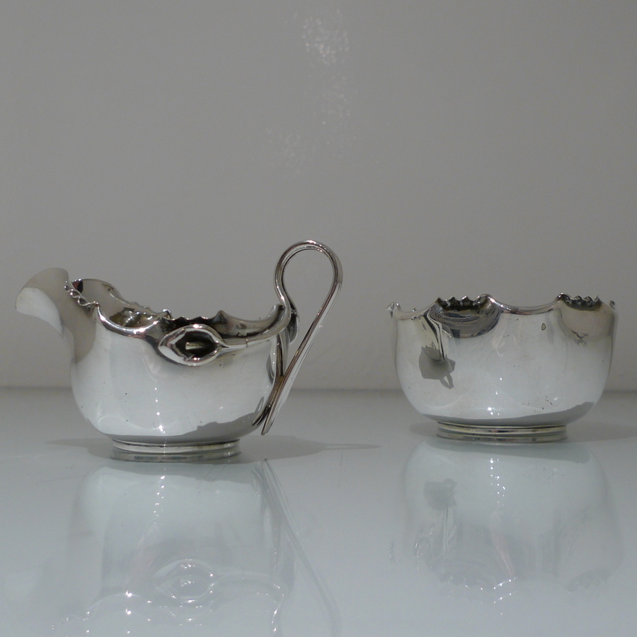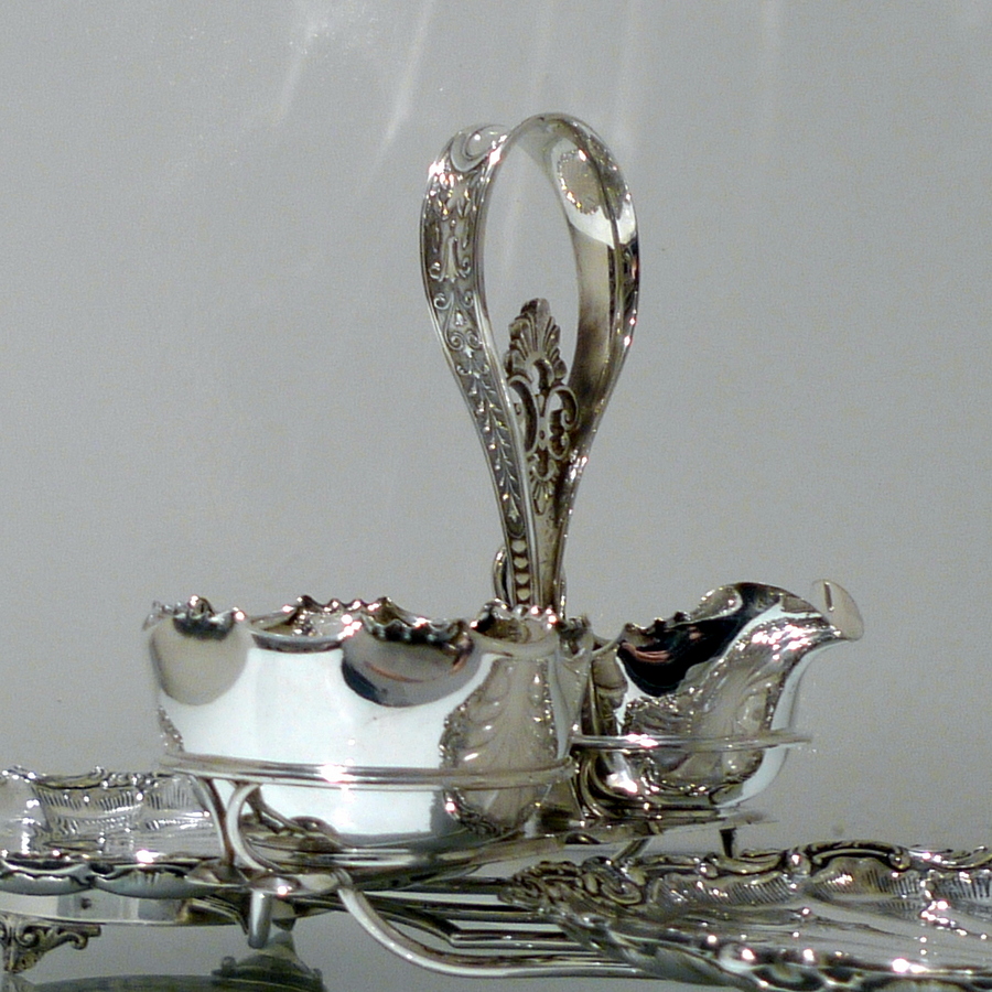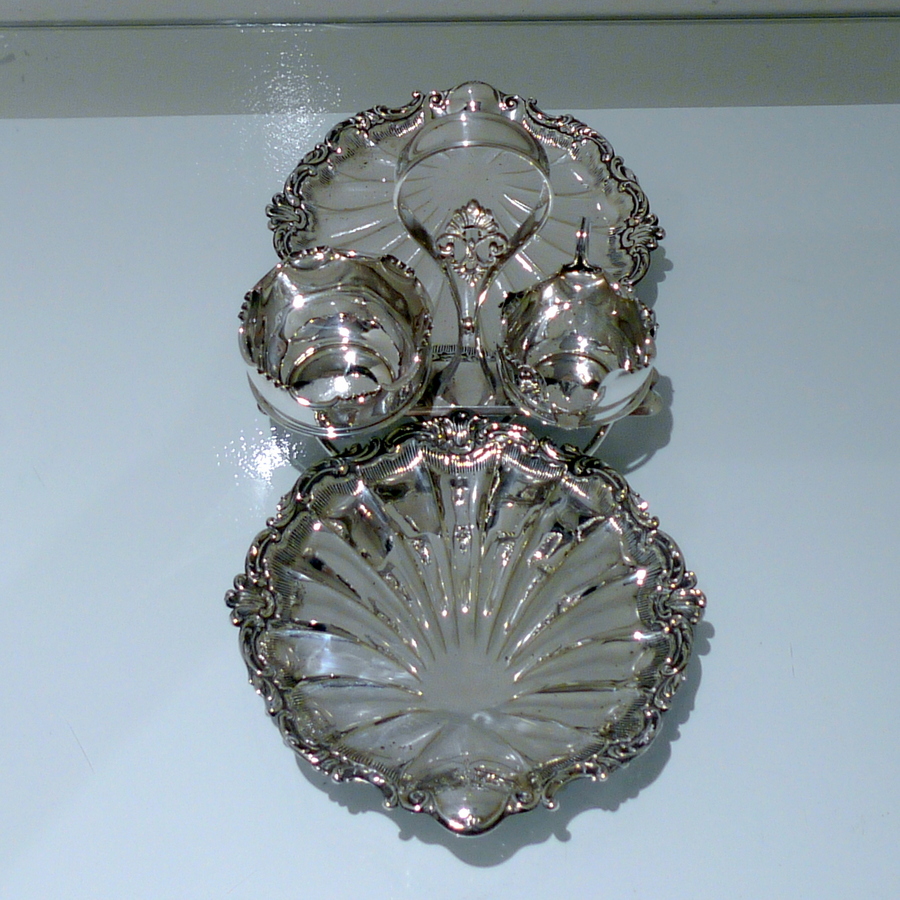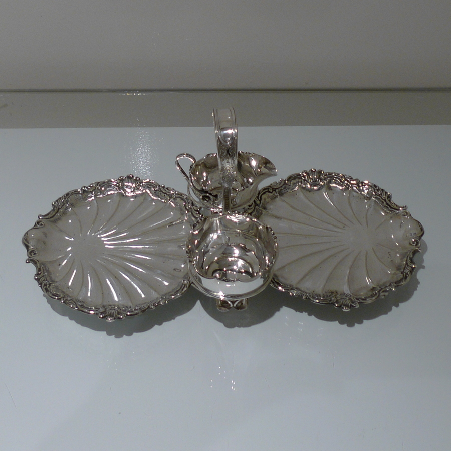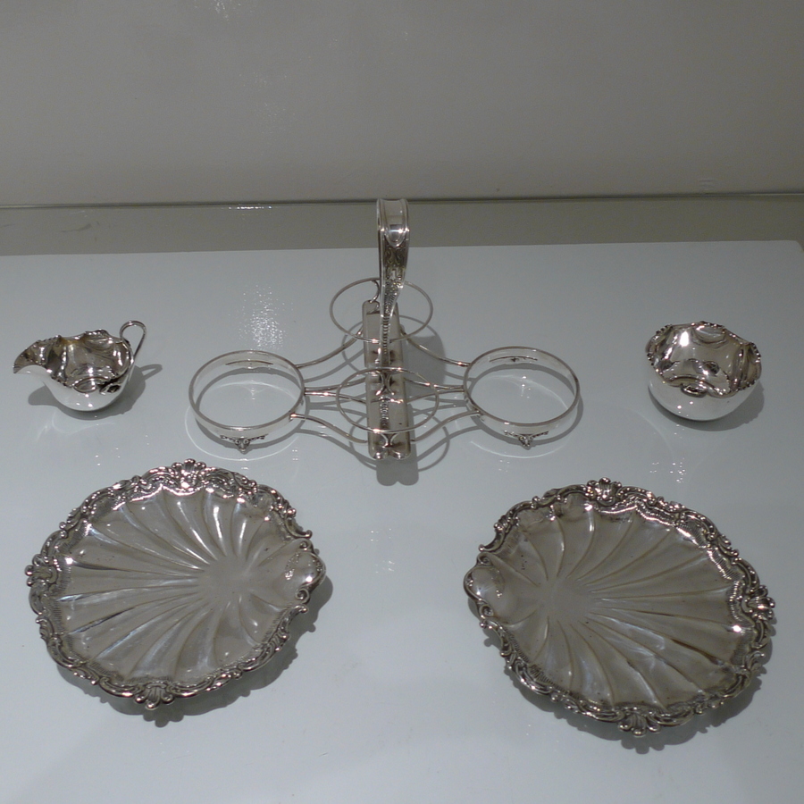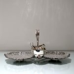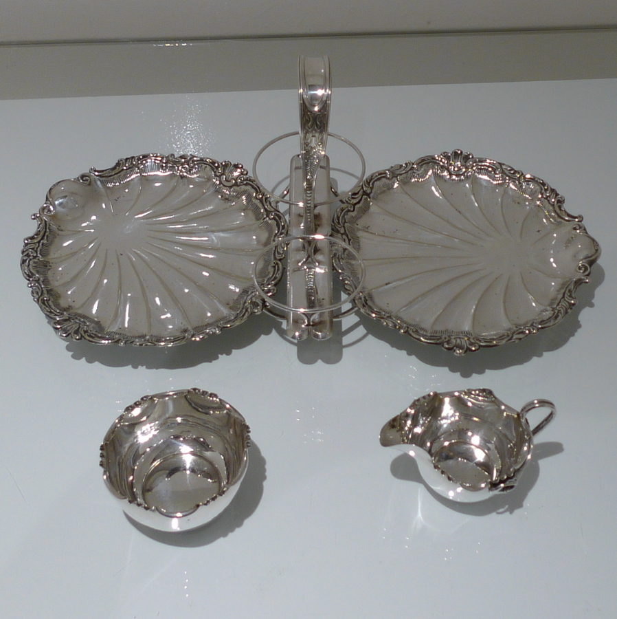 A splendid late Victorian silverplated strawberry dish designed with two detachable “leaf” style naturalistic plates. Â The decorative central handle is surrounded by elegant plain formed sugar bowl and cream jug.