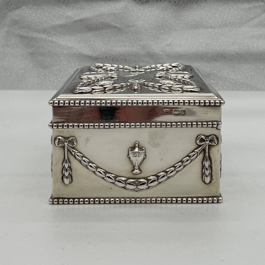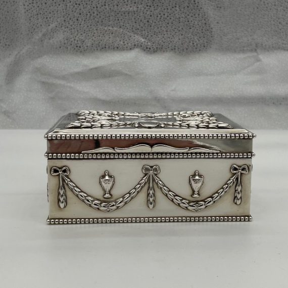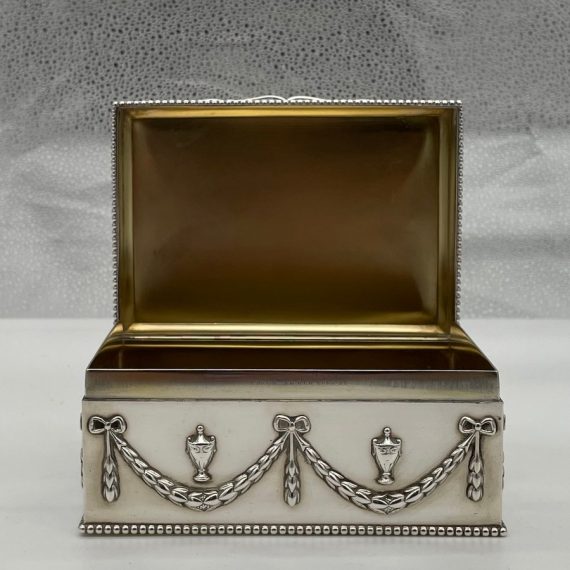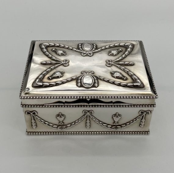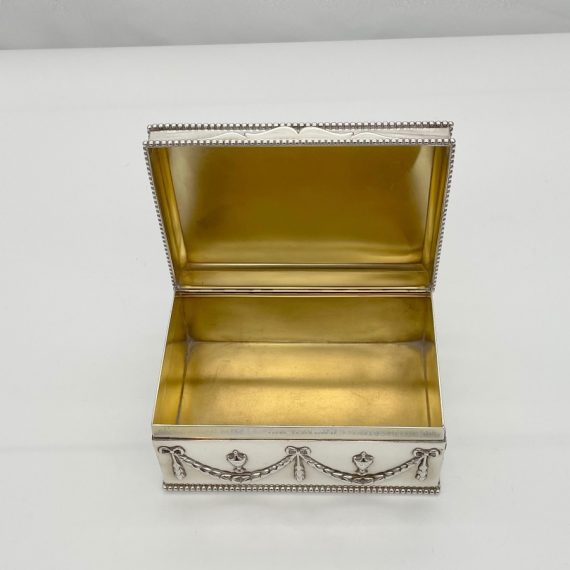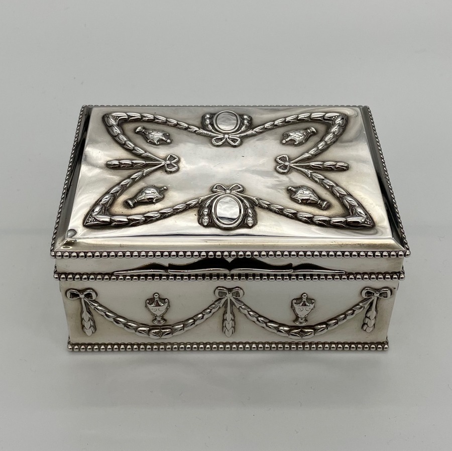 A wonderful Victorian silver bead bordered box designed by the highly collectable silversmith Edward H Stockwell. Â The hinged lid has a delightful butterfly style shaped cartouche and the walls have beautiful hanging garlands and urn motifs. Â The interior of the box has been gilded.