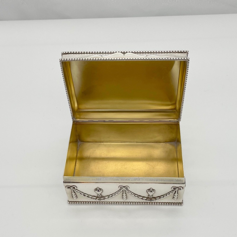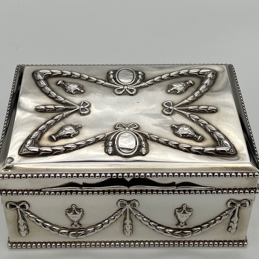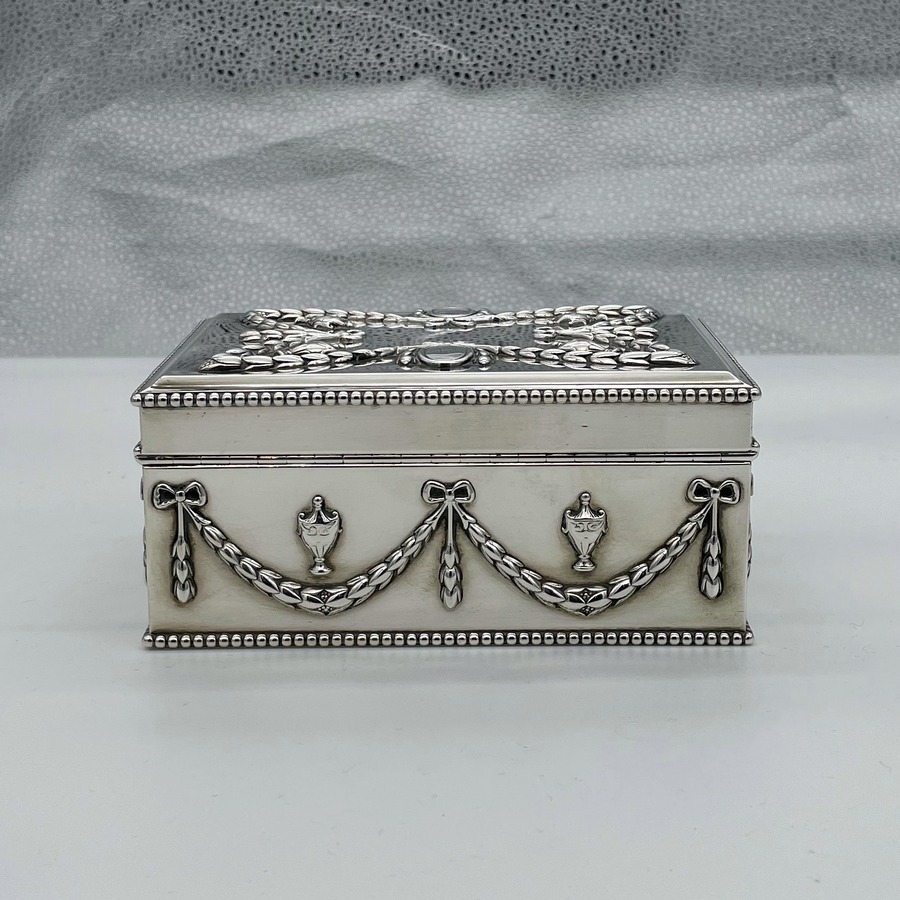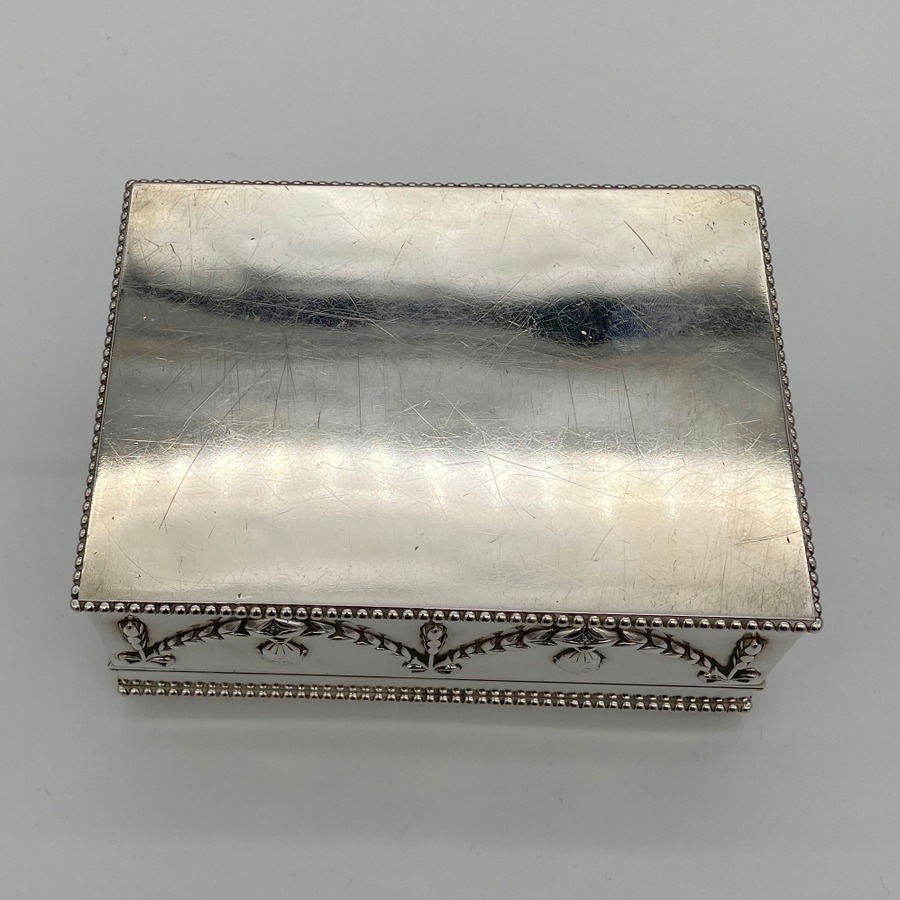 A wonderful Victorian silver bead bordered box designed by the highly collectable silversmith Edward H Stockwell. Â The hinged lid has a delightful butterfly style shaped cartouche and the walls have beautiful hanging garlands and urn motifs. Â The interior of the box has been gilded.