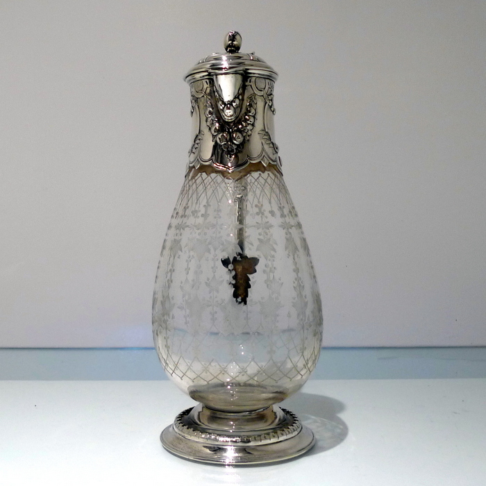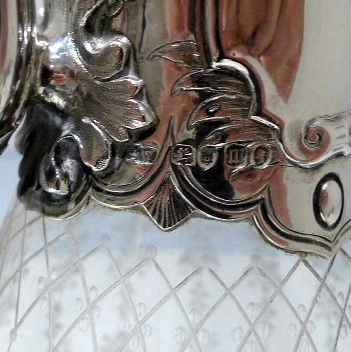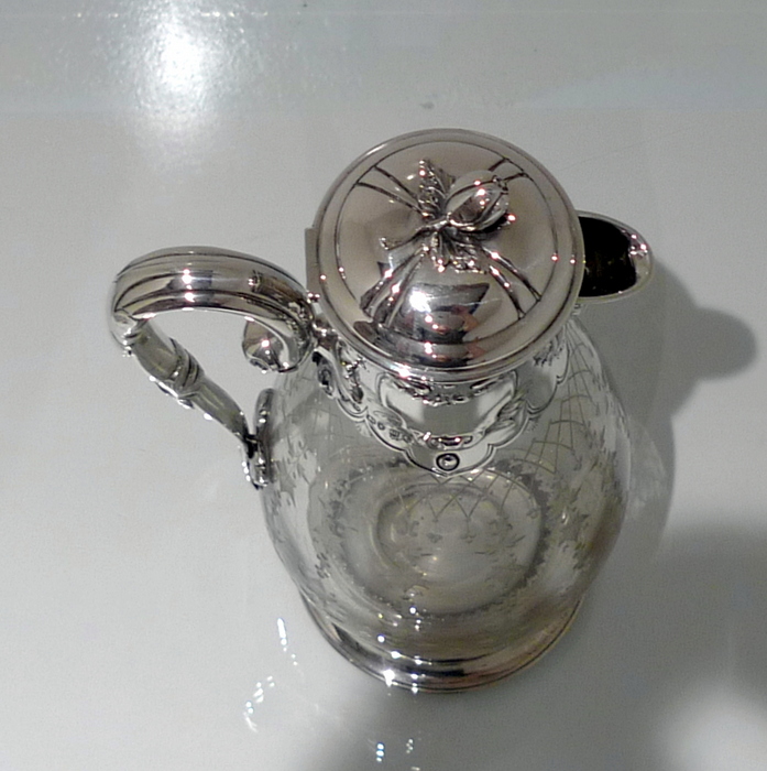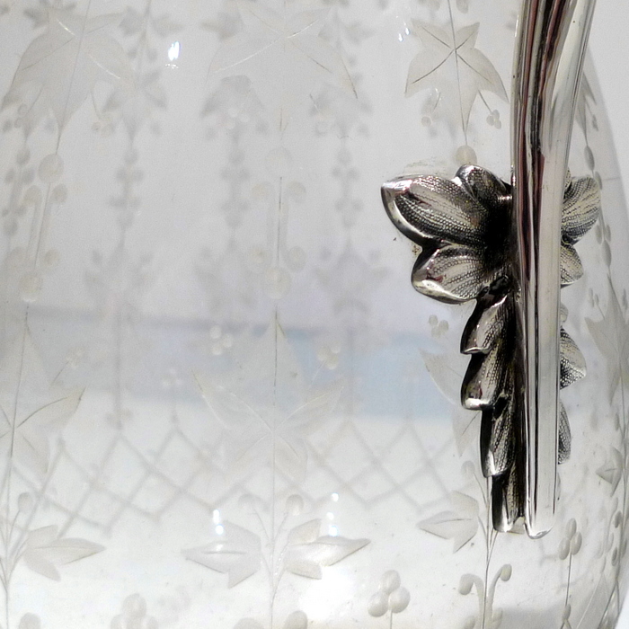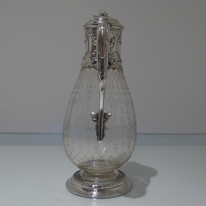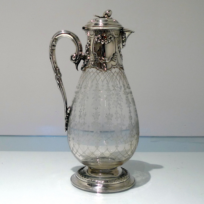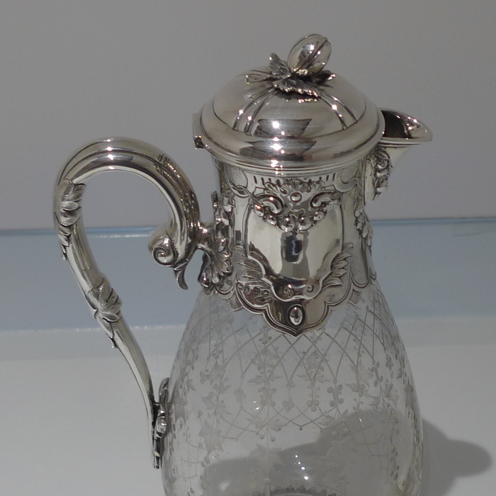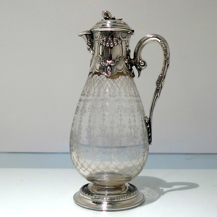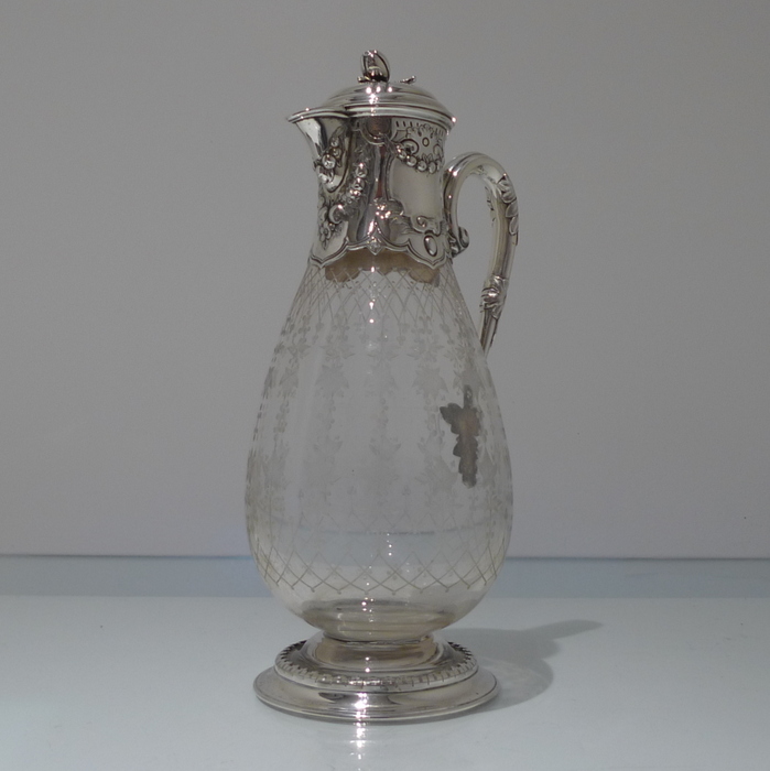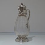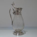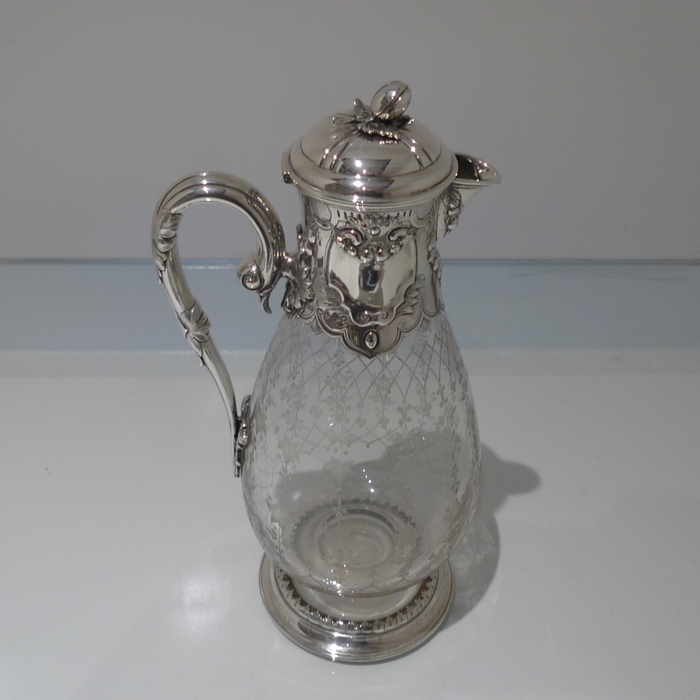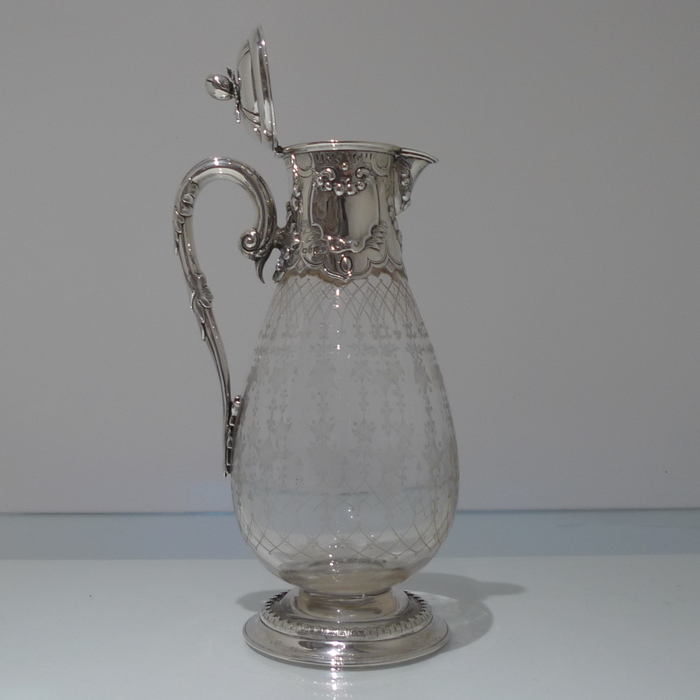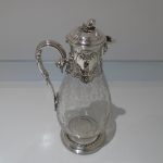 A splendid and extremely rare model of a Victorian silver and crystal claret jug. Â The mount has ornate embossed workmanship for highlights. Â The bowl has intricate etching for decoration and sits on a stylish silver and crystal foot.