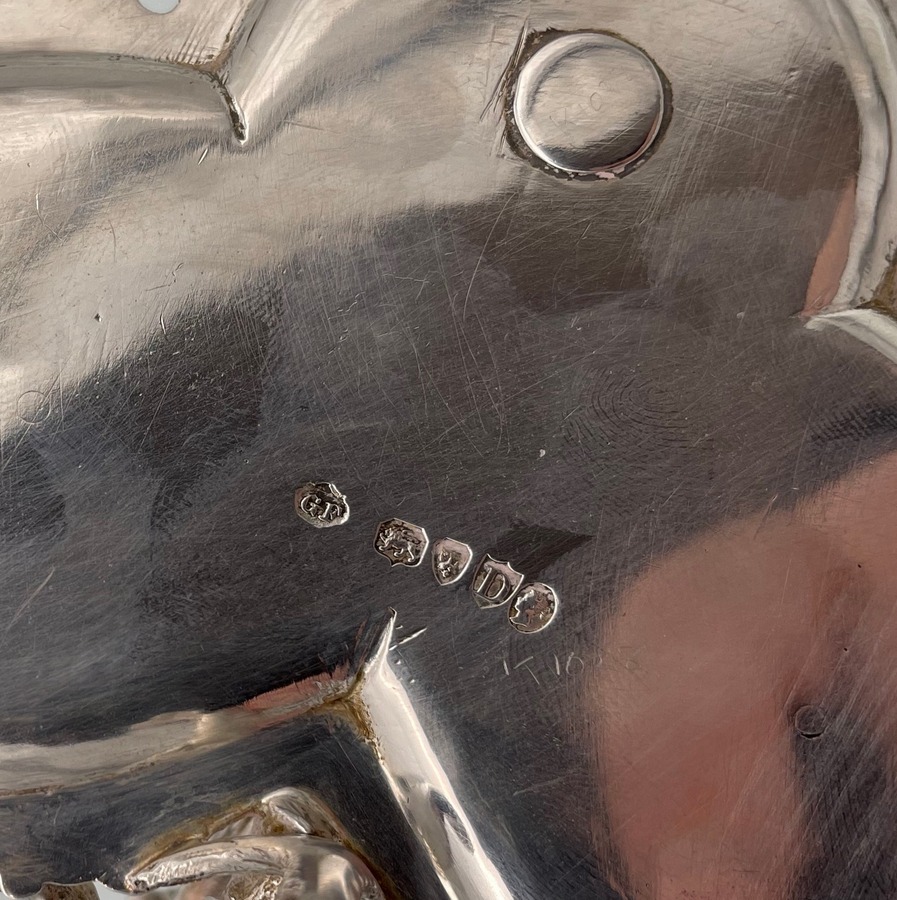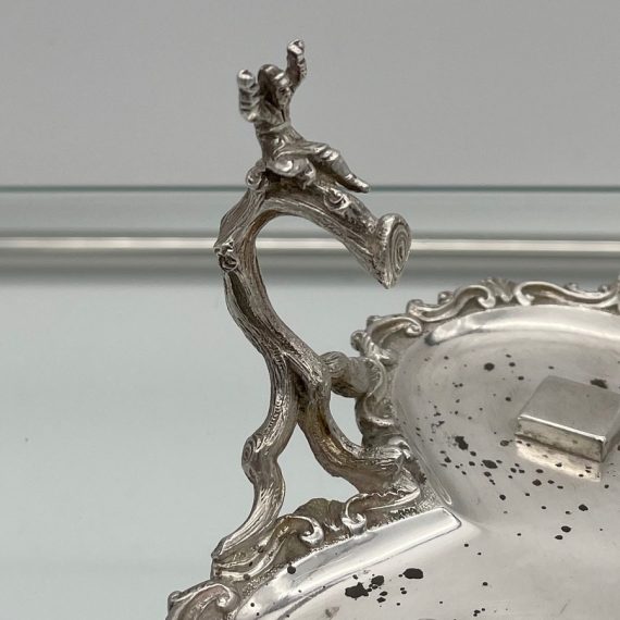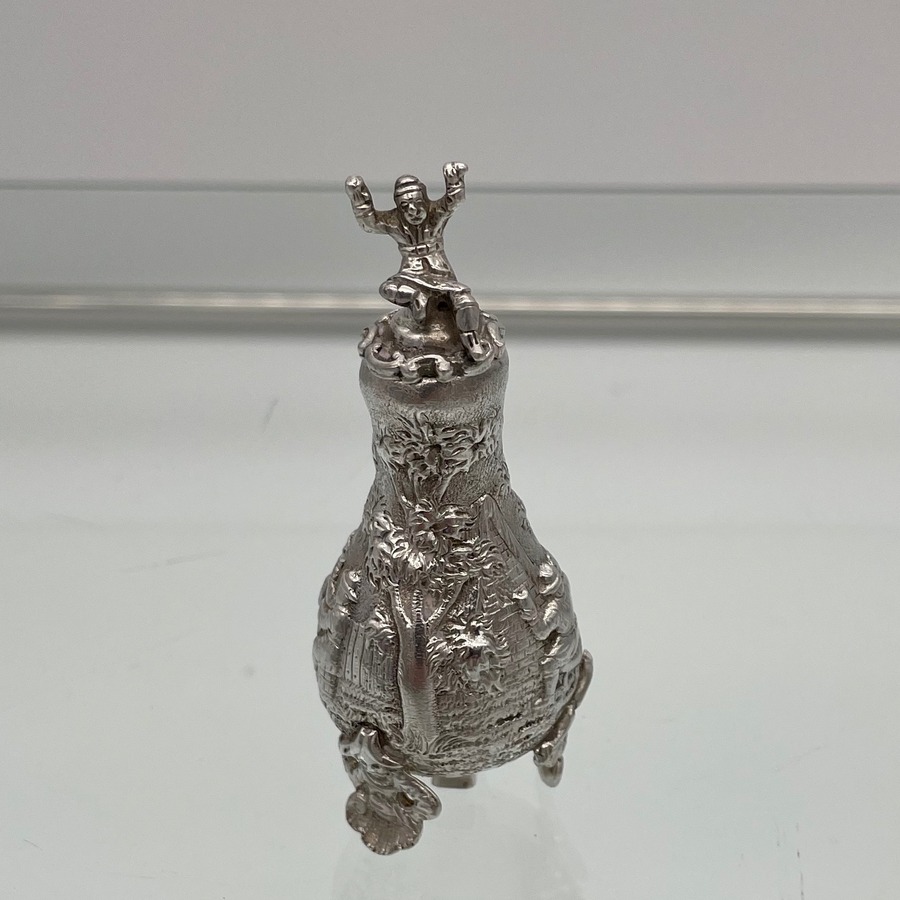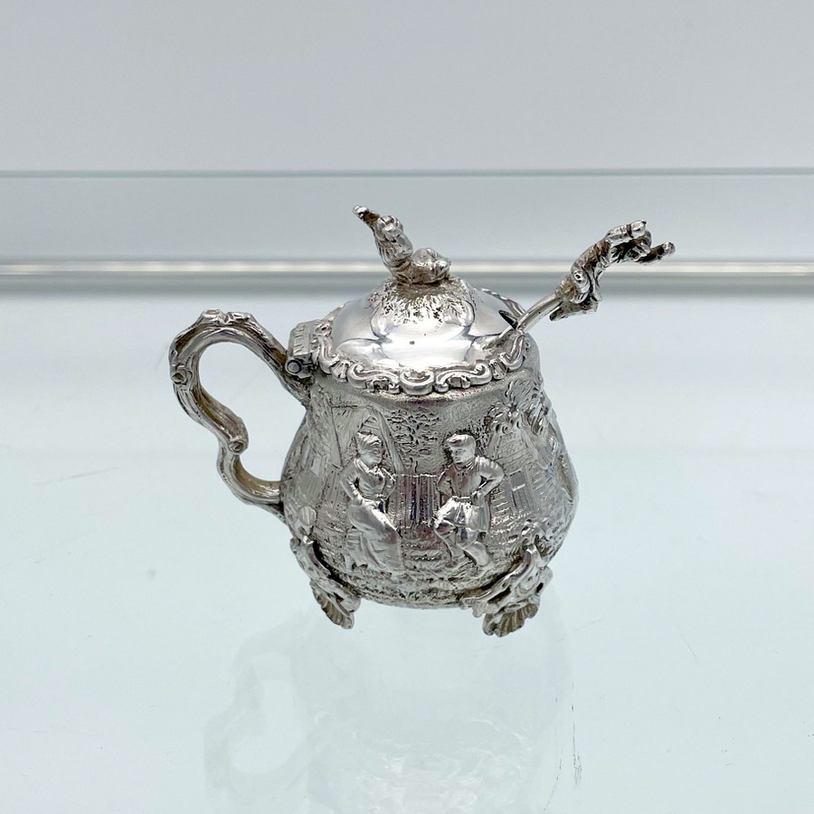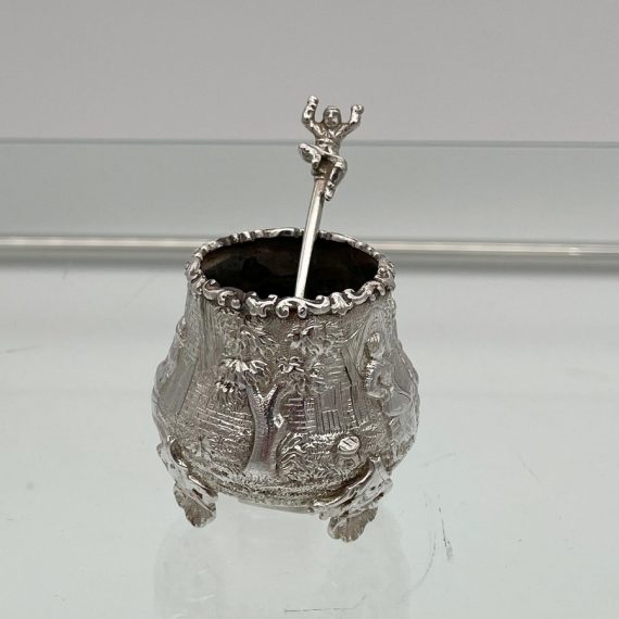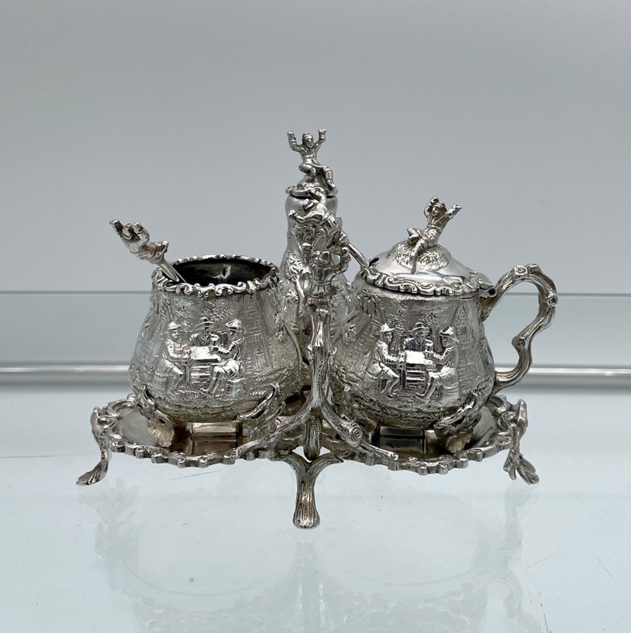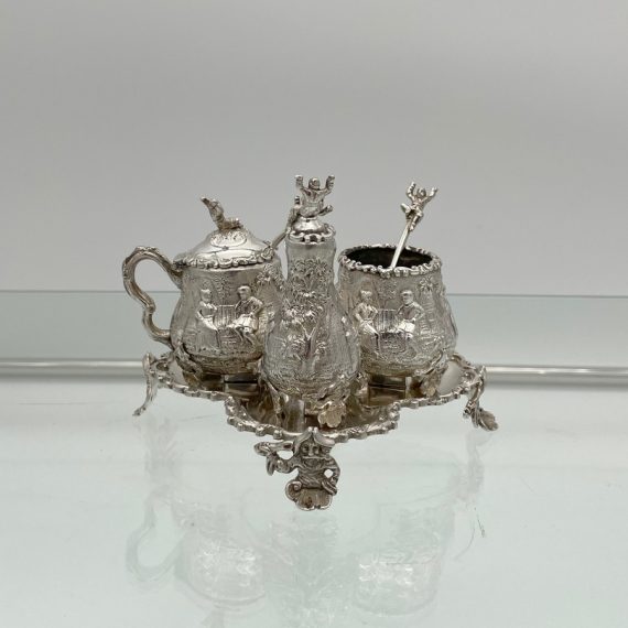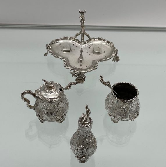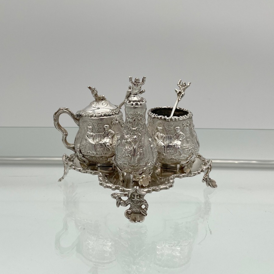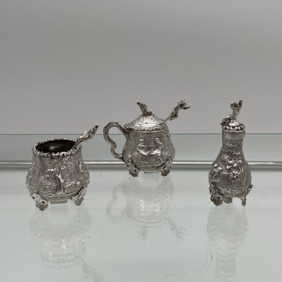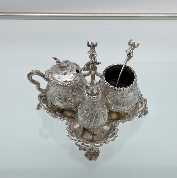 A rare and extremely desirable sterling silver ‘Tenier’ style condiment set mounted on an elegant trefoil stand. Â The detachable serving pieces have beautiful embellished (Teniers) scenes.