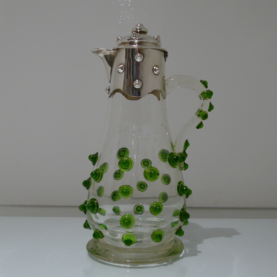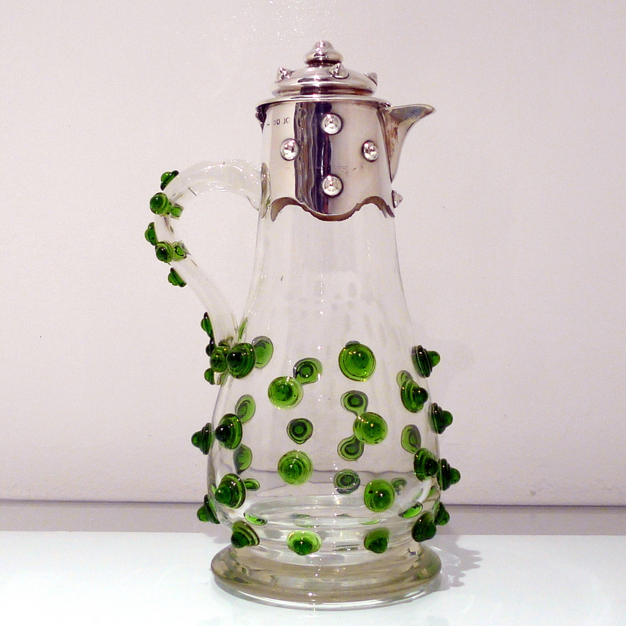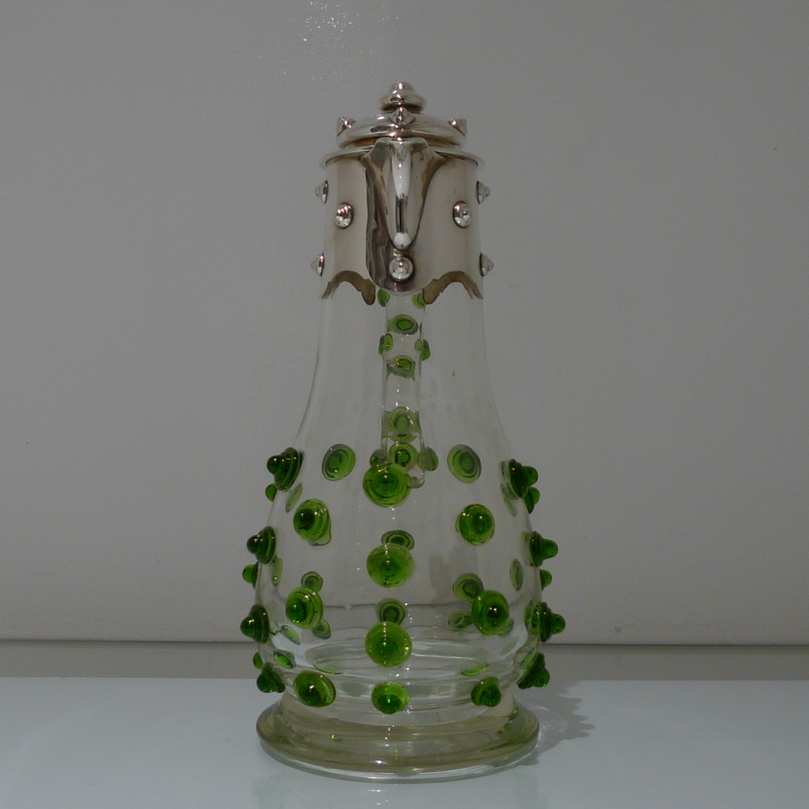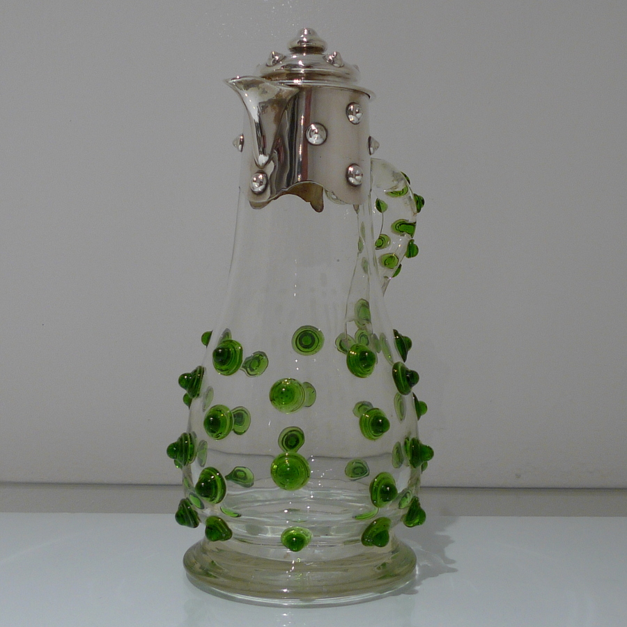 A very rare and highly unusual pre-art nouveau movement silver and crystal claret jug. Â The hinged mount is decorated with stylish interspaced domed buttons which complement the clear glass body which has additional interspaced domed green buttons for lowlights.