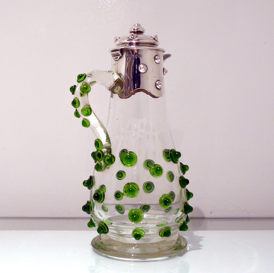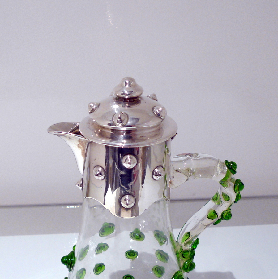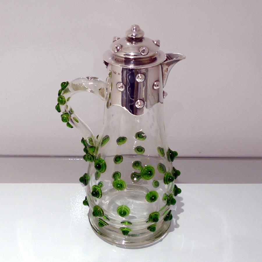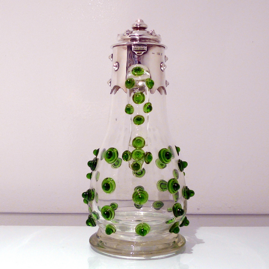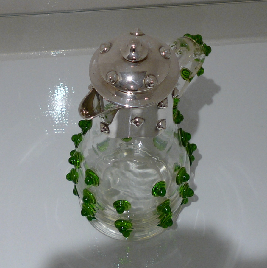 A very rare and highly unusual pre-art nouveau movement silver and crystal claret jug. Â The hinged mount is decorated with stylish interspaced domed buttons which complement the clear glass body which has additional interspaced domed green buttons for lowlights.
