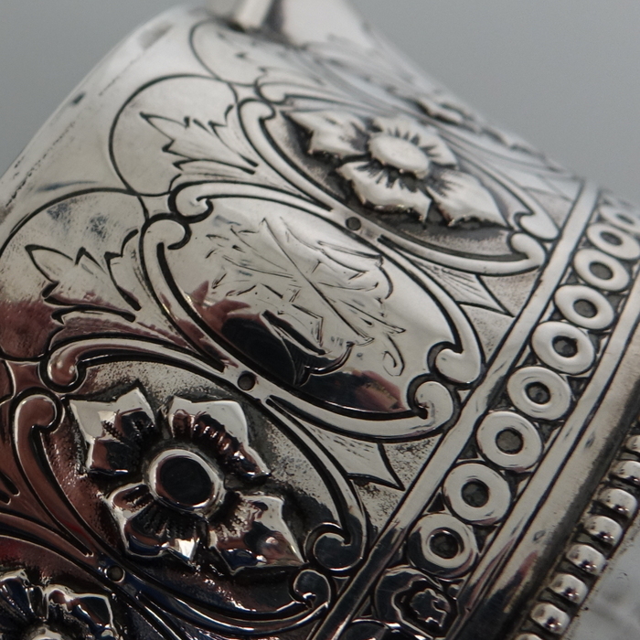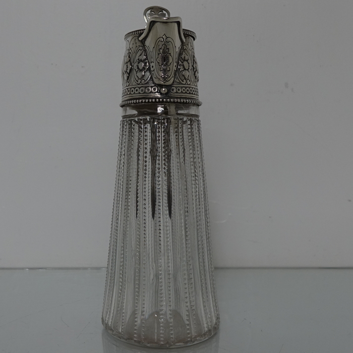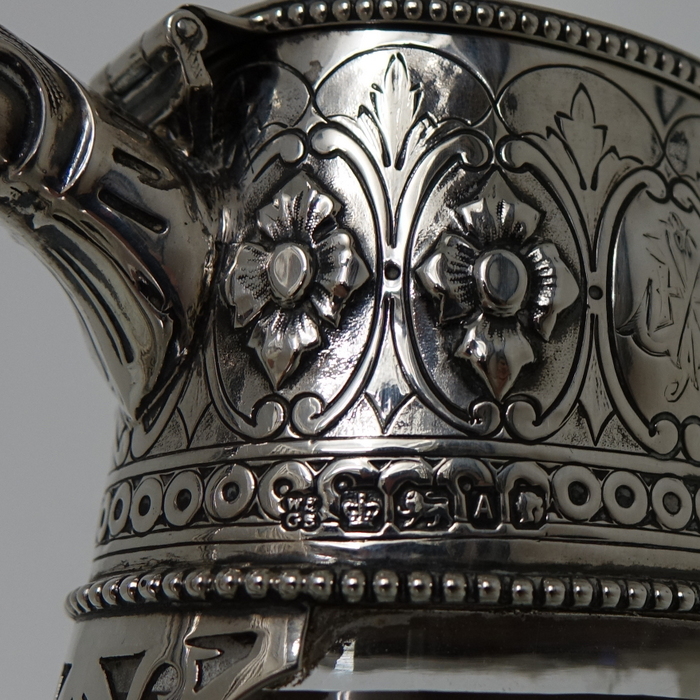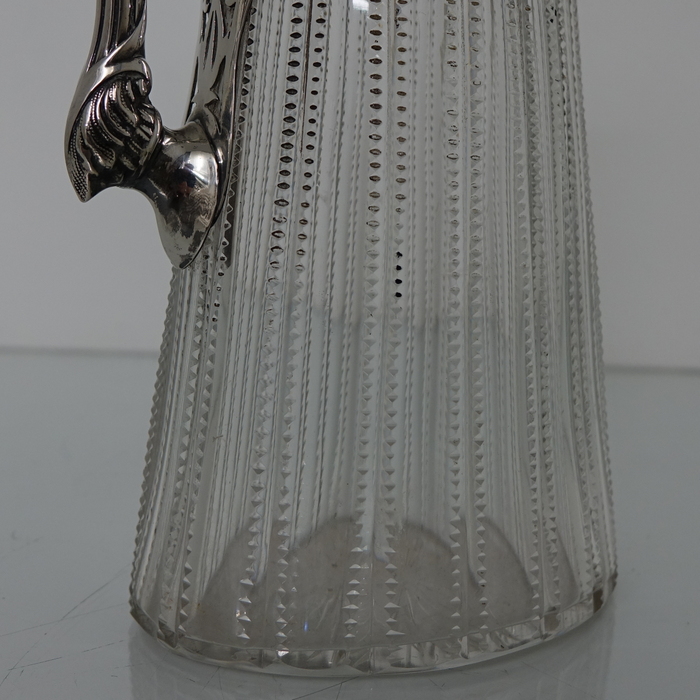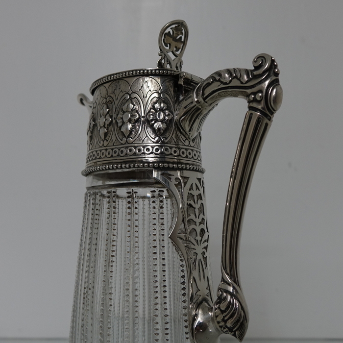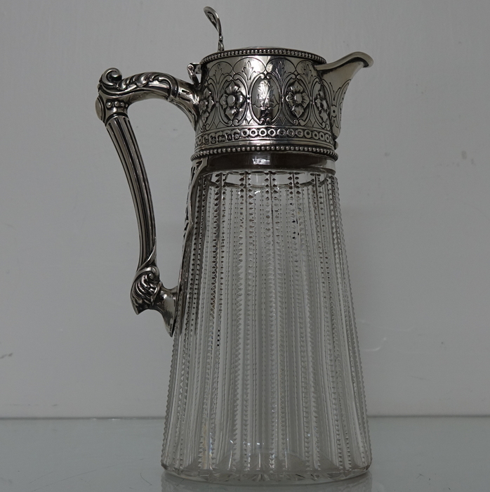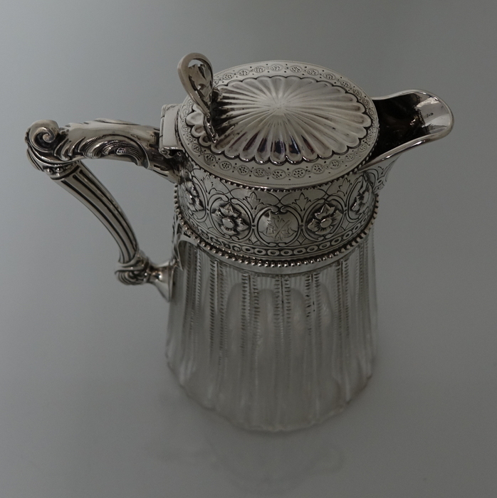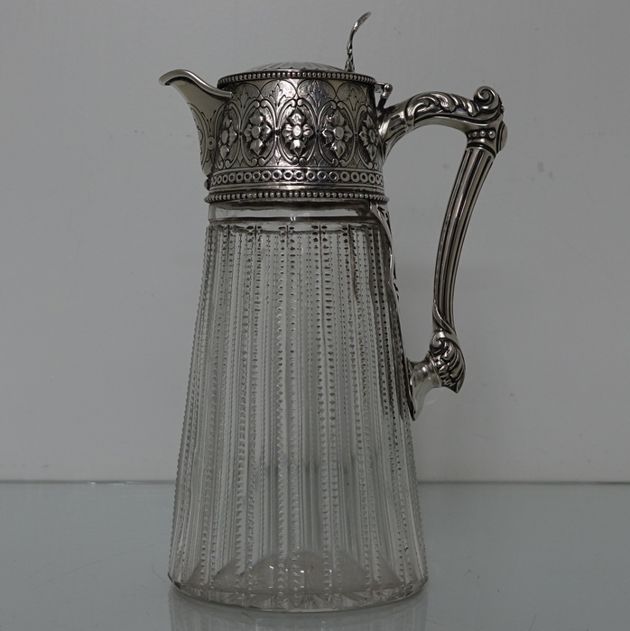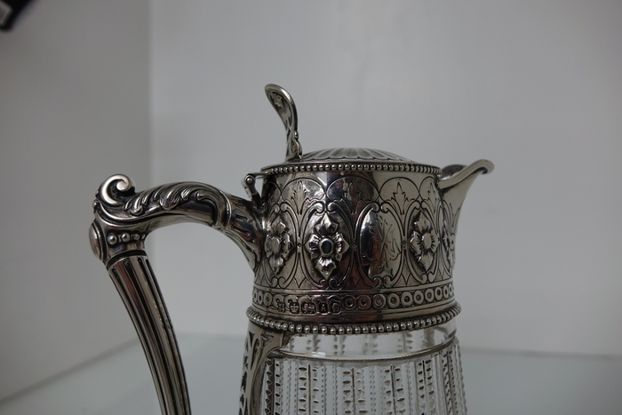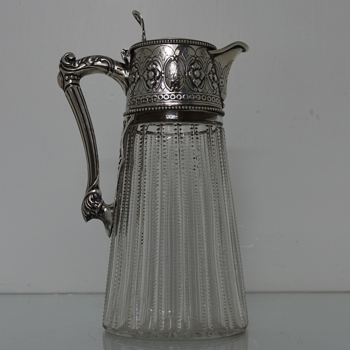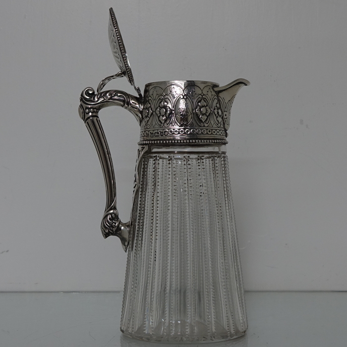 A very beautiful oval formed silver and crystal claret jug, elegantly embossed with a upper and lower bead border for highlights. Â The lid of the jug is hinged and is crowned with an elegant thumb piece. Â The crystal body is stylishly fluted in design with pin prick engraving for lowlights. Â There is a script initial for importance.