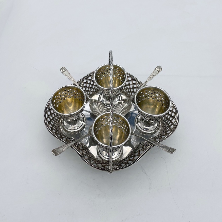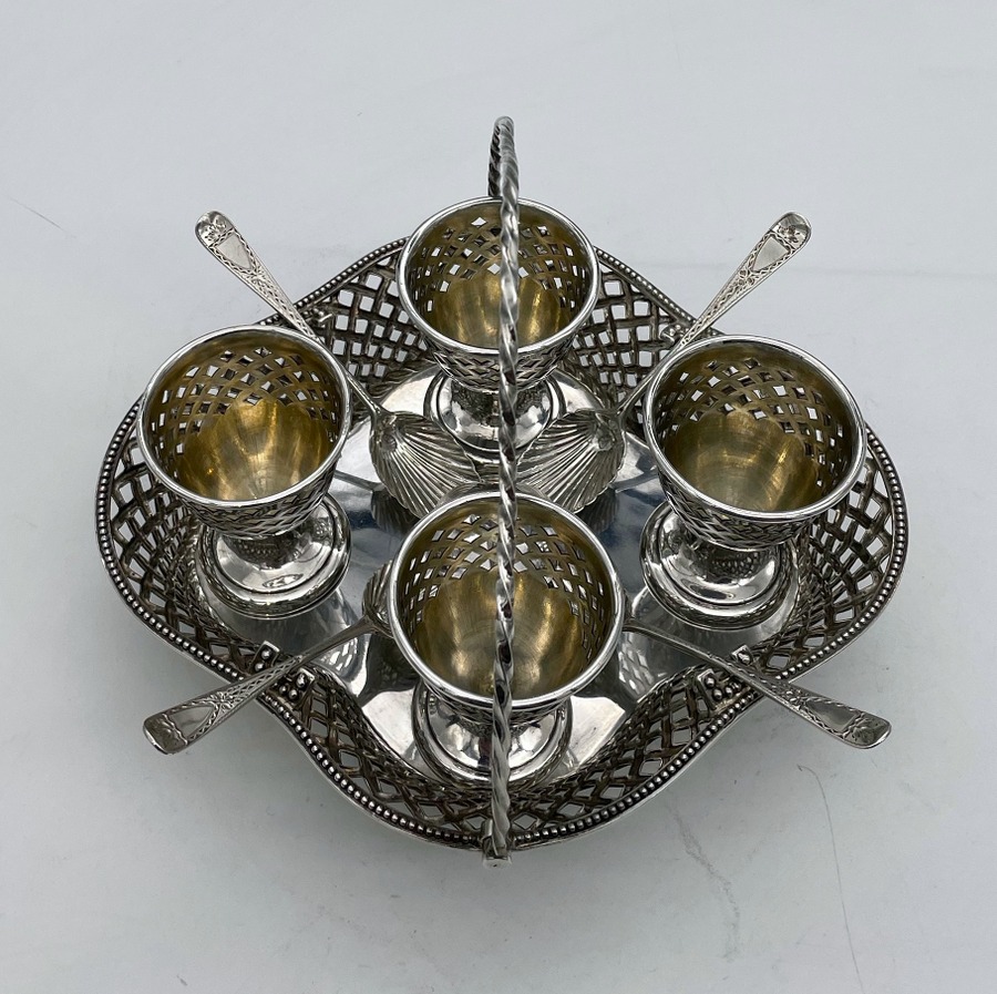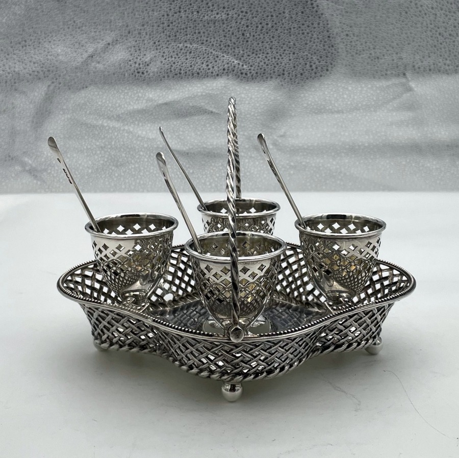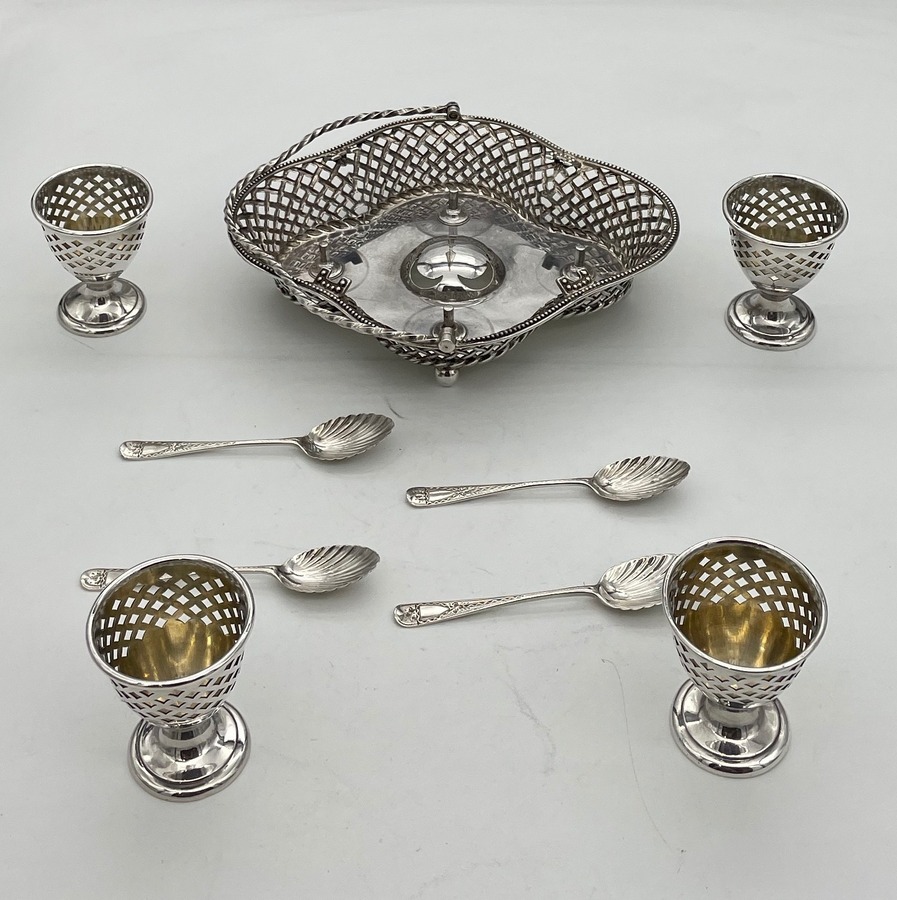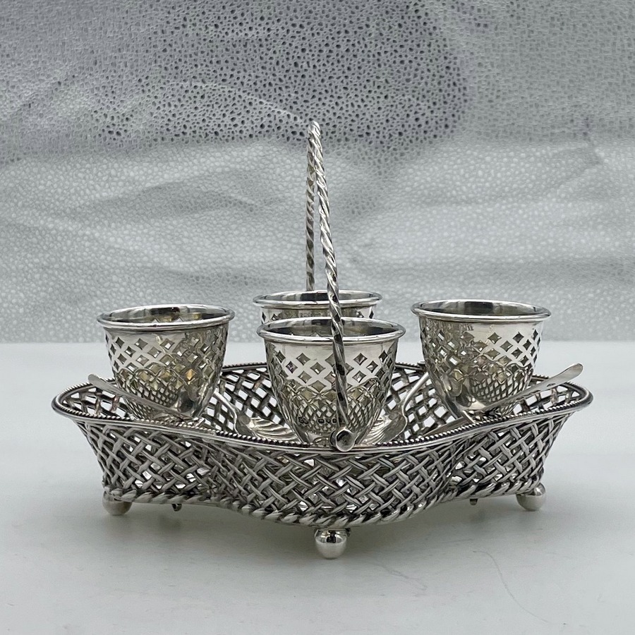 A truly wonderful Victorian silver egg cruet designed with and elegant lattice weaved shaped oval swing handled base with an applied bead border for highlights. The four egg cups have additonal lattice piercing and there is a contemporary crest for importance.