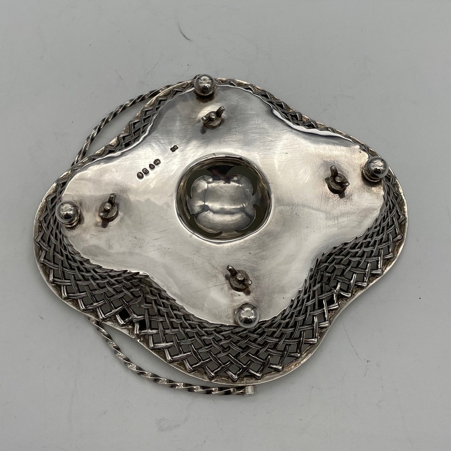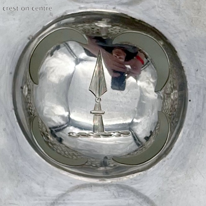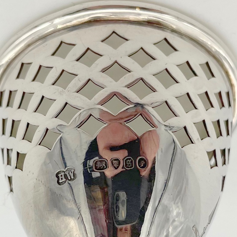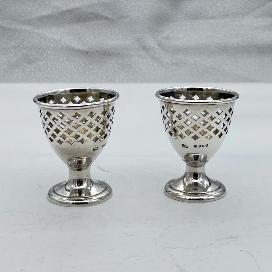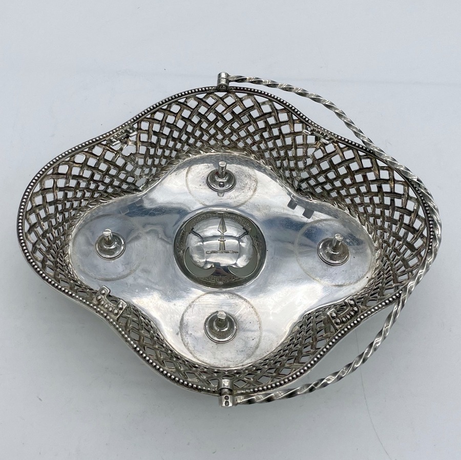 A truly wonderful Victorian silver egg cruet designed with and elegant lattice weaved shaped oval swing handled base with an applied bead border for highlights. The four egg cups have additonal lattice piercing and there is a contemporary crest for importance.