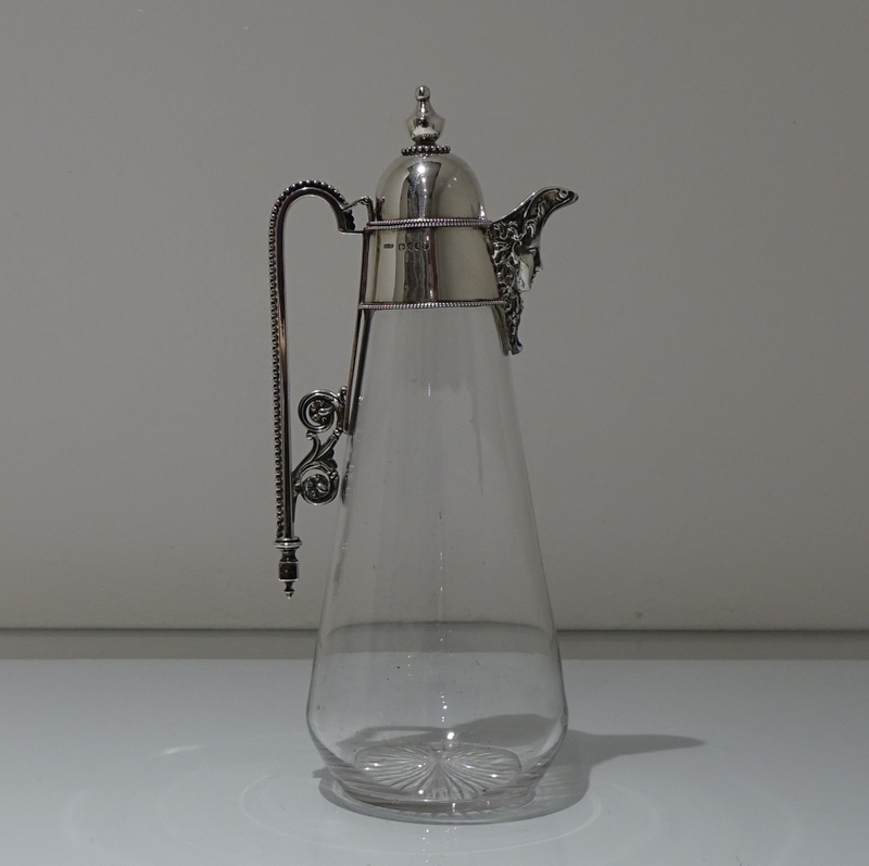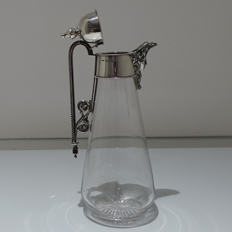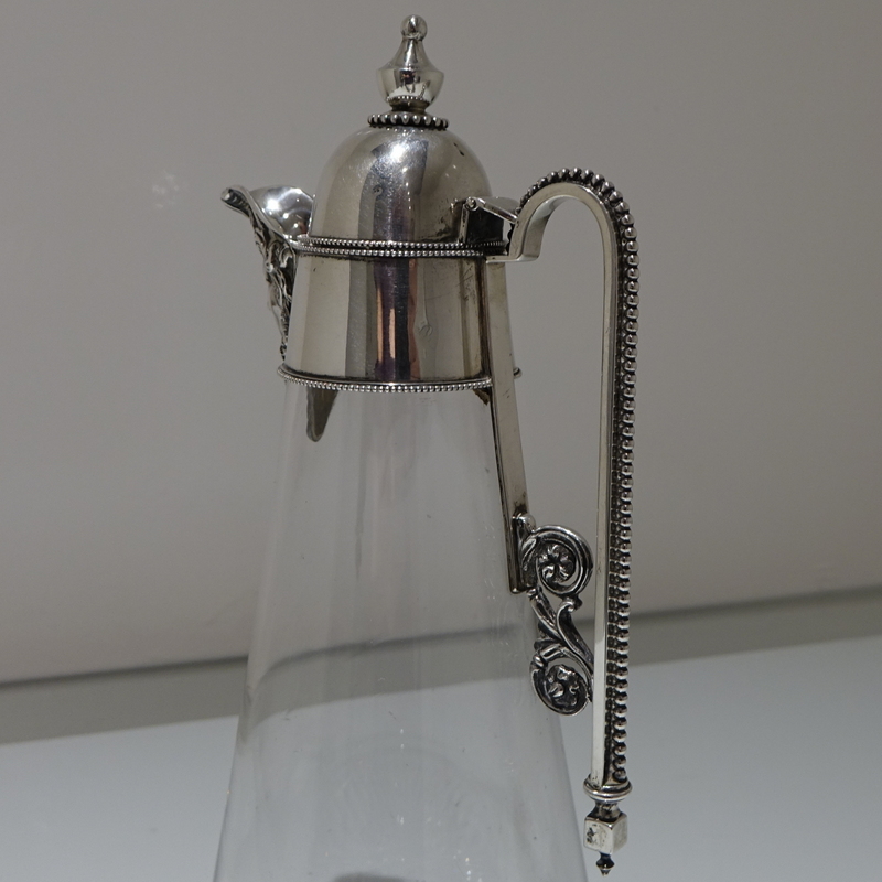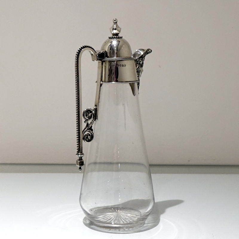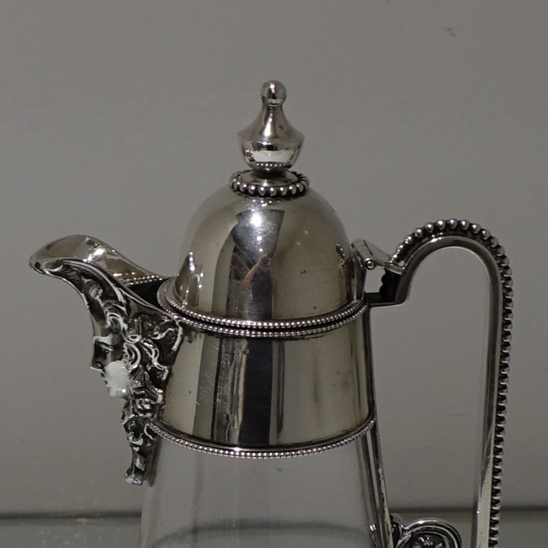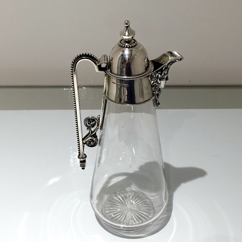 A very elegant 19th century silver claret jug decorated with elegant bead designs. Â The lid is hinged and the spout has been stylishly cast. Â The glass (bowl) is plain formed in design and sits on a elegant “star cut” foot.
