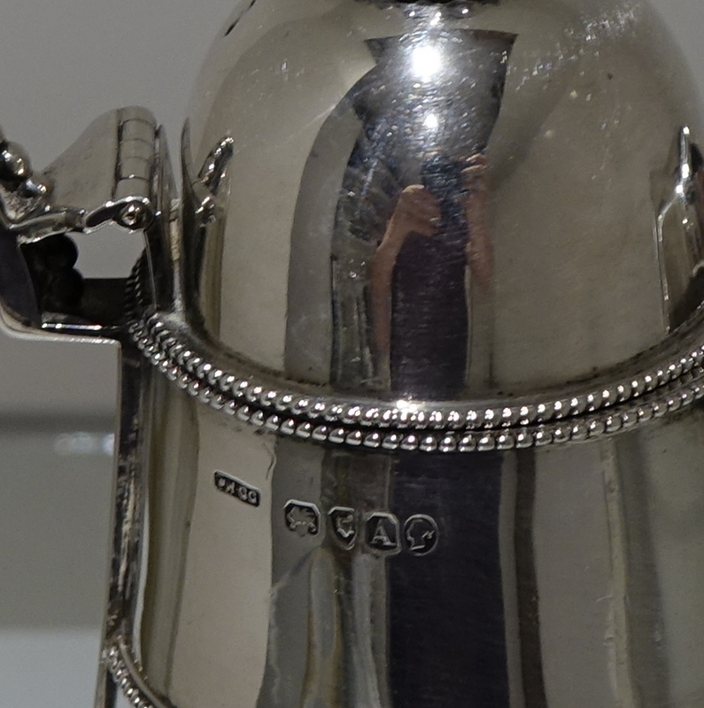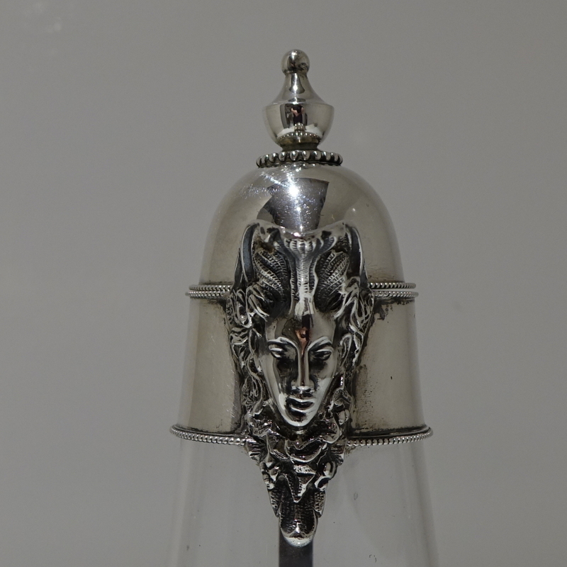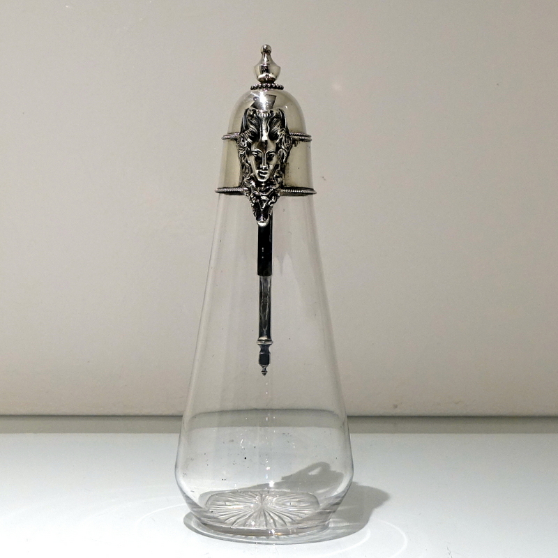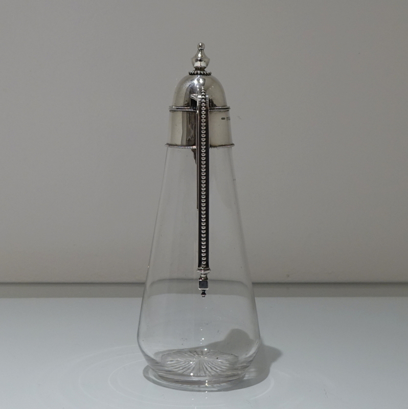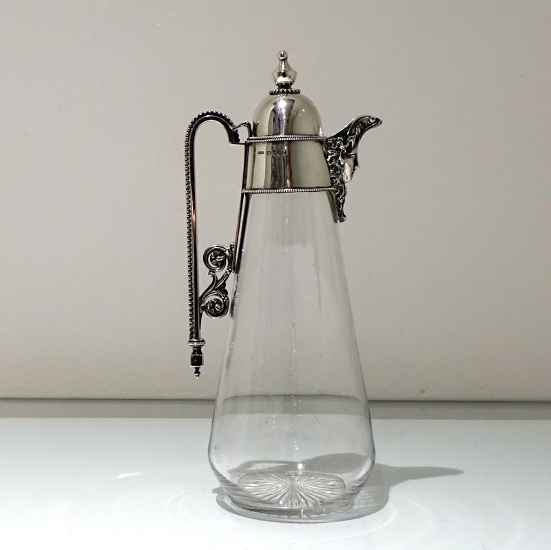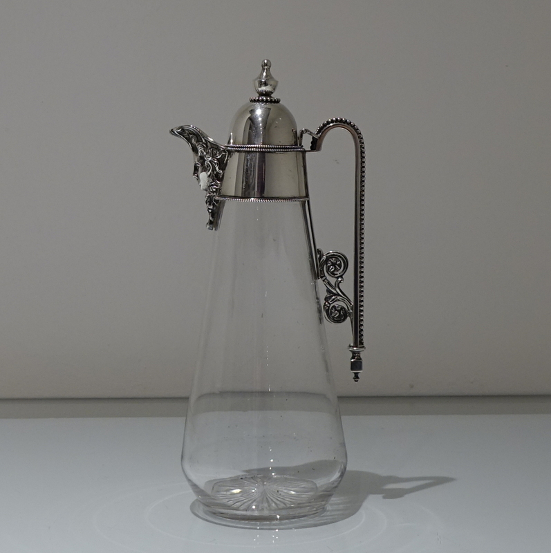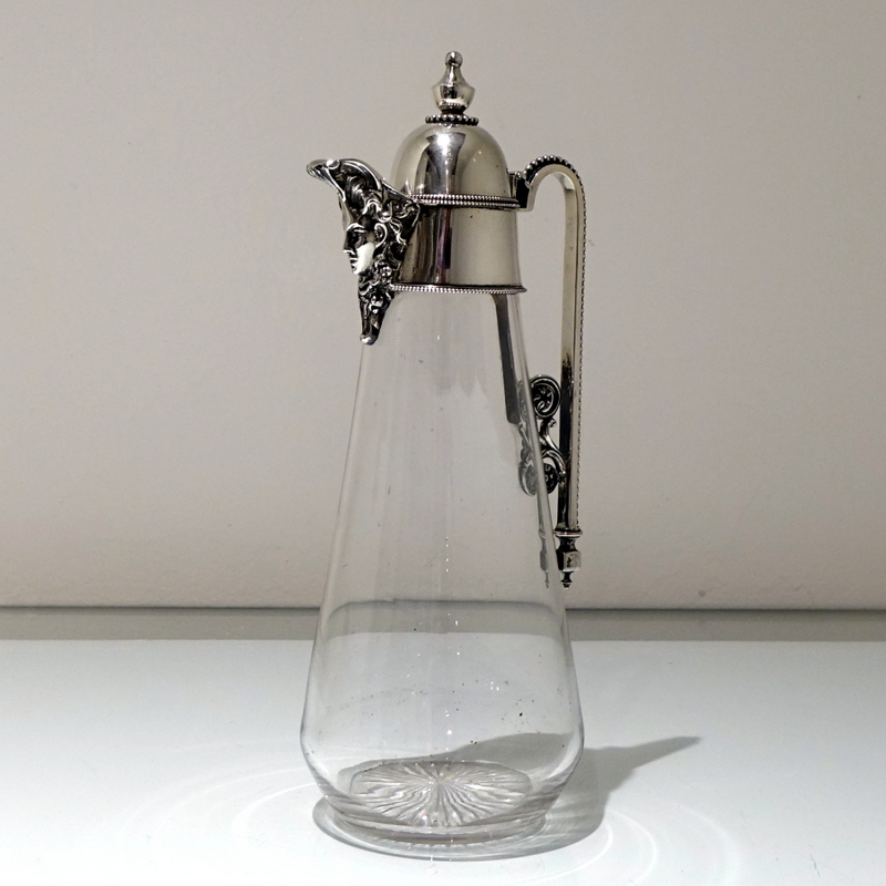 A very elegant 19th century silver claret jug decorated with elegant bead designs. Â The lid is hinged and the spout has been stylishly cast. Â The glass (bowl) is plain formed in design and sits on a elegant “star cut” foot.