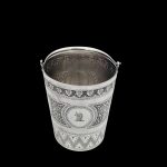 Rare and highly desirable pail themed ice bucket decorated with a host of stunning segmentated engraved designs and a central crested cartouche beautifully capped with a purposeful swing handle.