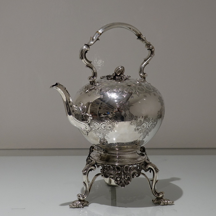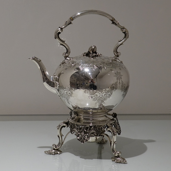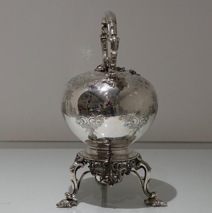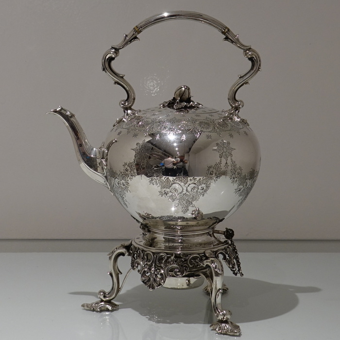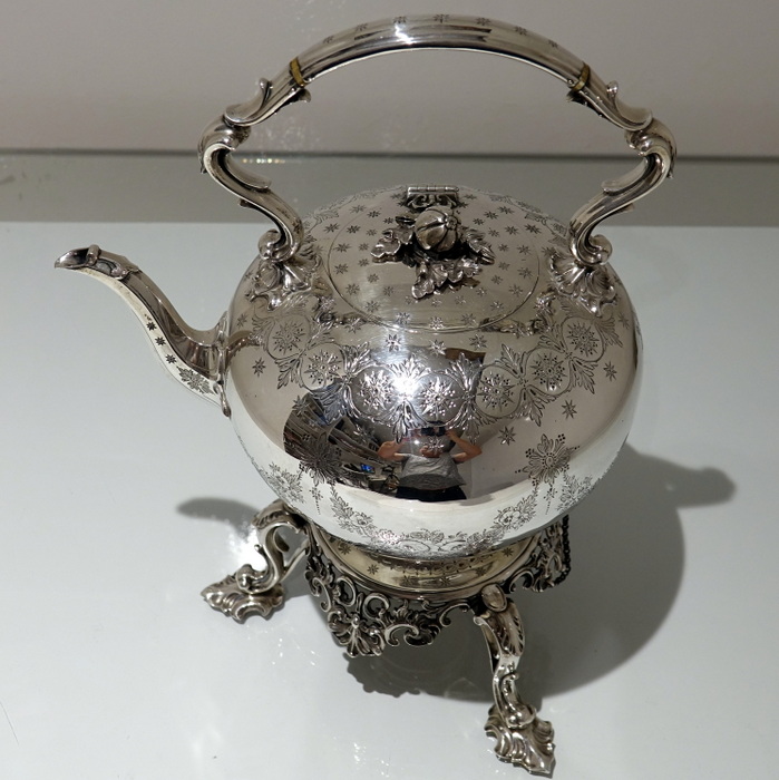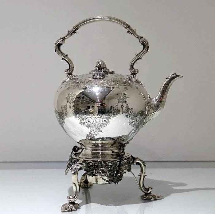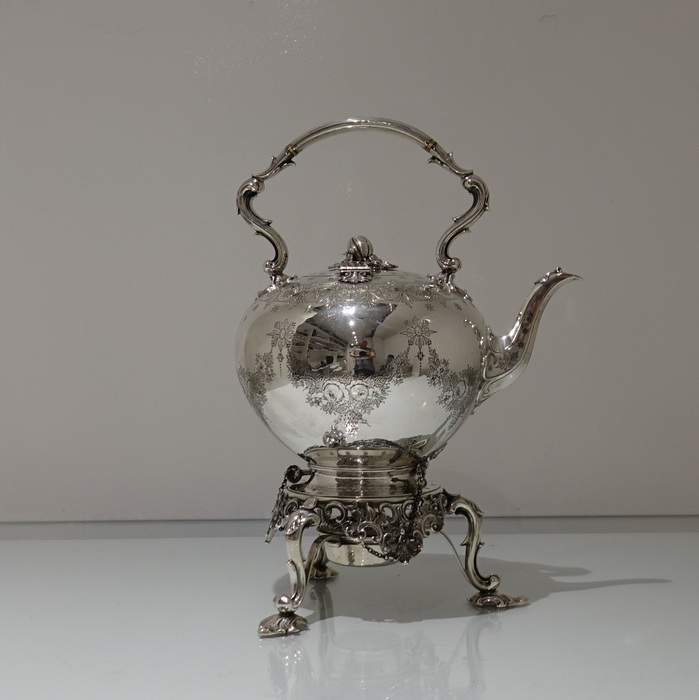 A stunningly beautiful 19th century large spherical tea kettle on detachable stand decorated with elegant bright cut engraving depicting floral hanging garlands. Â The lid and the upper section have additional bright cut engraving and the handle is fixed and has insulators.