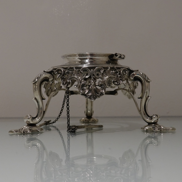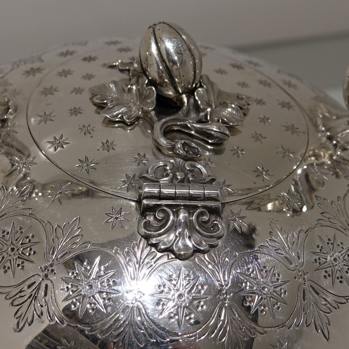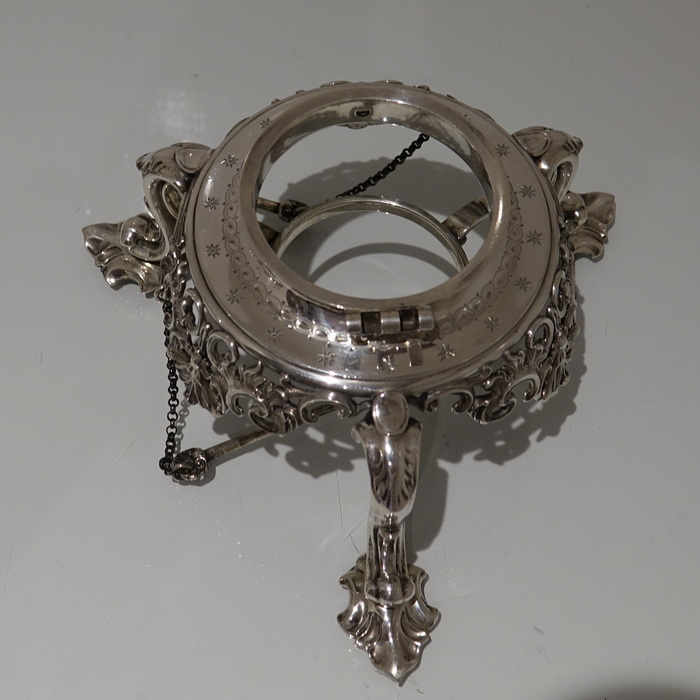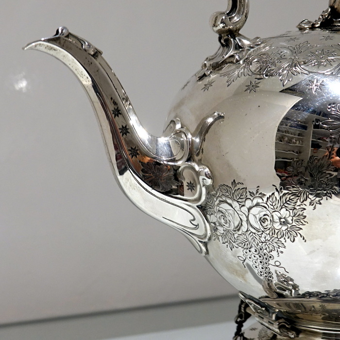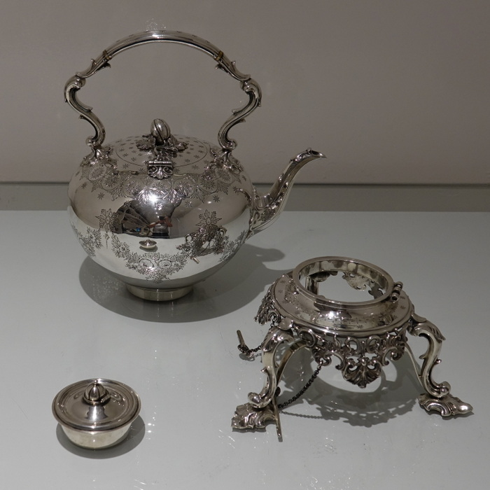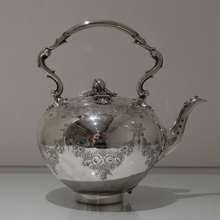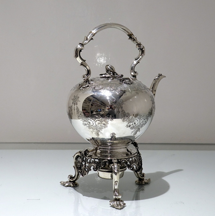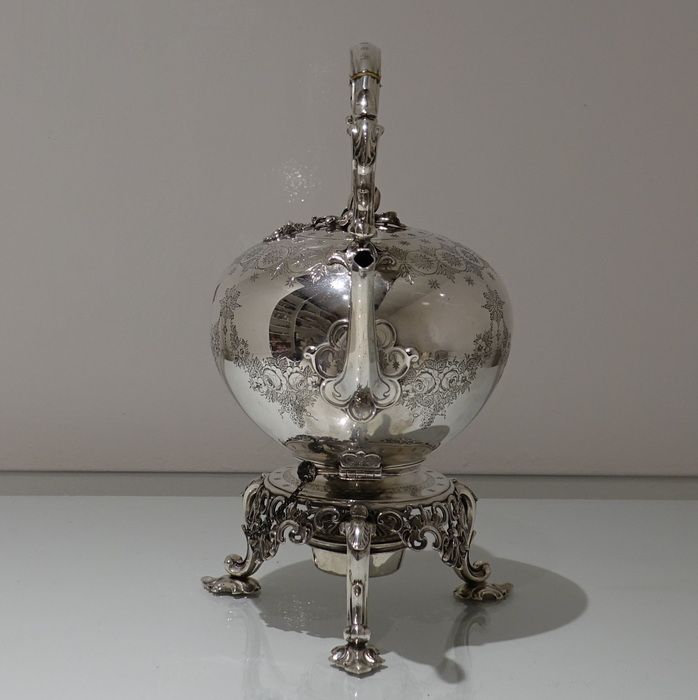 A stunningly beautiful 19th century large spherical tea kettle on detachable stand decorated with elegant bright cut engraving depicting floral hanging garlands. Â The lid and the upper section have additional bright cut engraving and the handle is fixed and has insulators.