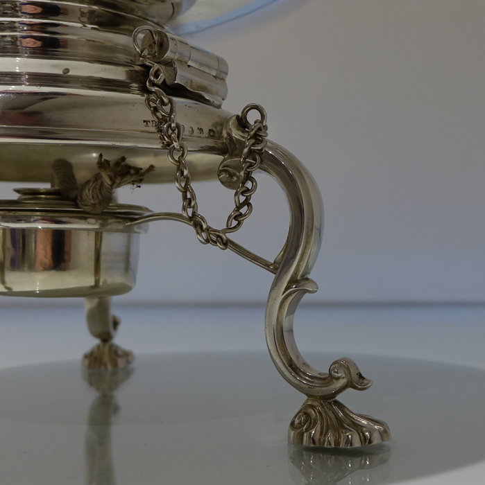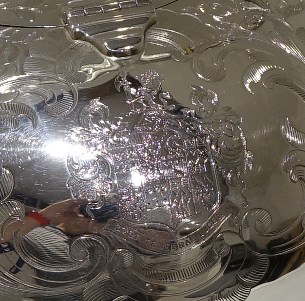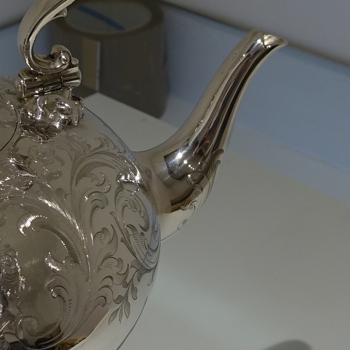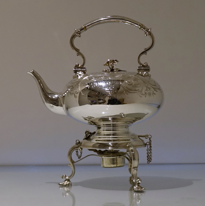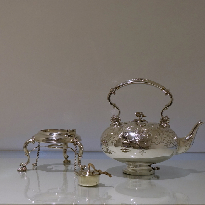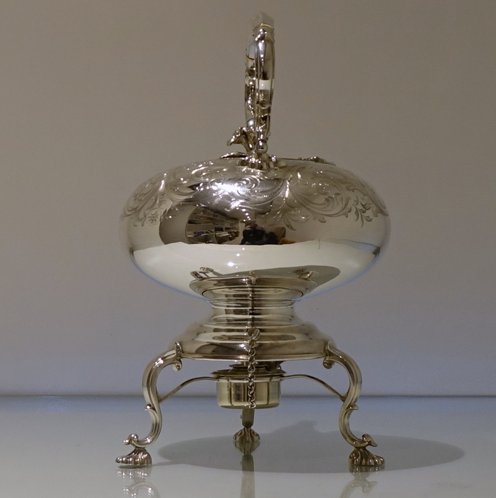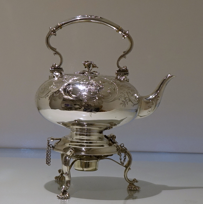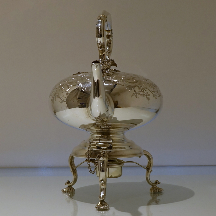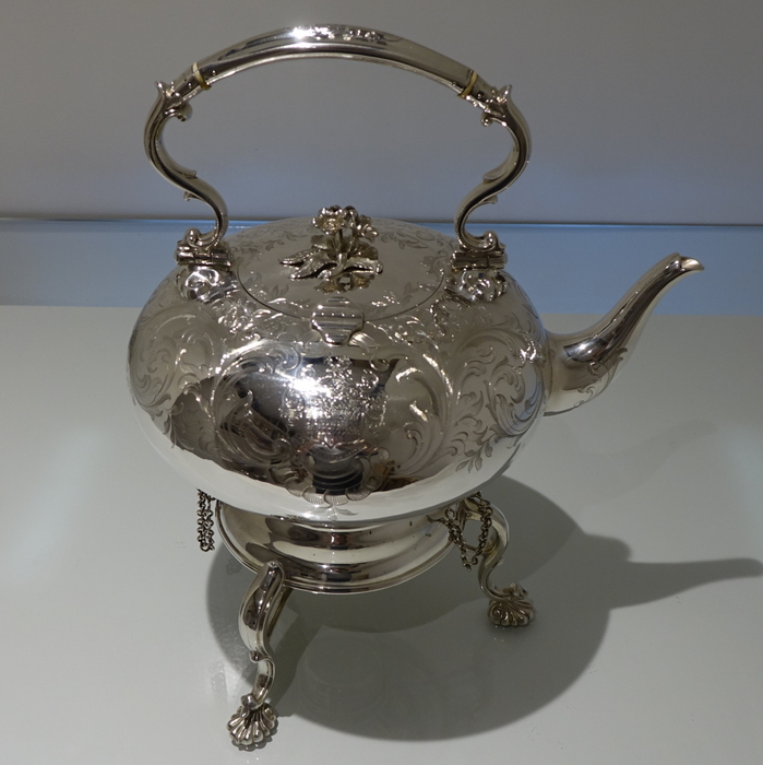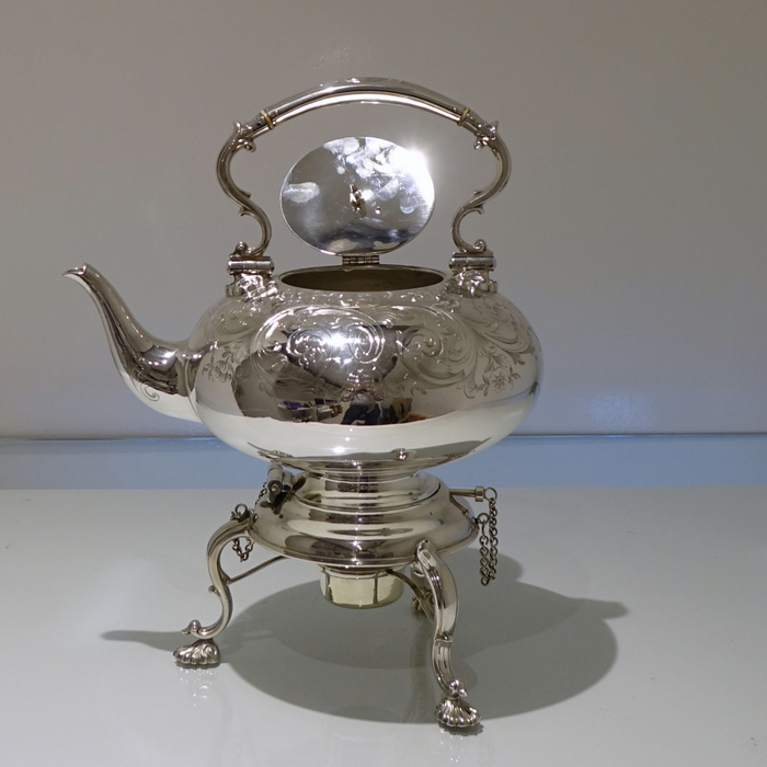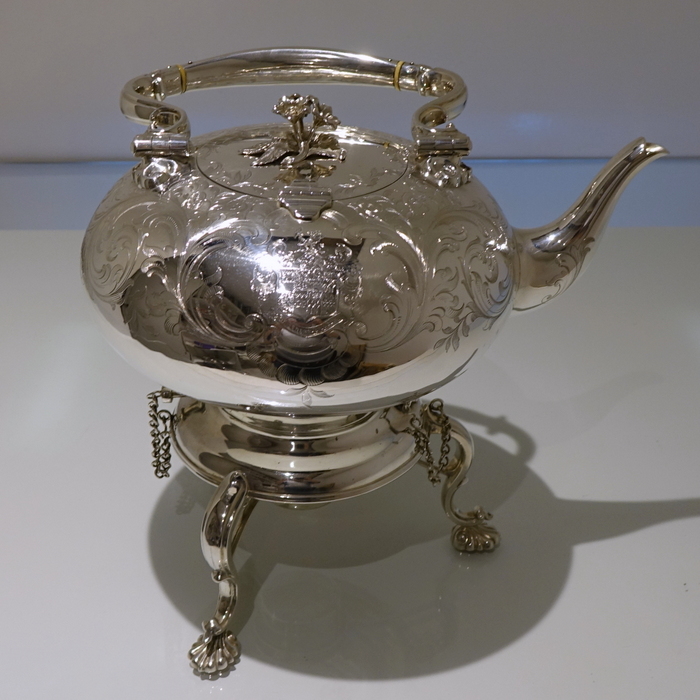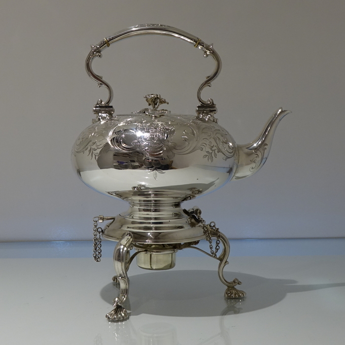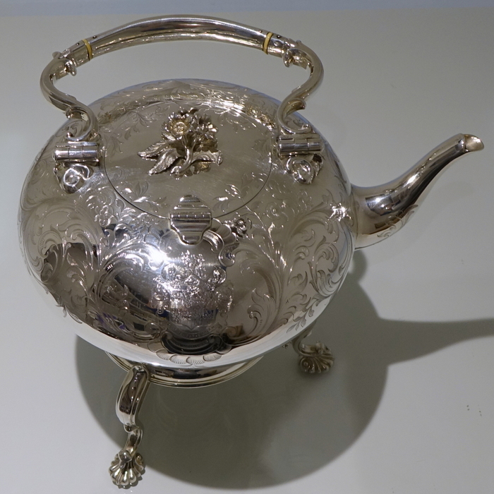 An elegant 19th century compressed spherical kettle decorated with fine intricate floral hand engraving sitting on a plain formed stand for decorative contrasting effect. Â There is a beautiful contemporary armorial for importance.
