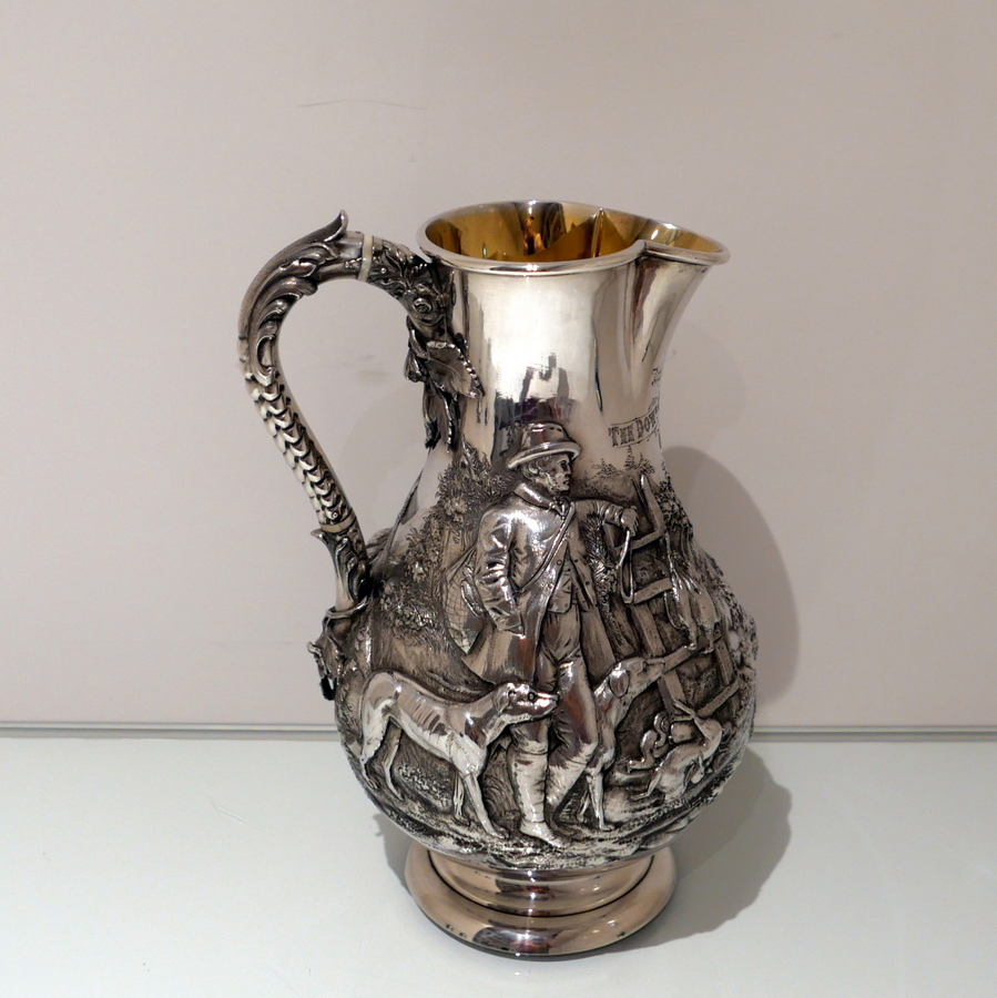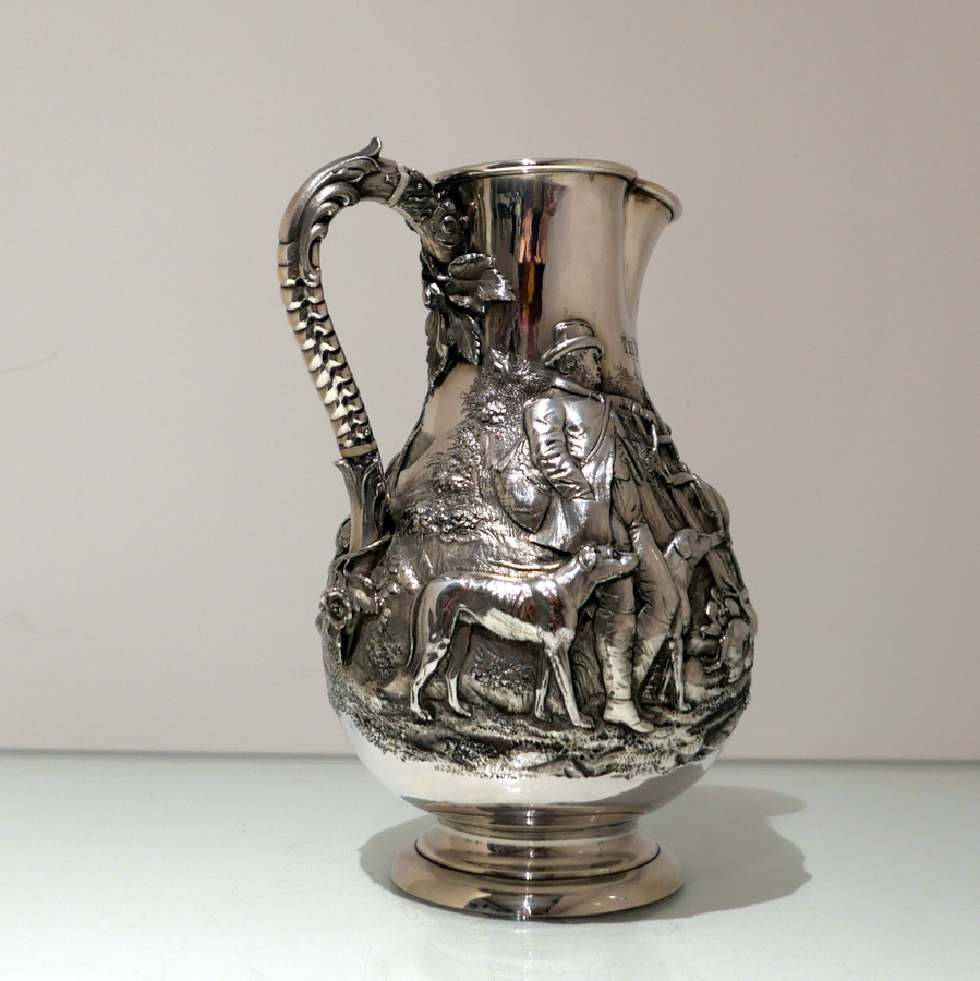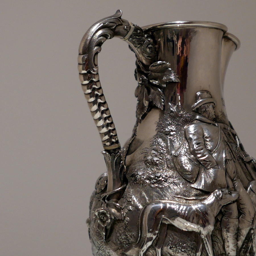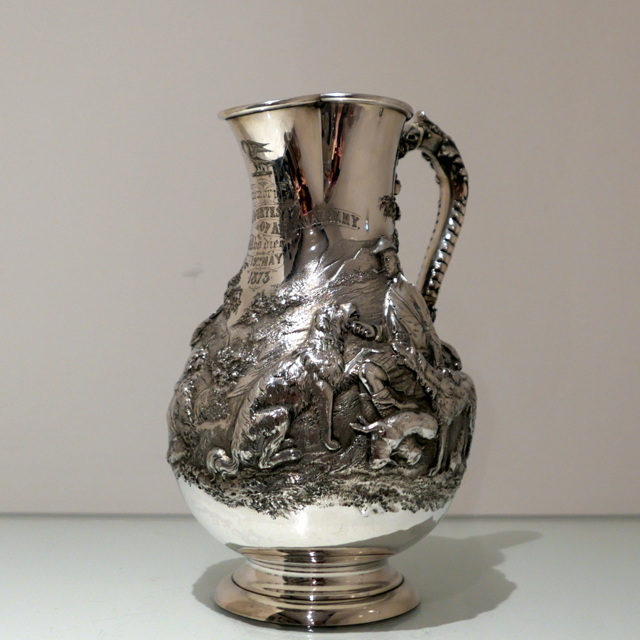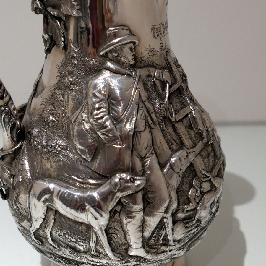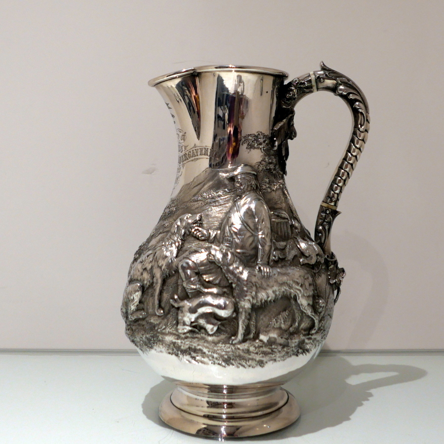 A truly fine large Victorian sterling silver jug decorated with fabulous scenes of wonderful bucolic embellishing. Â The centre front of the neck has a contemporary inscription above which sits a stylish crest.