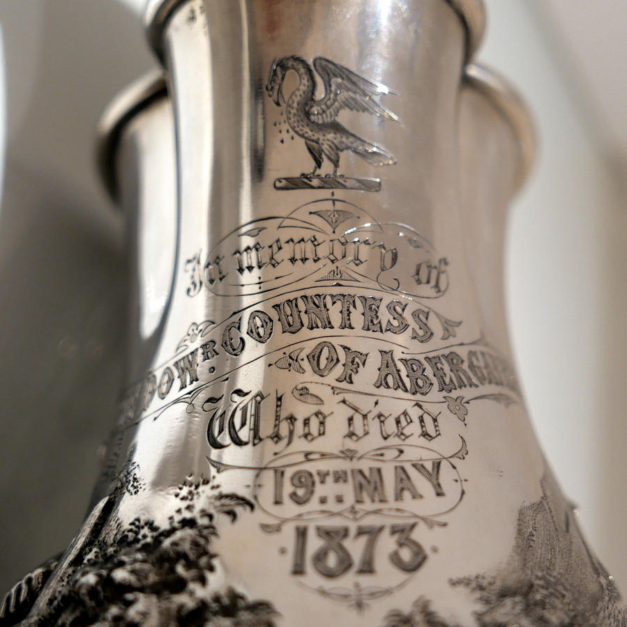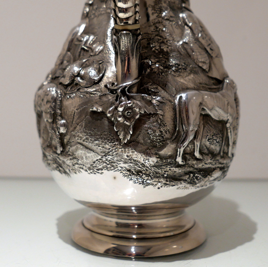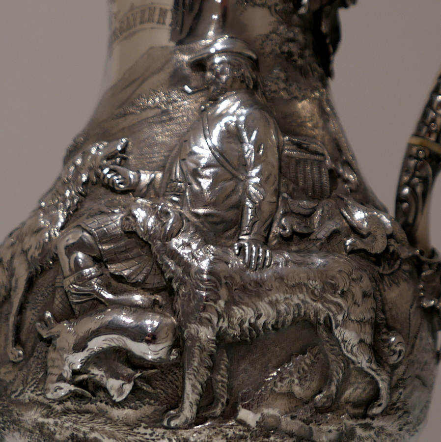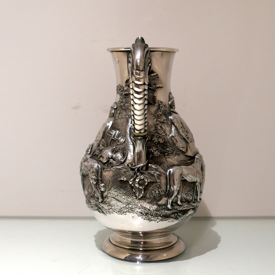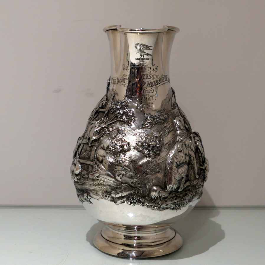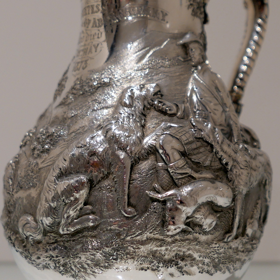 A truly fine large Victorian sterling silver jug decorated with fabulous scenes of wonderful bucolic embellishing. Â The centre front of the neck has a contemporary inscription above which sits a stylish crest.
