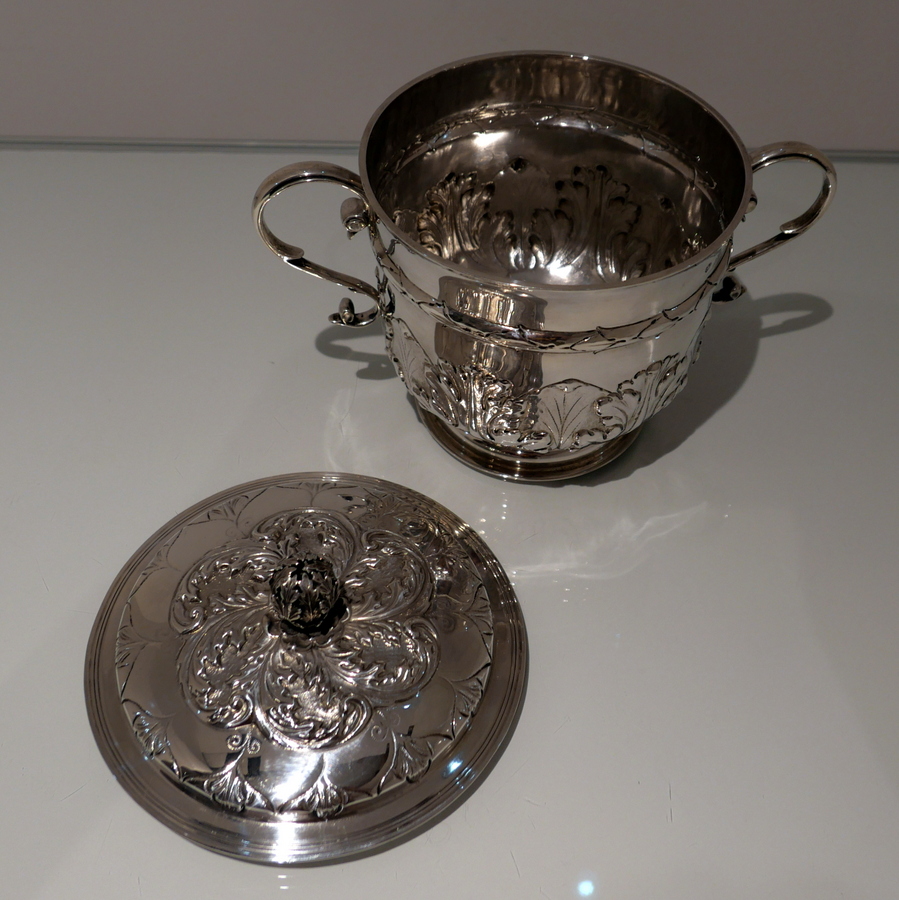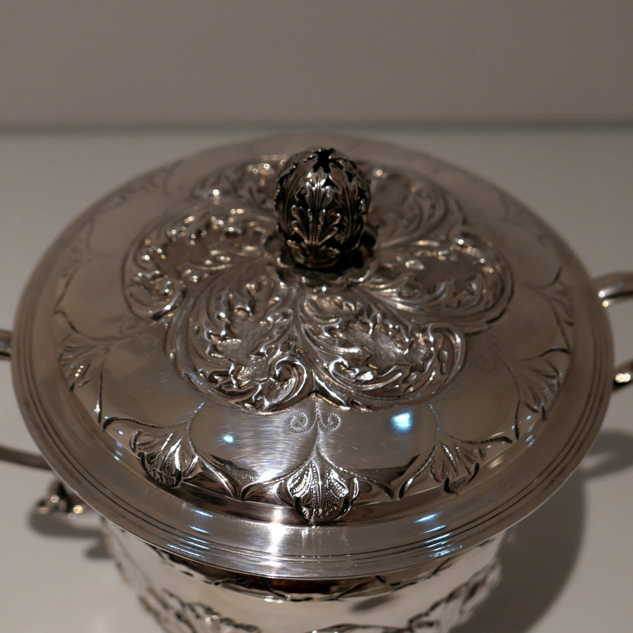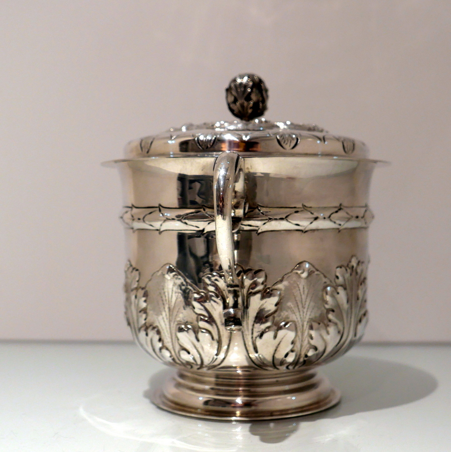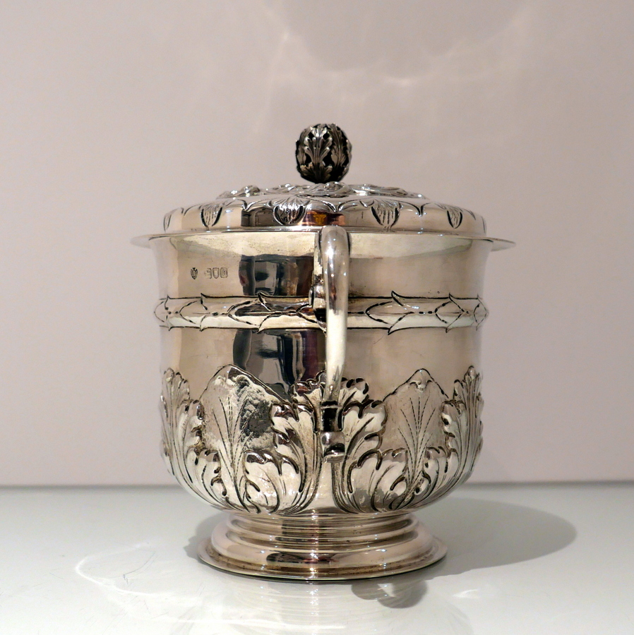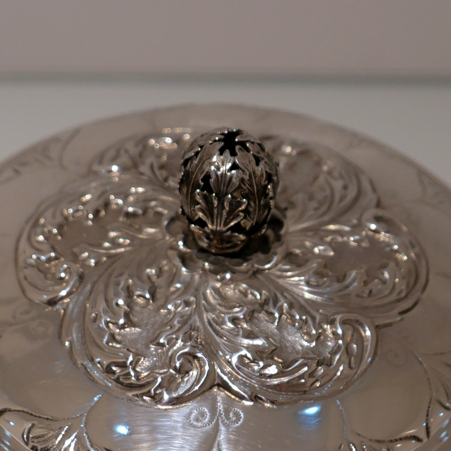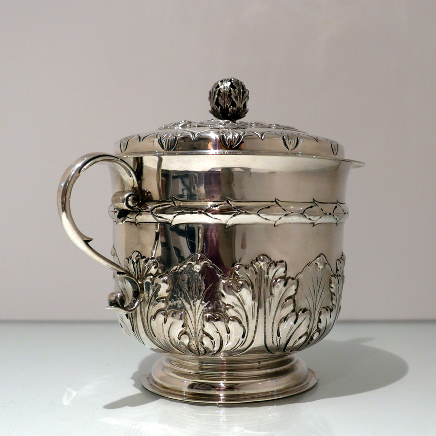 A large Victorian silver porringer and cover decorated with ornate acanthus leaf and stylish wire work scroll handles. Â The detachable ‘stepped’ lid has stylish spiral floral embossing and a fine cast naturalistic finial for highlights.