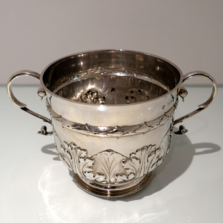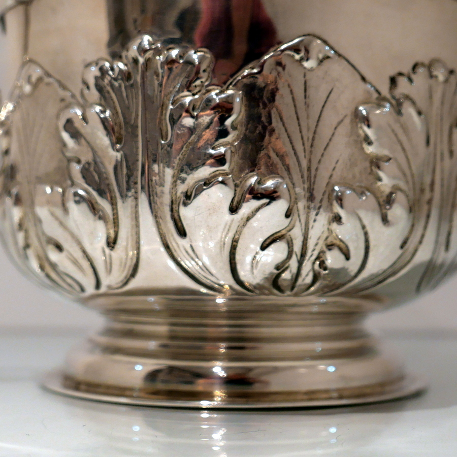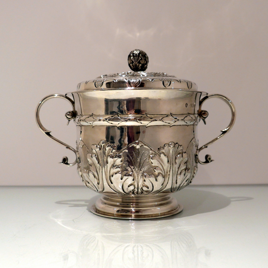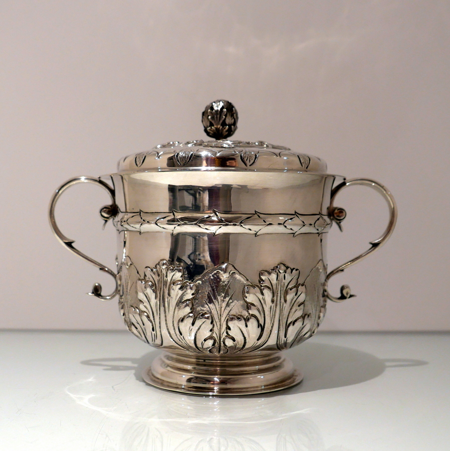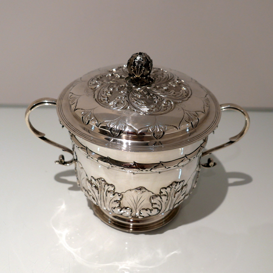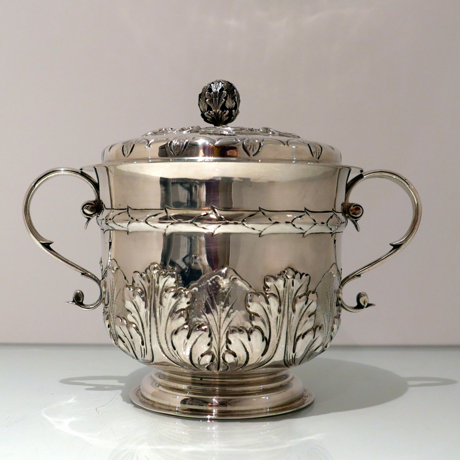 A large Victorian silver porringer and cover decorated with ornate acanthus leaf and stylish wire work scroll handles. Â The detachable ‘stepped’ lid has stylish spiral floral embossing and a fine cast naturalistic finial for highlights.