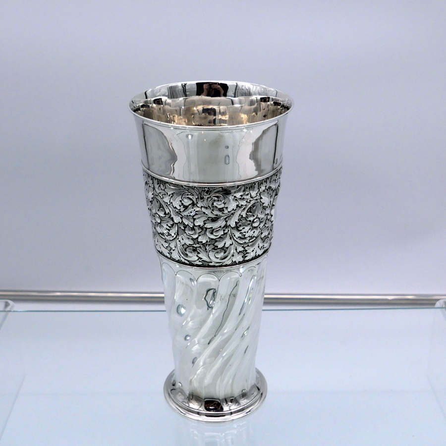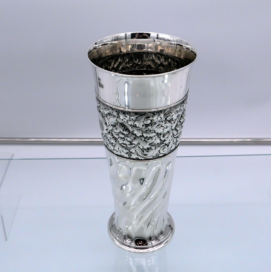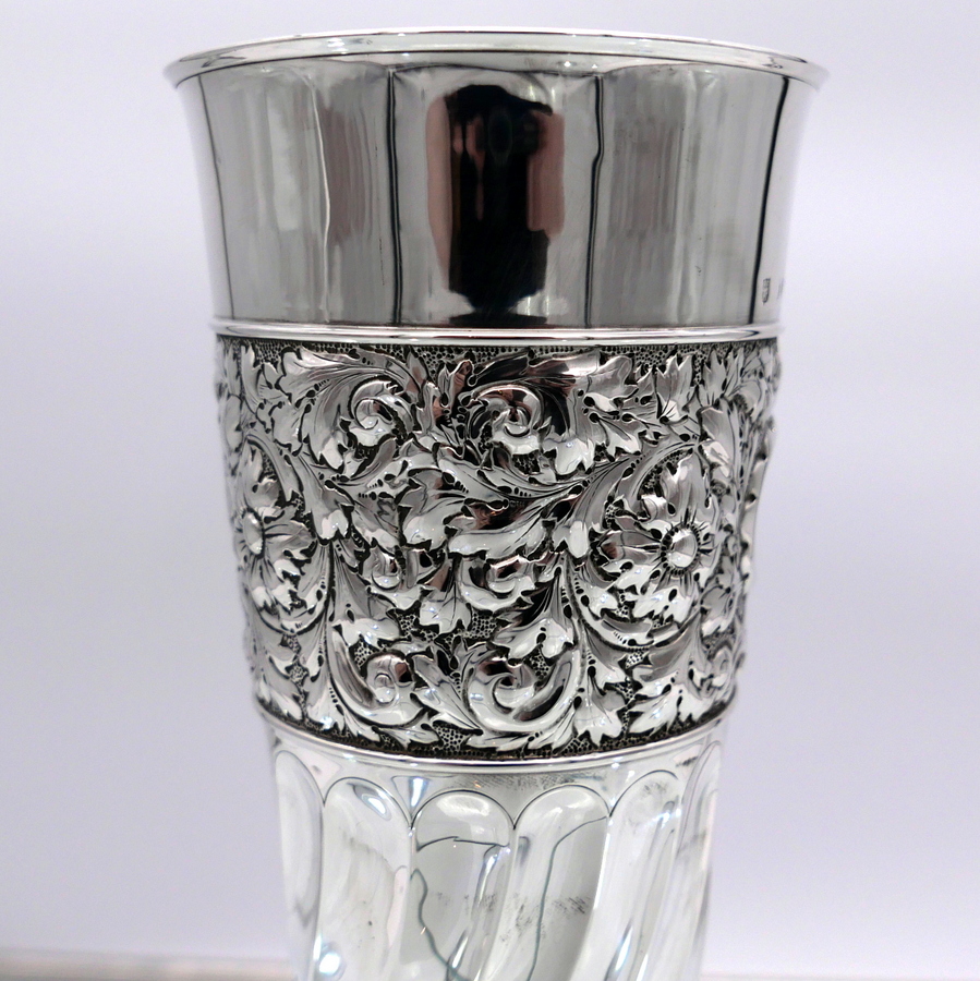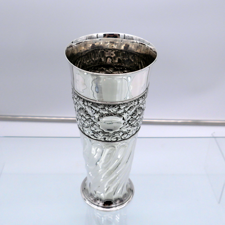 A large Victorian silver vase tapering in design with a swirl fluted base and a sumptuously ornate floral gallery in which sits a superbly creative rosette cartouche.