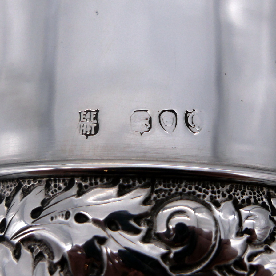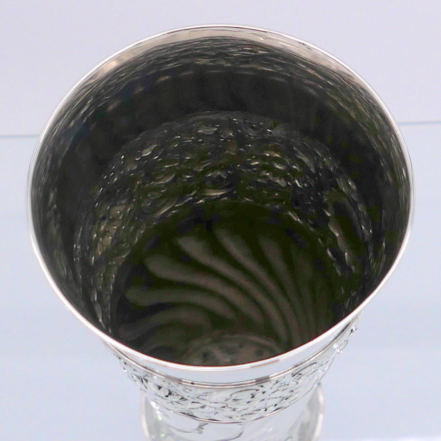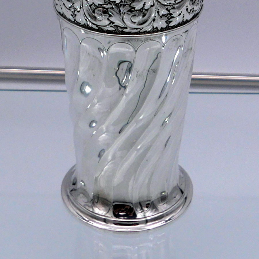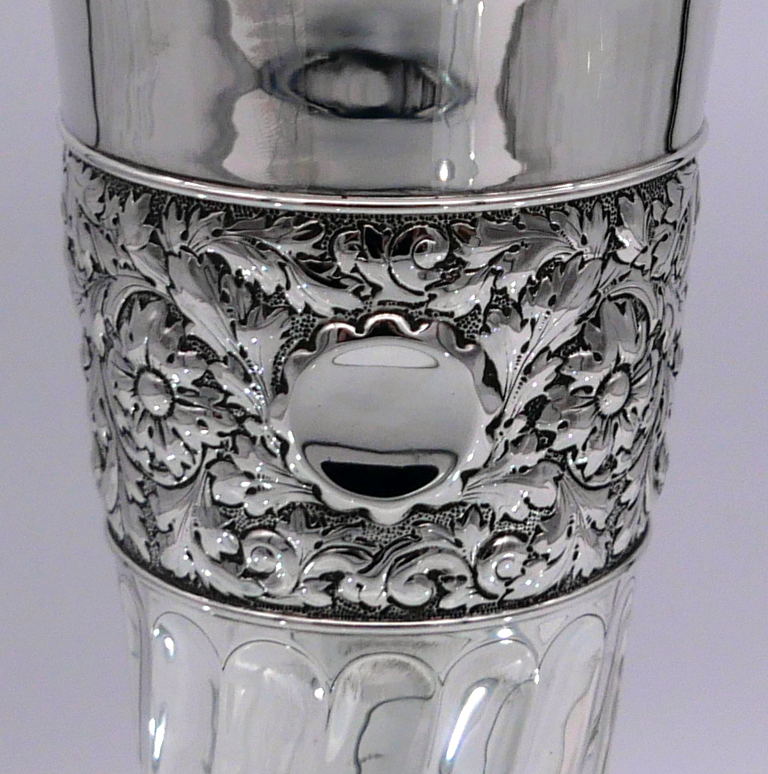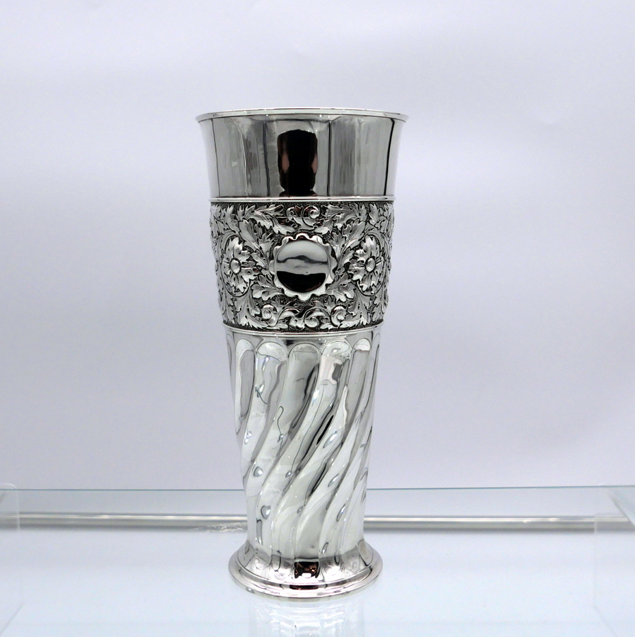 A large Victorian silver vase tapering in design with a swirl fluted base and a sumptuously ornate floral gallery in which sits a superbly creative rosette cartouche.