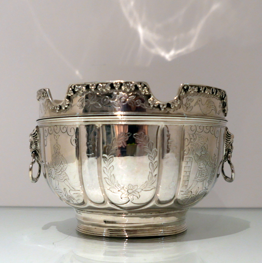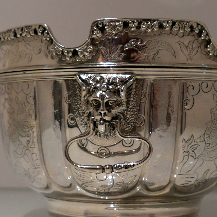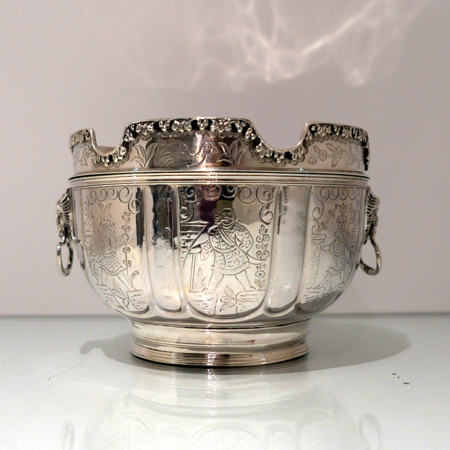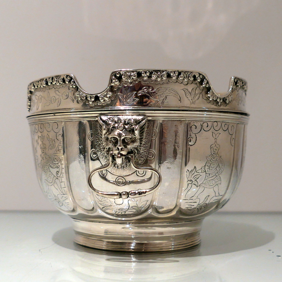 A stylish late 19th century sterling silver Monteith bowl with detachable rim. Â The centre front is elegantly hand engraved with a ‘wreath’ cartouche and the surrounding panels have beautiful chinoiserie workmanship. Â The bowl has creative designed hinged lion mask handles and the upper rim has stylish notches with foliate engraving for highlights.