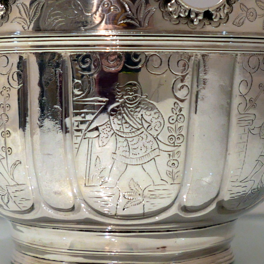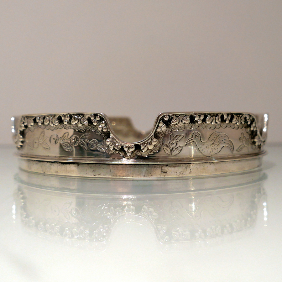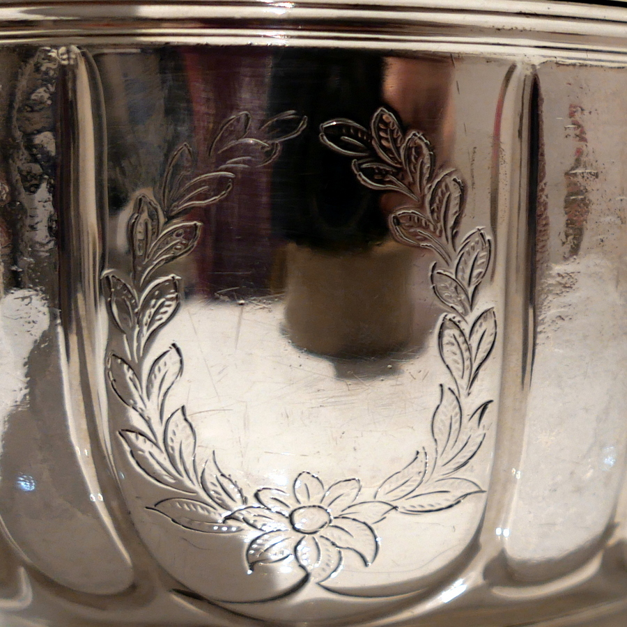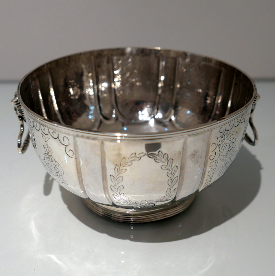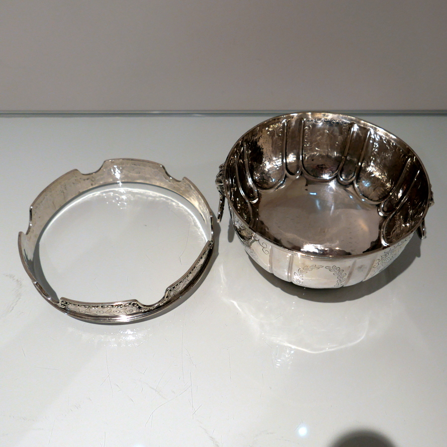 A stylish late 19th century sterling silver Monteith bowl with detachable rim. Â The centre front is elegantly hand engraved with a ‘wreath’ cartouche and the surrounding panels have beautiful chinoiserie workmanship. Â The bowl has creative designed hinged lion mask handles and the upper rim has stylish notches with foliate engraving for highlights.