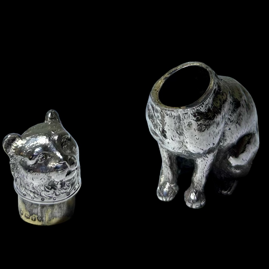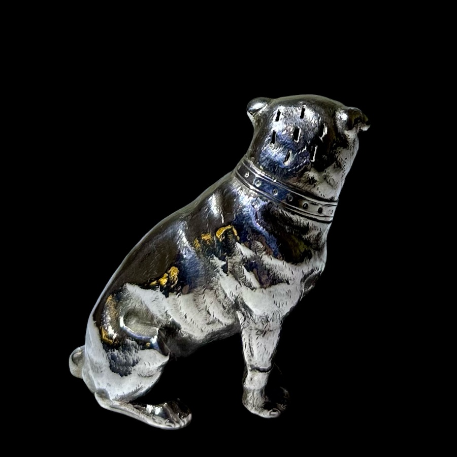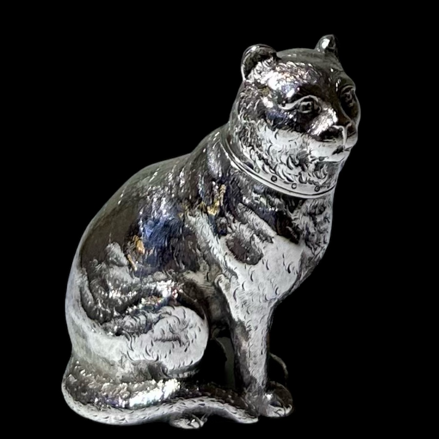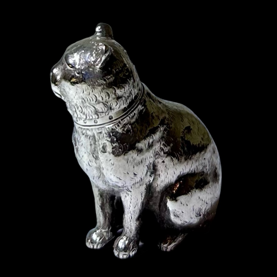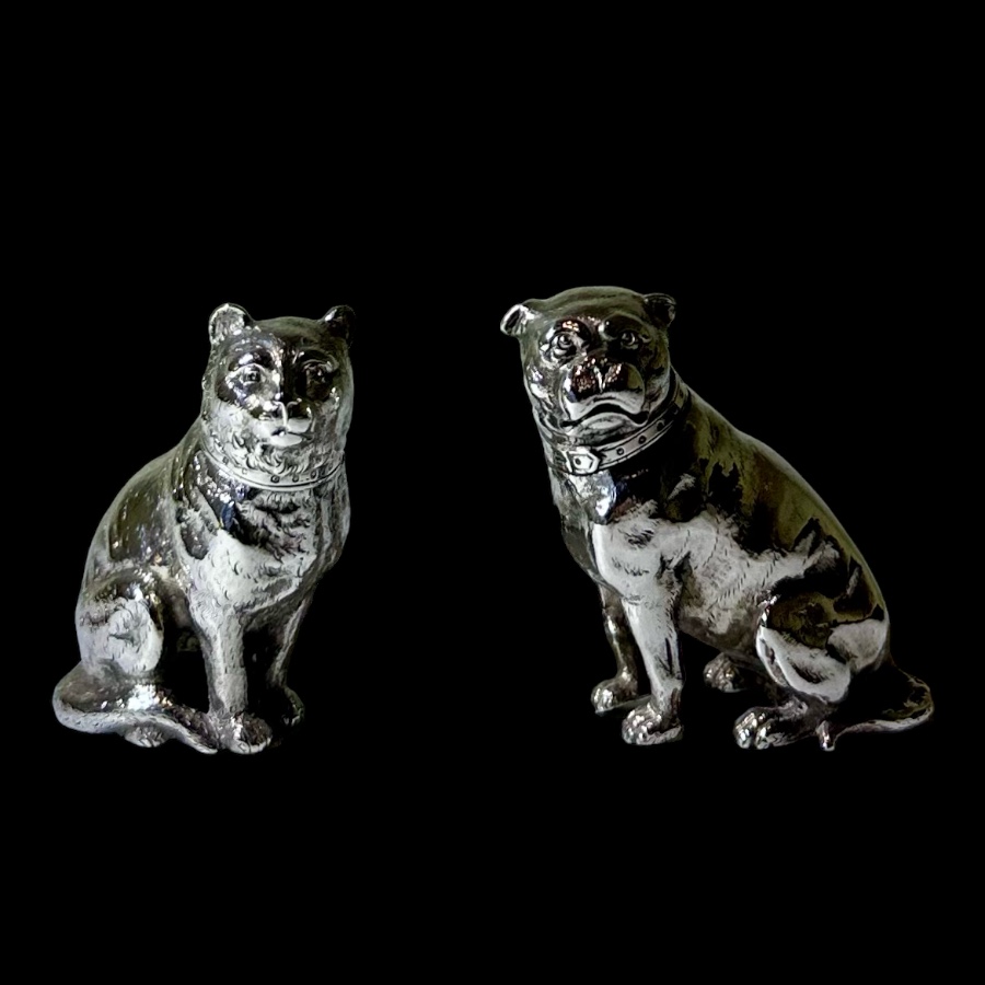 Delightful pair of antique silver cat and dog peppers designed with outstanding life like qualities. The heads are detachable and the hallmarks are thoughfully struck on the curling tails.
