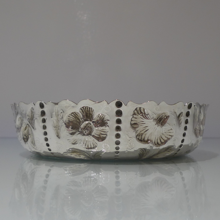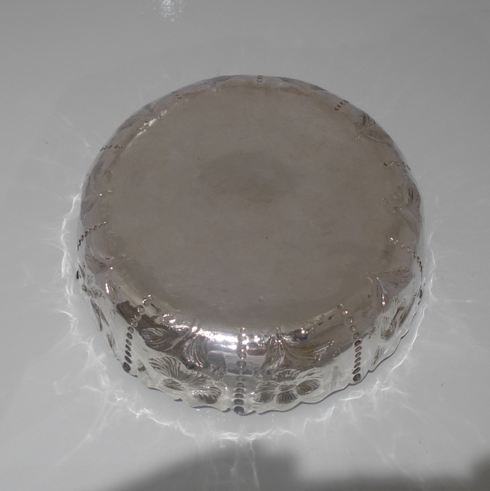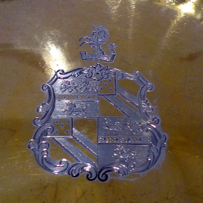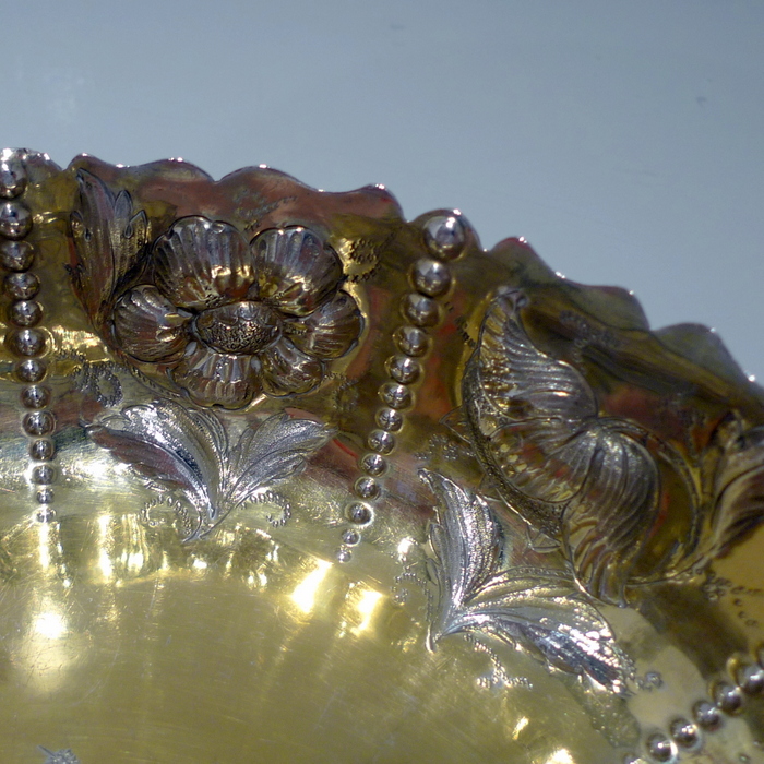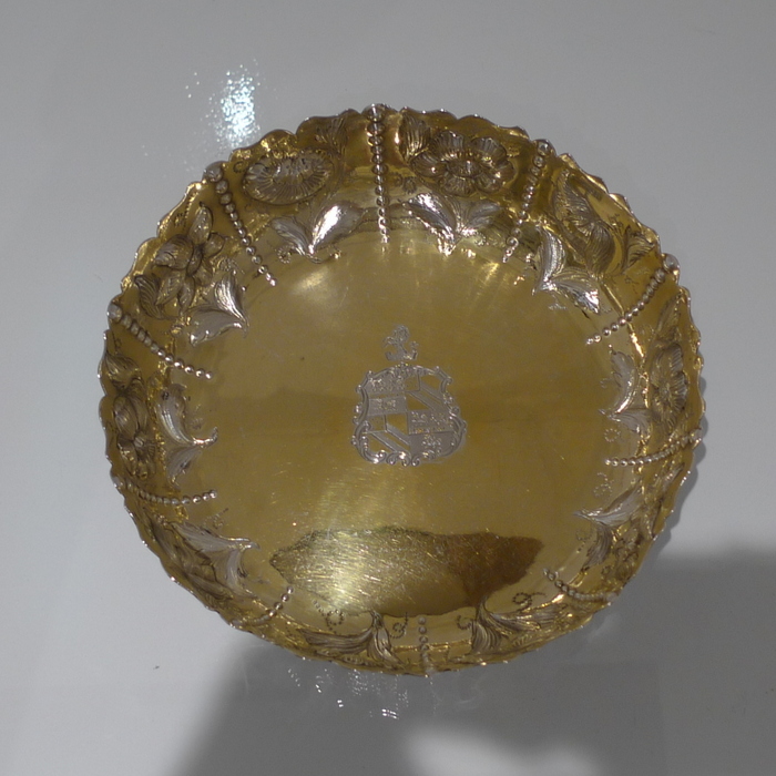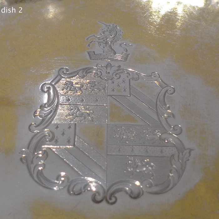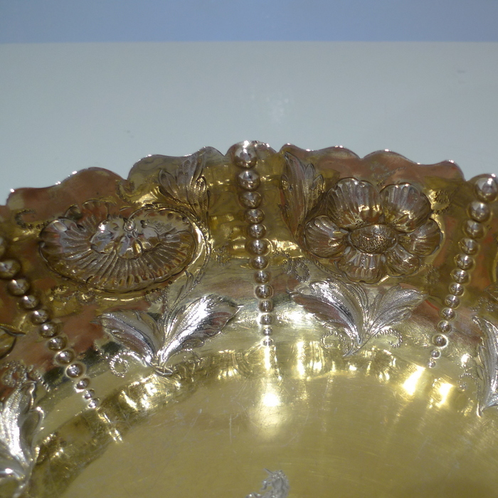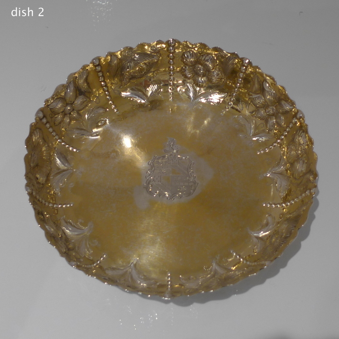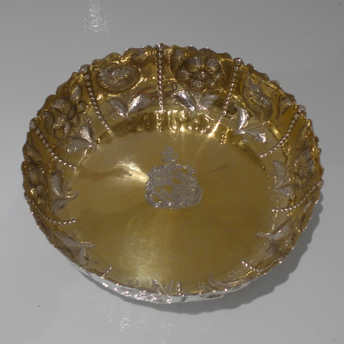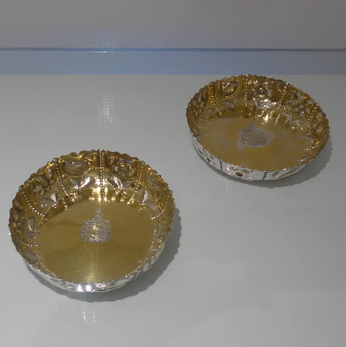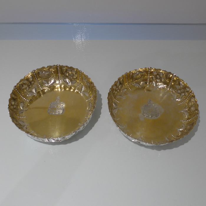 A rare pair of large circular shaped edged Victorian silver dishes decorated with elegant floral chasing which alternates between flowing bead decoration for highlights. Â The insides are beautifully gilt and the dishes have contemporary armorials (arms shows the marshalled arms of Wilkinson, orignally of Harpley and Kyo, county Durham) for importance.