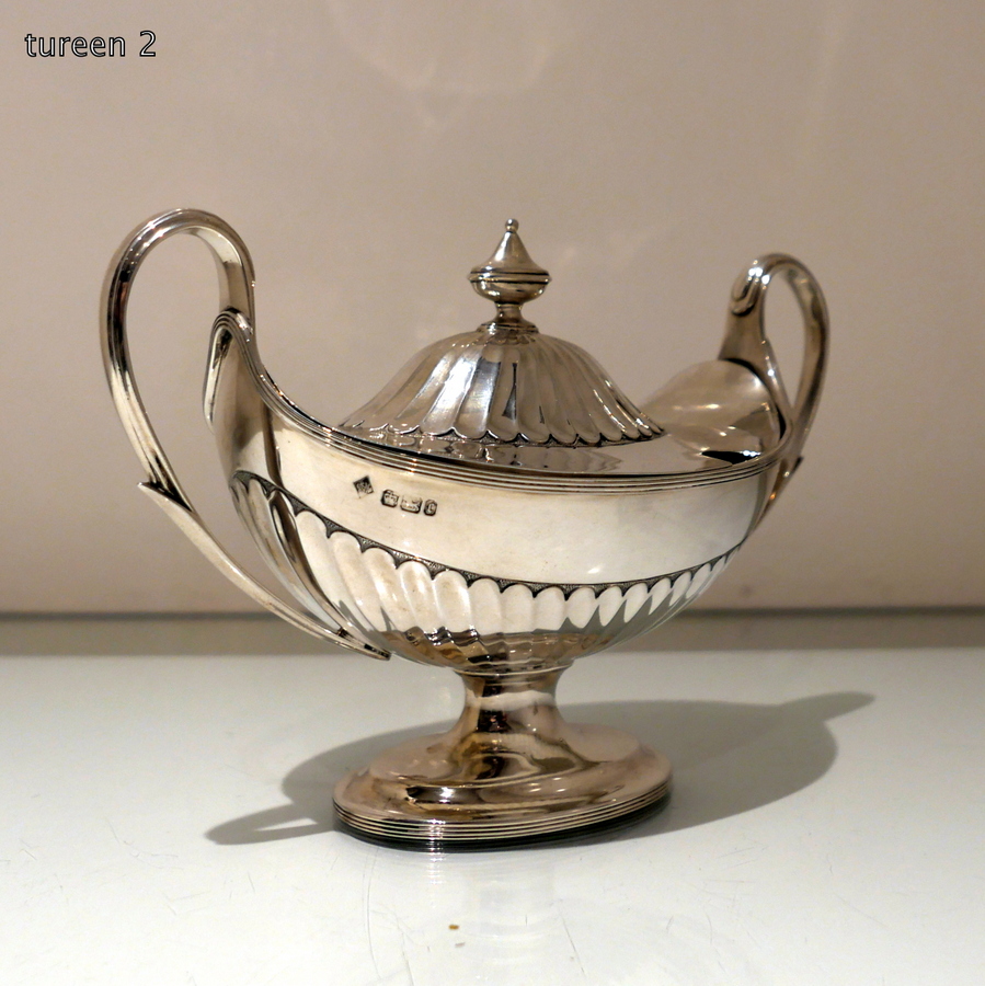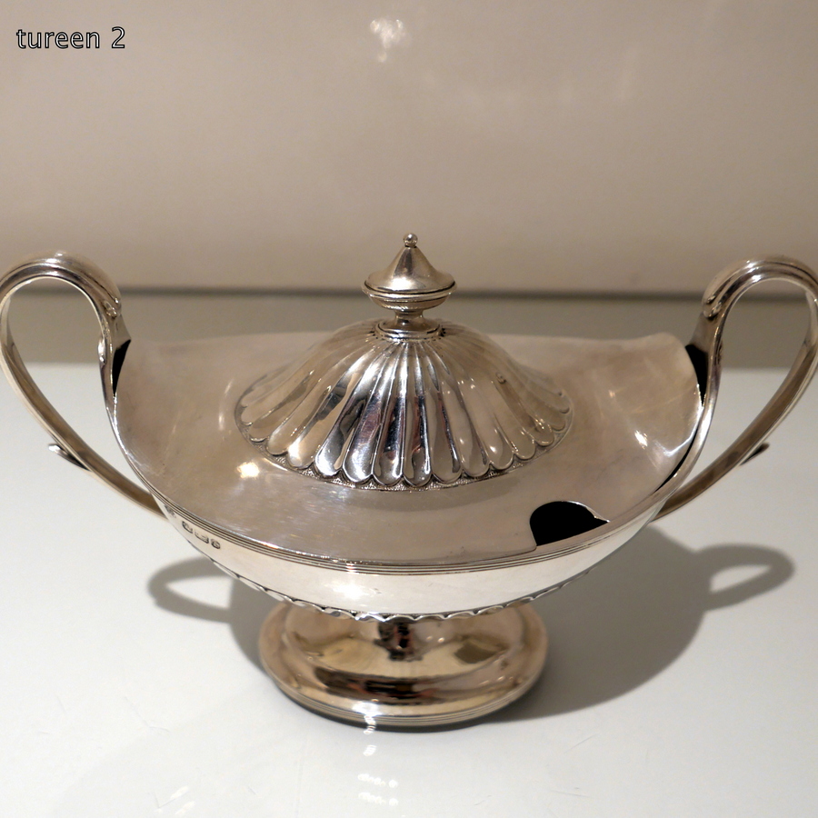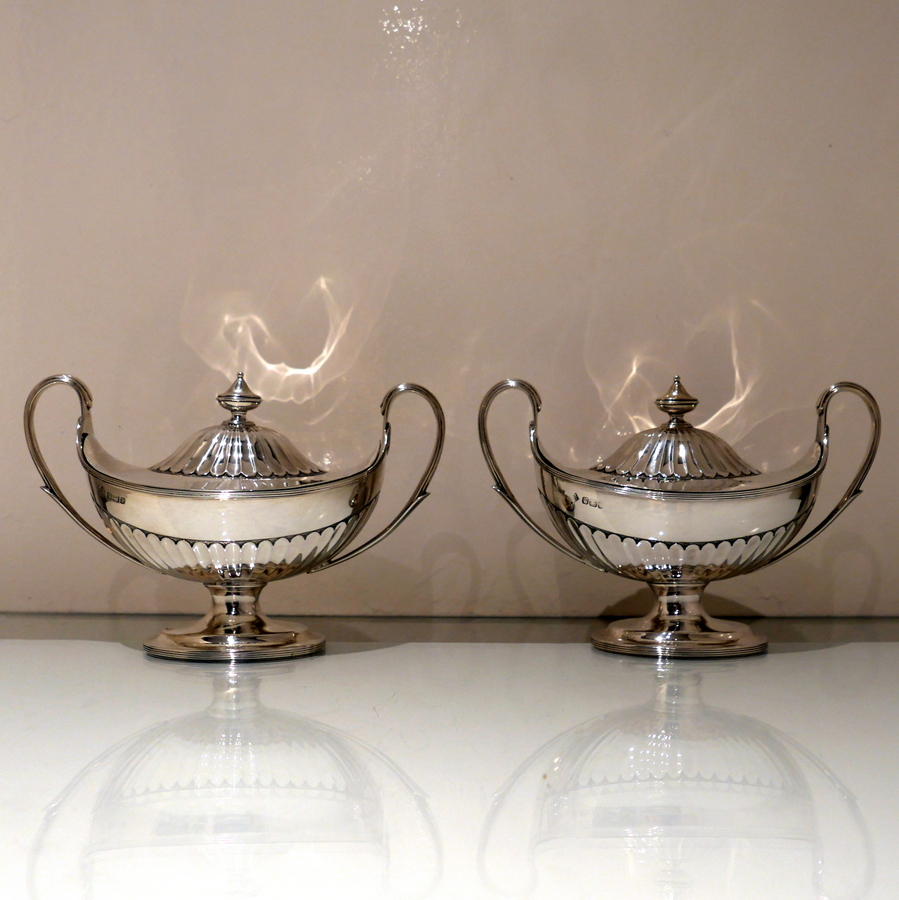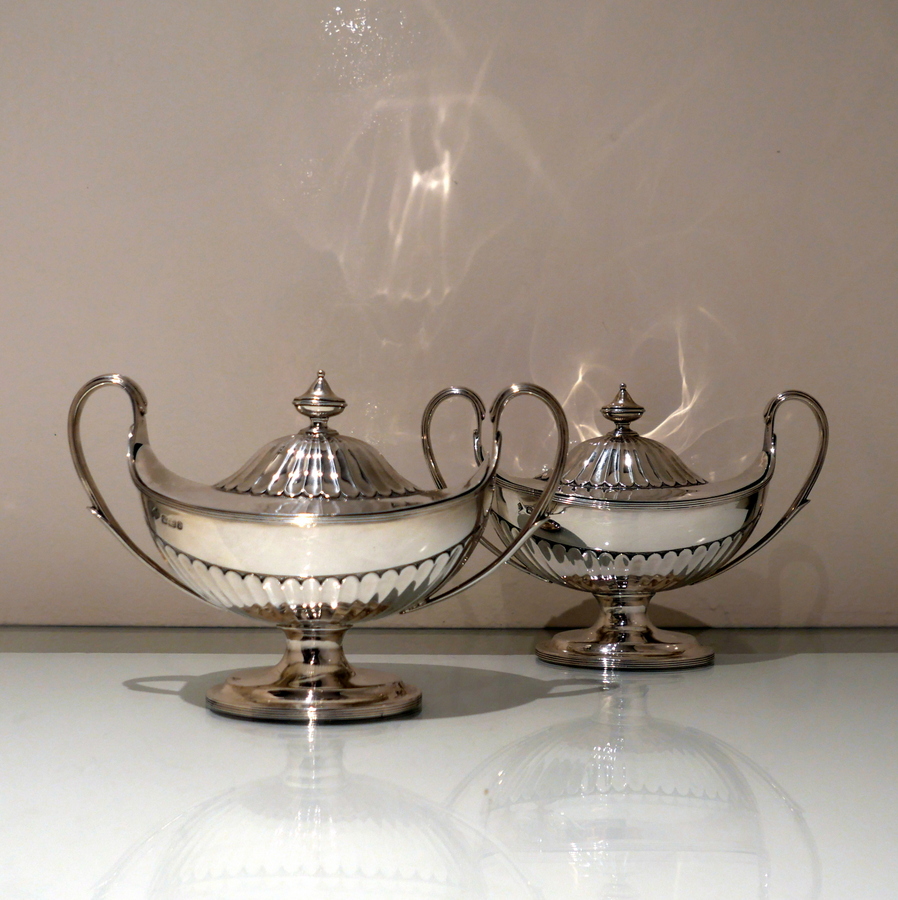 A stunning and incredible quality pair of late 19th century “boat” shaped half fluted sauce tureens and covers standing on elegant oval pedestal feet and having stylish scroll handles.