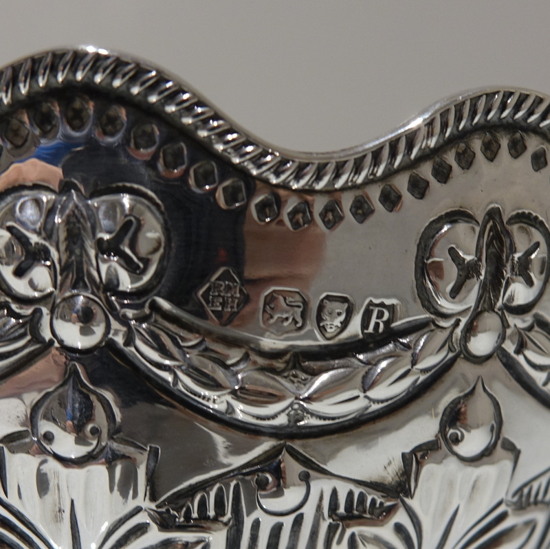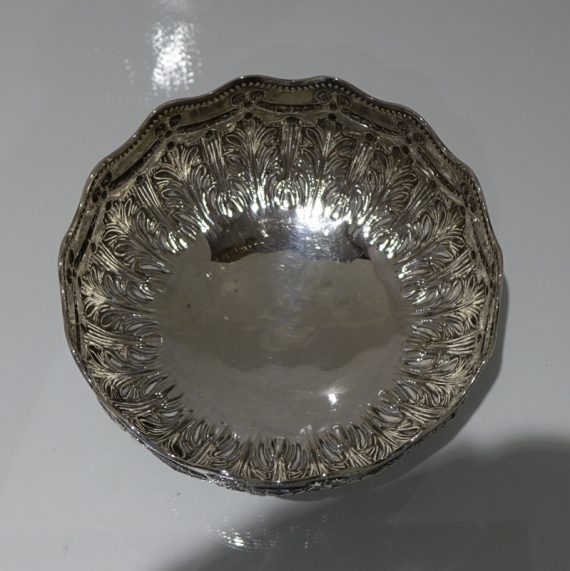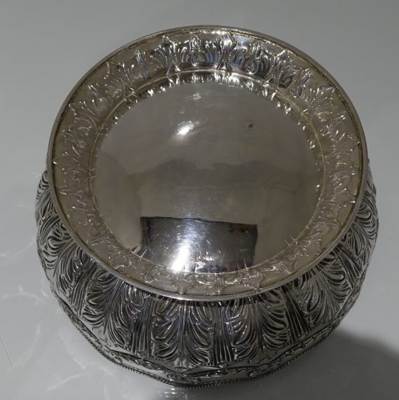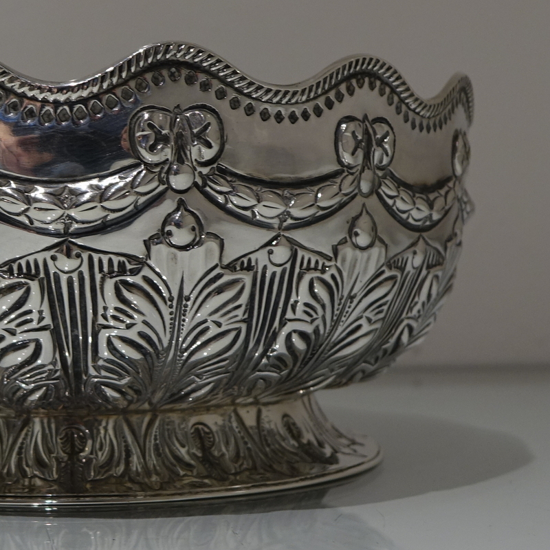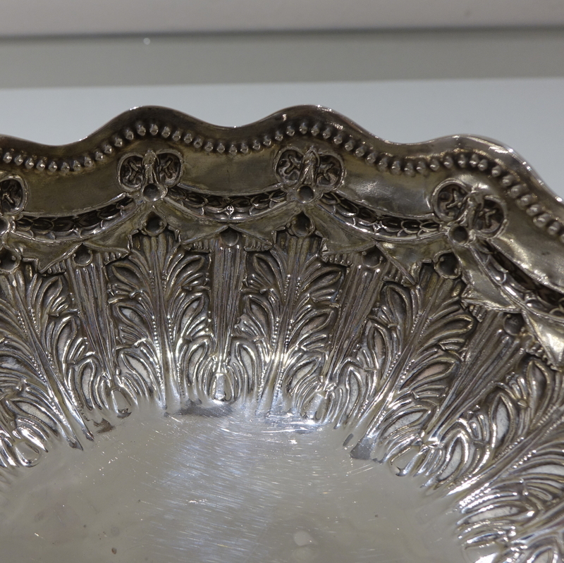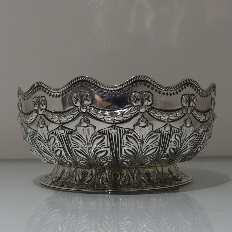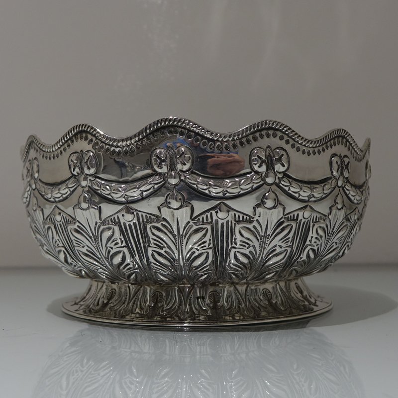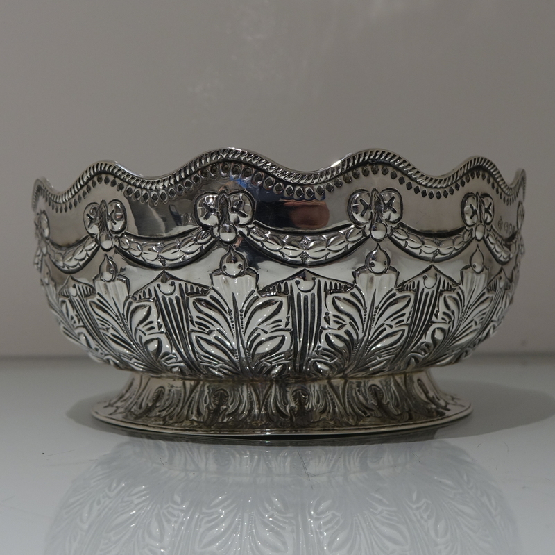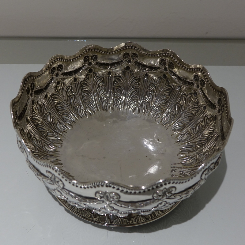 A beautiful and extremely stylish mid-sized circular Victorian bowl decorated with elegant foliage designs to the lower body and ribbons and tied bows sitting beneath a wavy edged gadroon rim. Â The bowl sits on an ornate circular spreading foot.