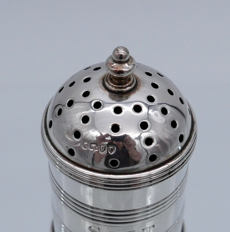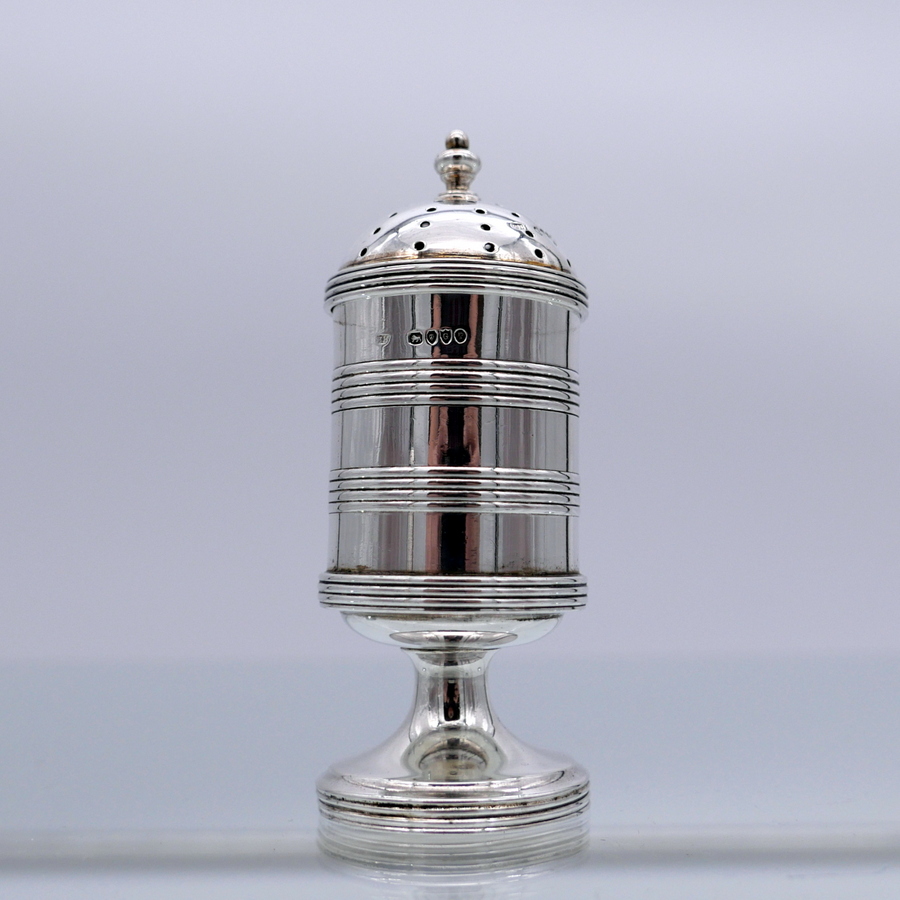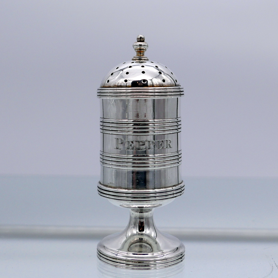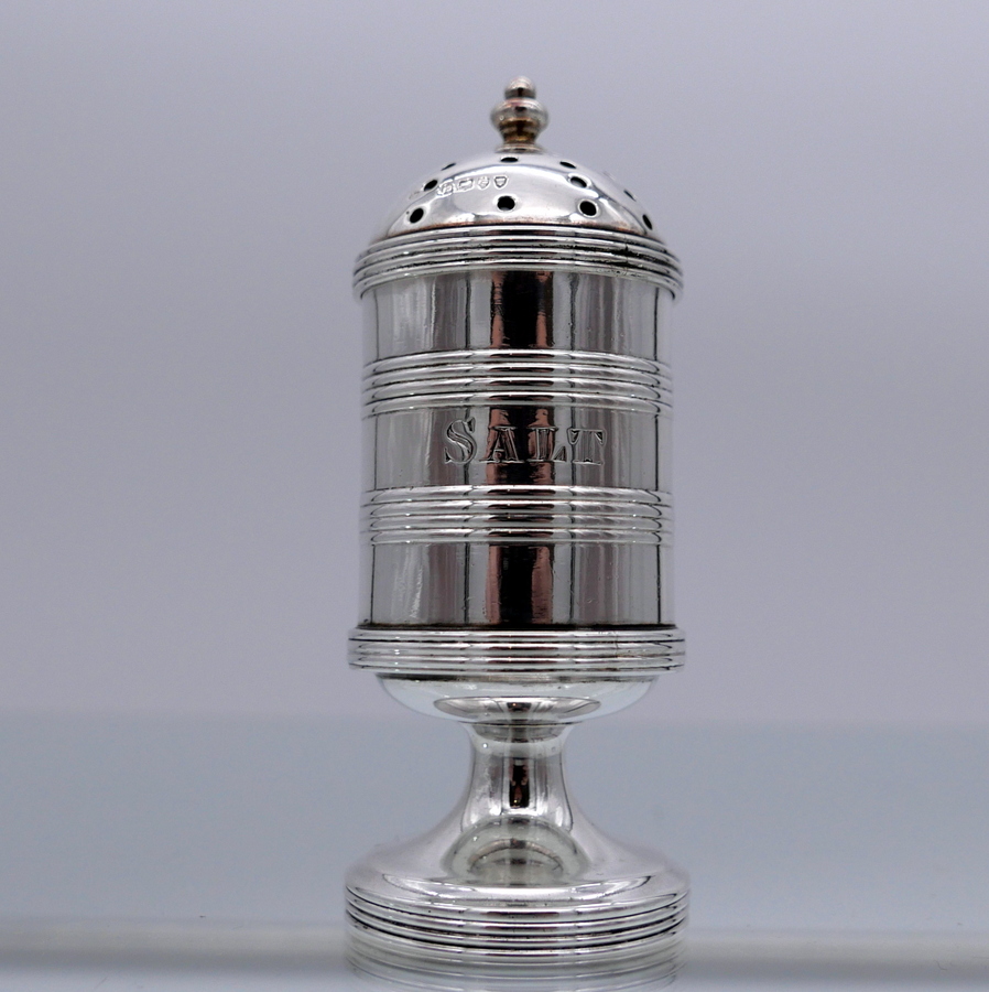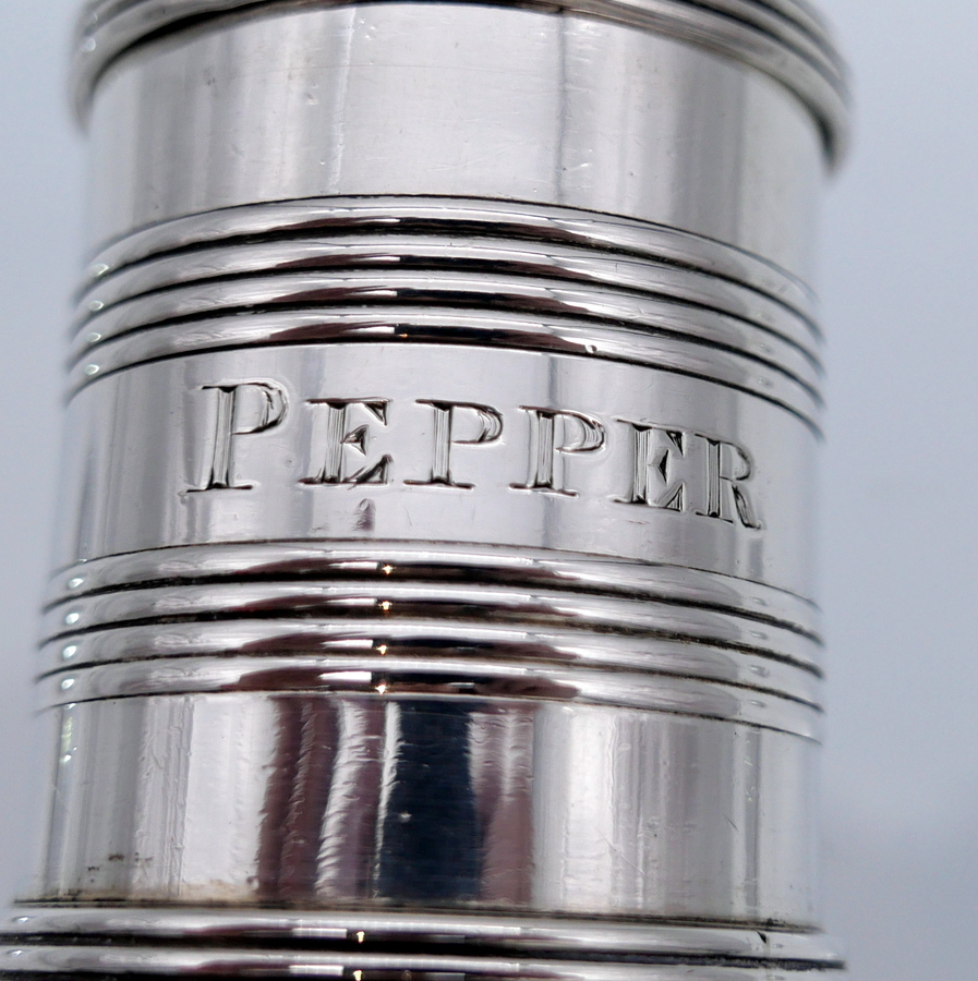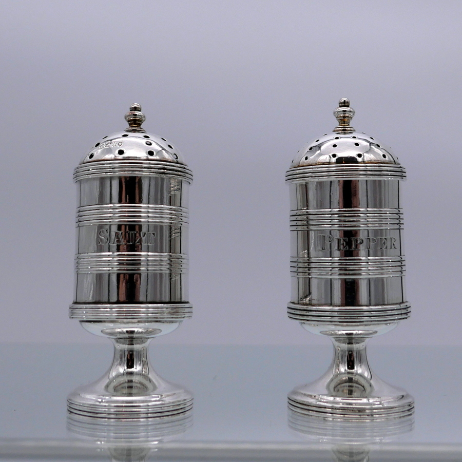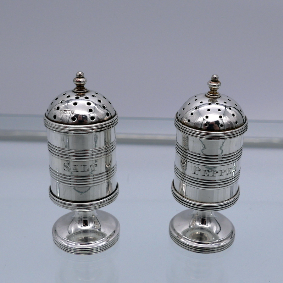 A wonderful pair of Victorian silver salt and pepper pots (Indian colonial style) designed with elegant strap work cylindrical bodies and impressive raised pedestal circular feet.