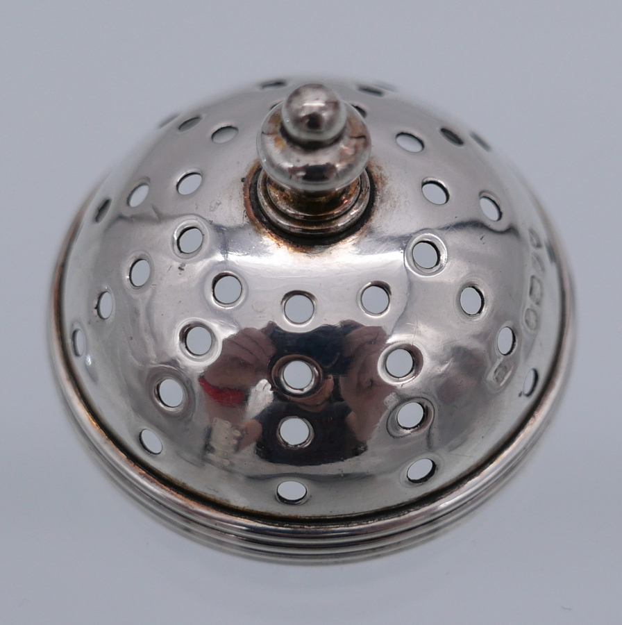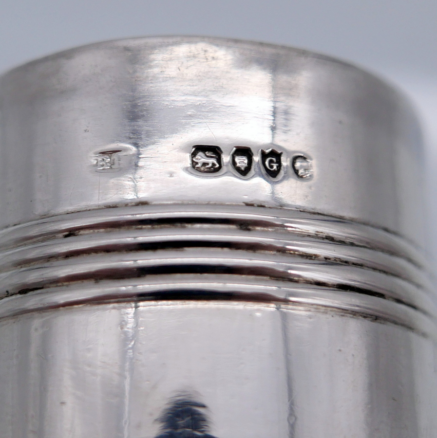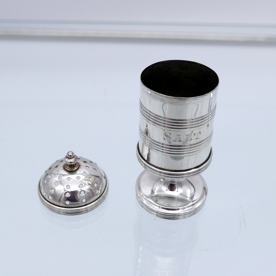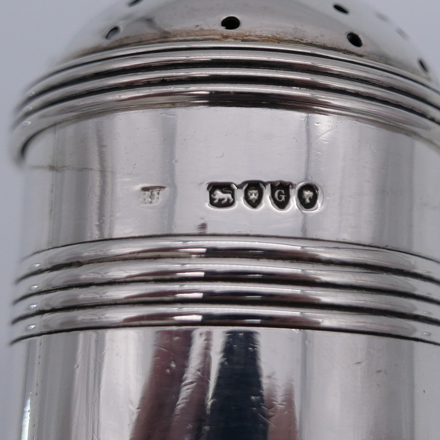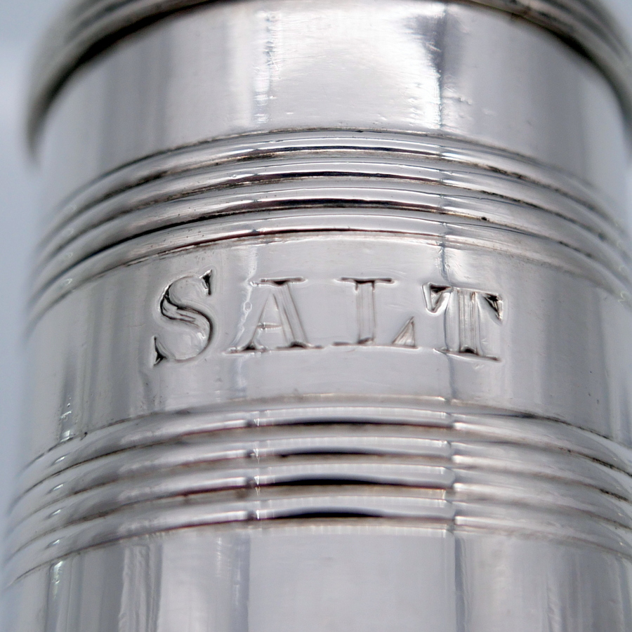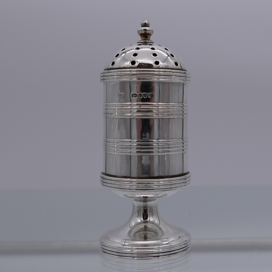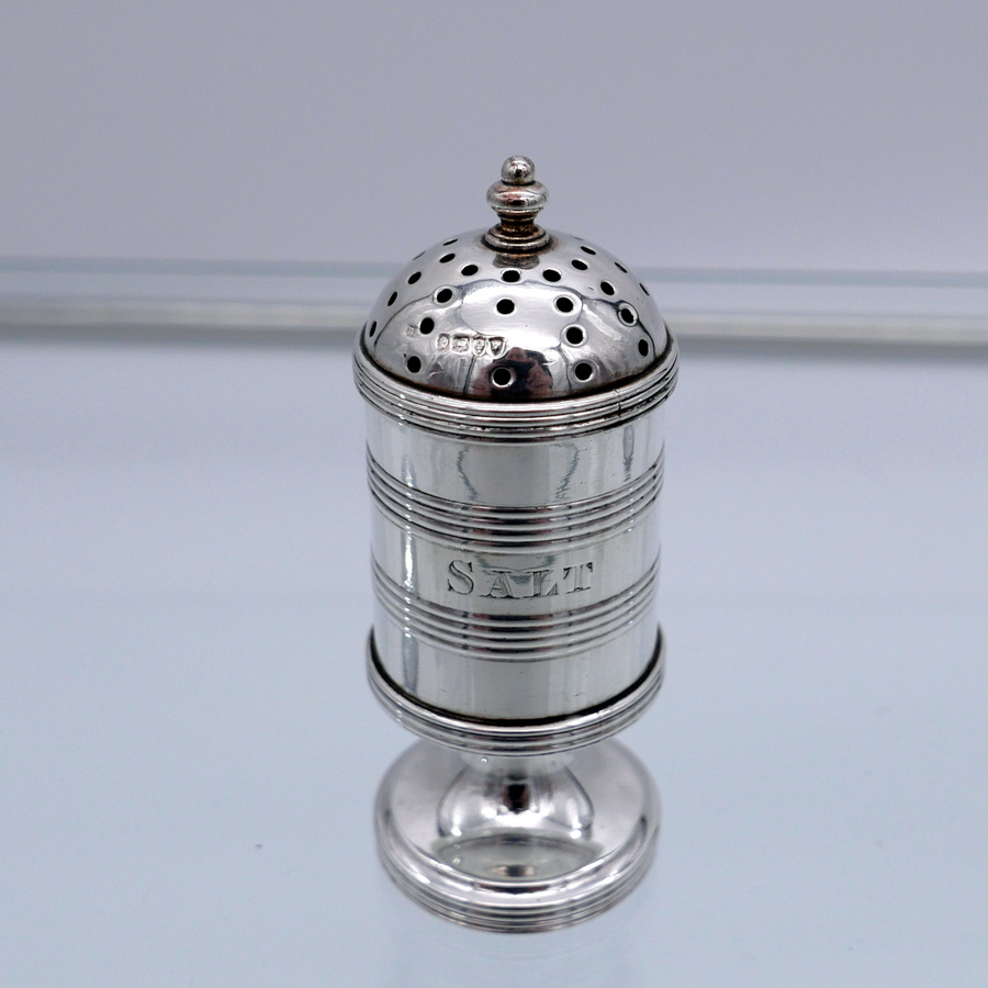 A wonderful pair of Victorian silver salt and pepper pots (Indian colonial style) designed with elegant strap work cylindrical bodies and impressive raised pedestal circular feet.