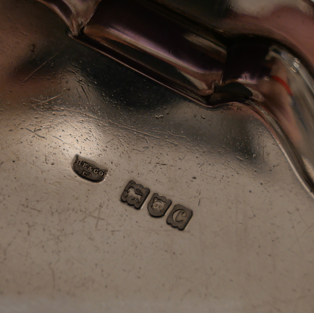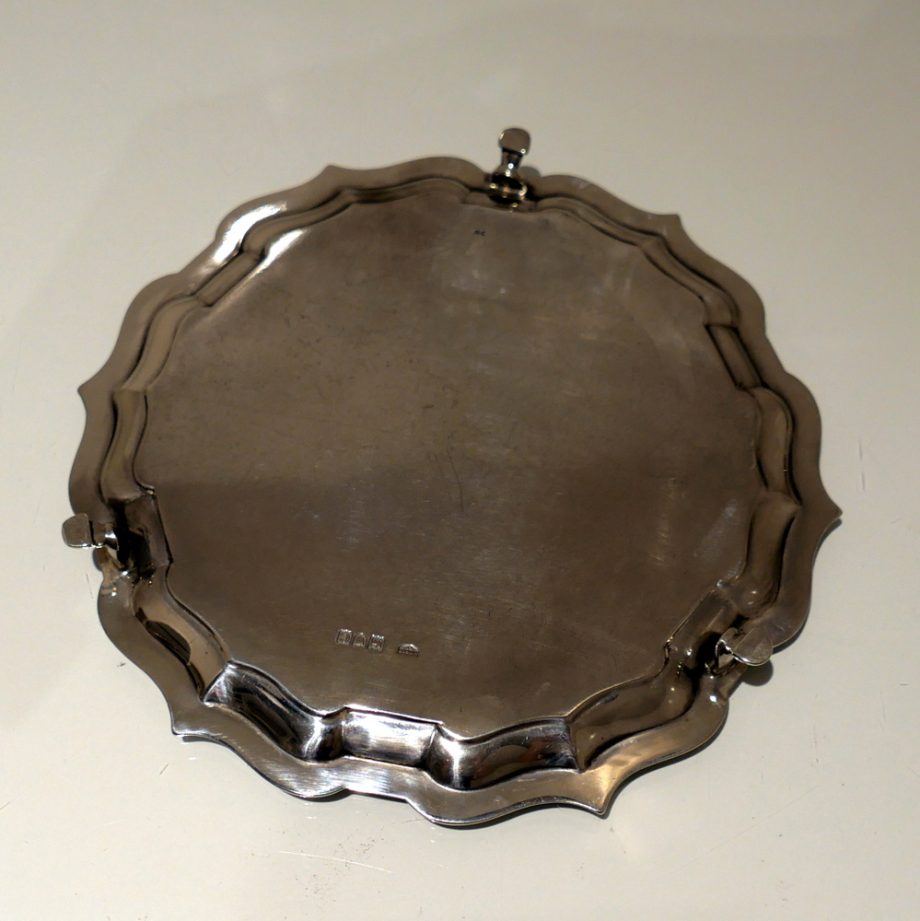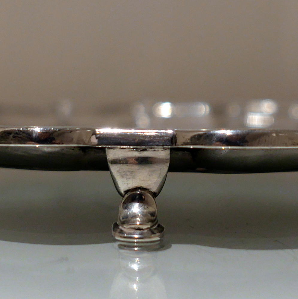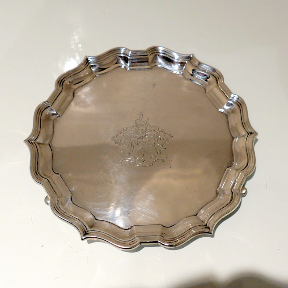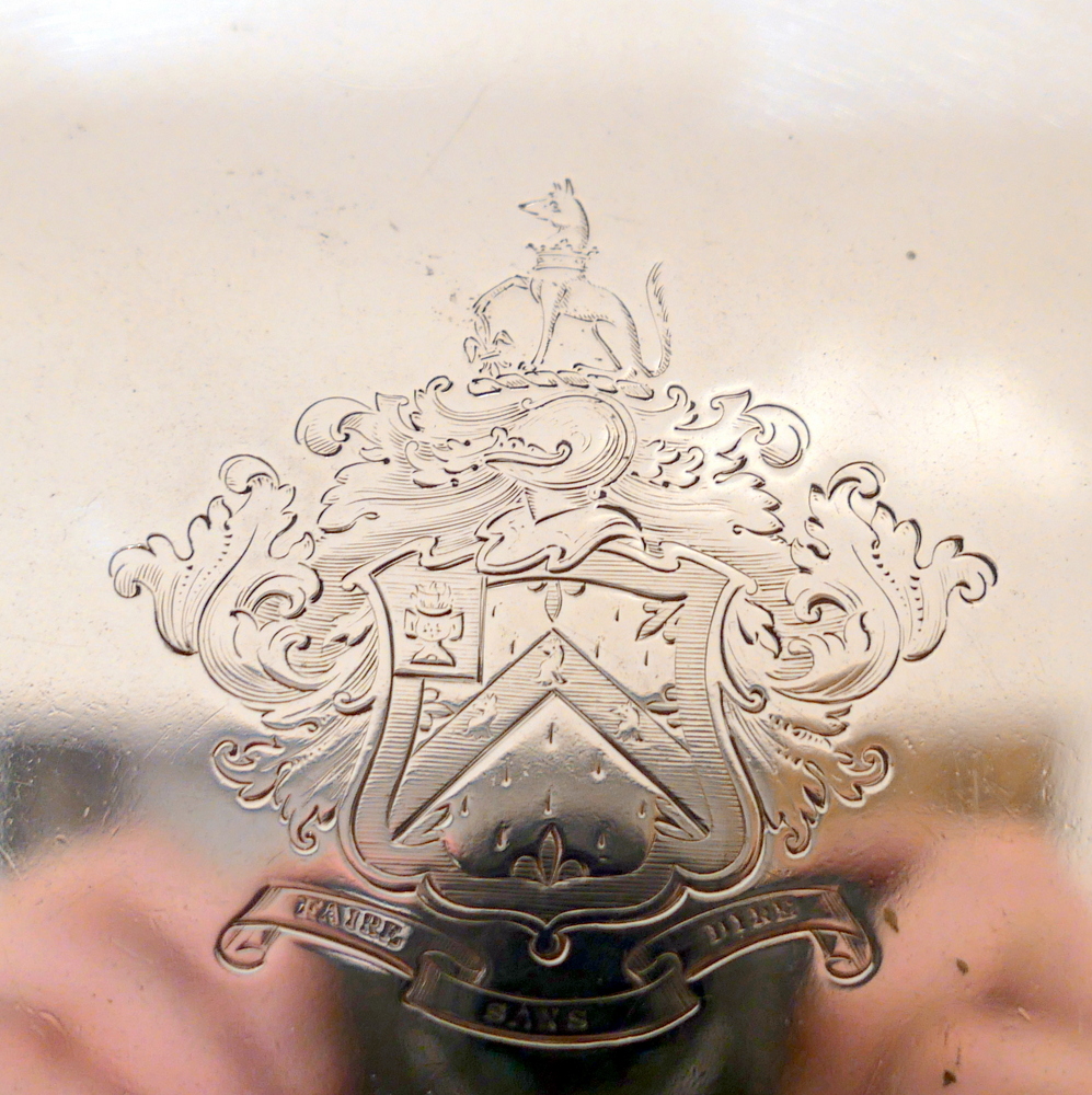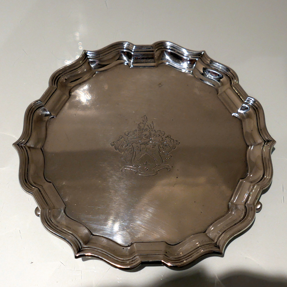 A beautiful late Victorian sterling silver salver plain, formed in design and sitting on three stylish peg hoofed feet. Â The centre front has a stylish contemporary armorial for importance.