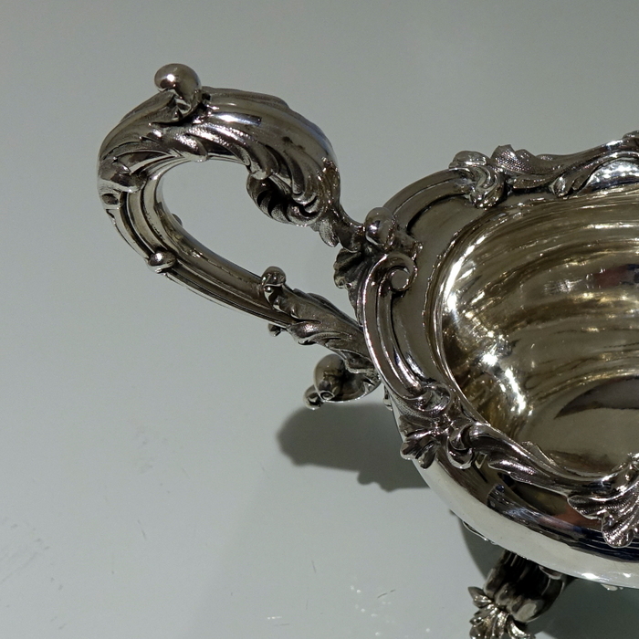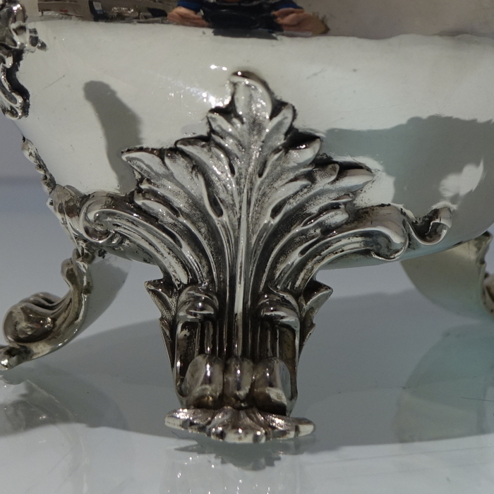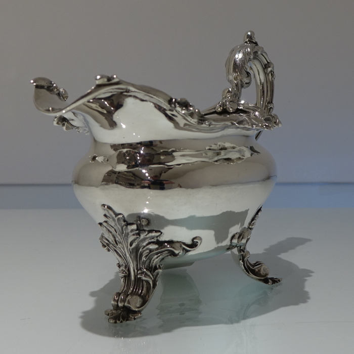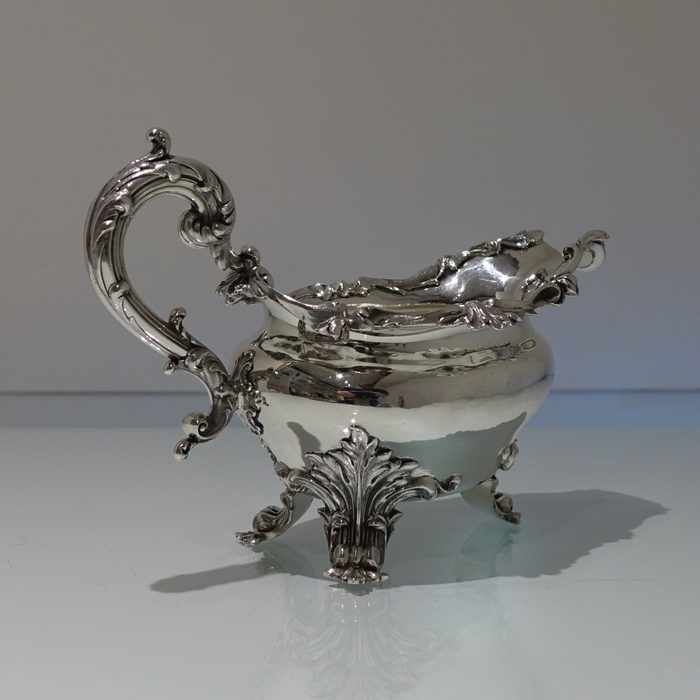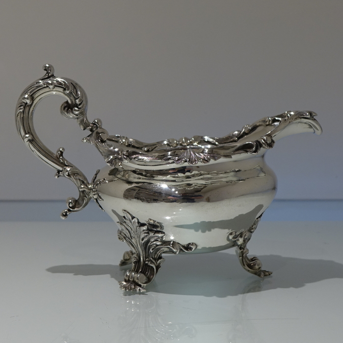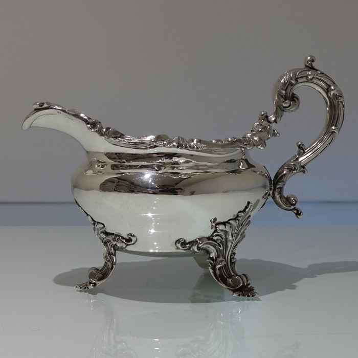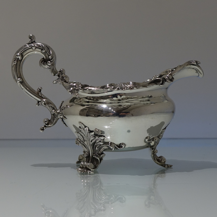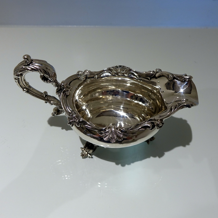 A very elegant 19th century oval shape border sauceboat decorated with stylish acanthus leaf floral workmanship. Â The handle is scroll design and the sauceboat sits on three majestic feet.